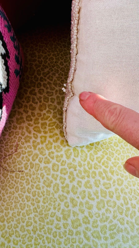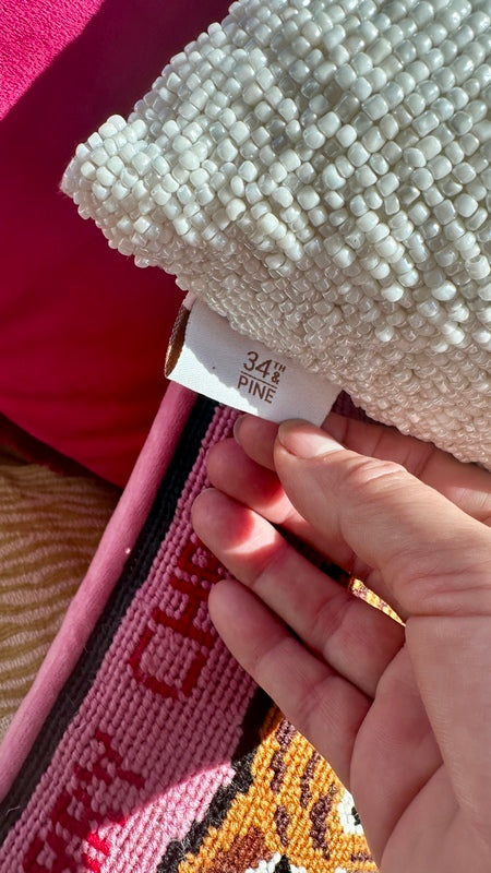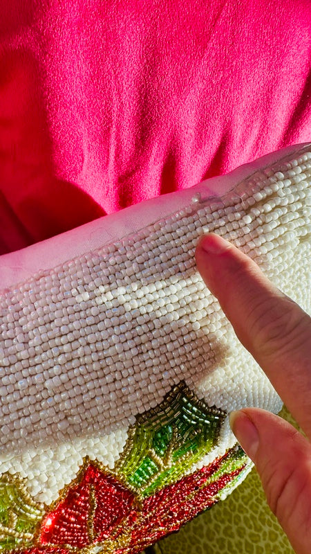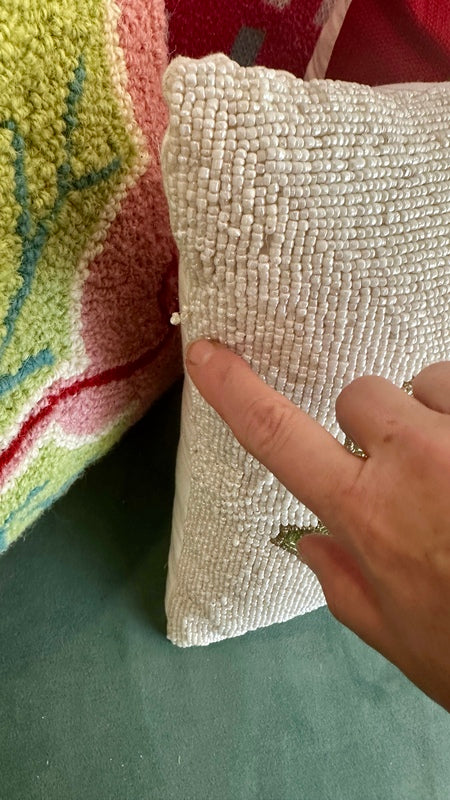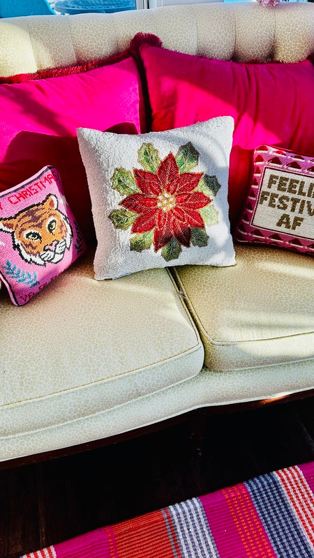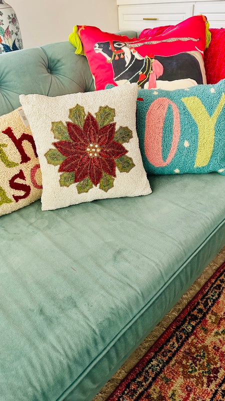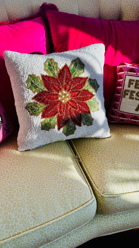 Add a festive touch to your home with our stunning Beaded Poinsettia Pillow. Featuring intricate bead work and vibrant poinsettia design, this decorative pillow combines elegance and holiday charm. Perfect for accenting your living space or gifting to someone special, it’s a timeless piece that celebrates the beauty of the season. There are a couple spots where the beads are pulled.