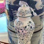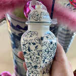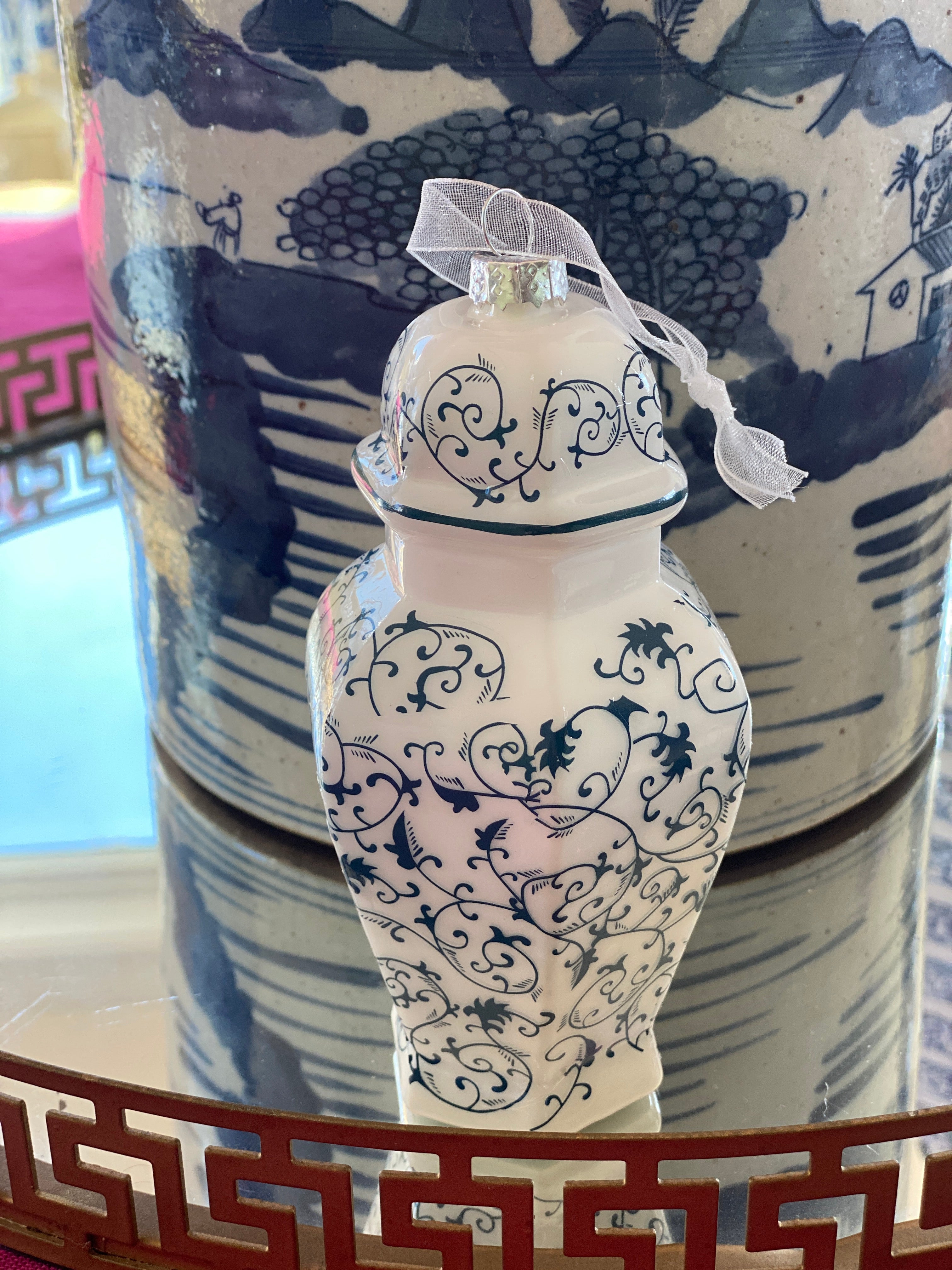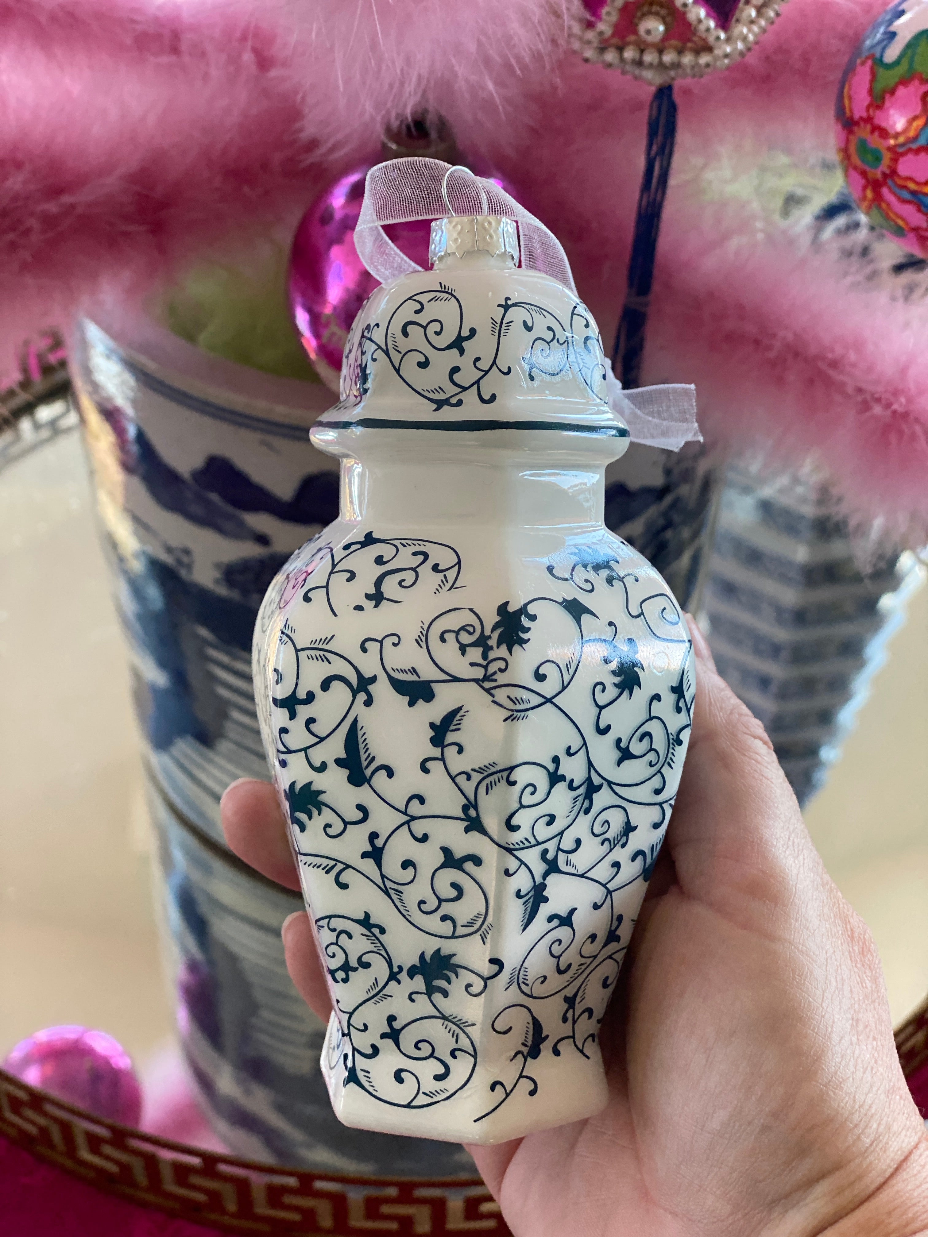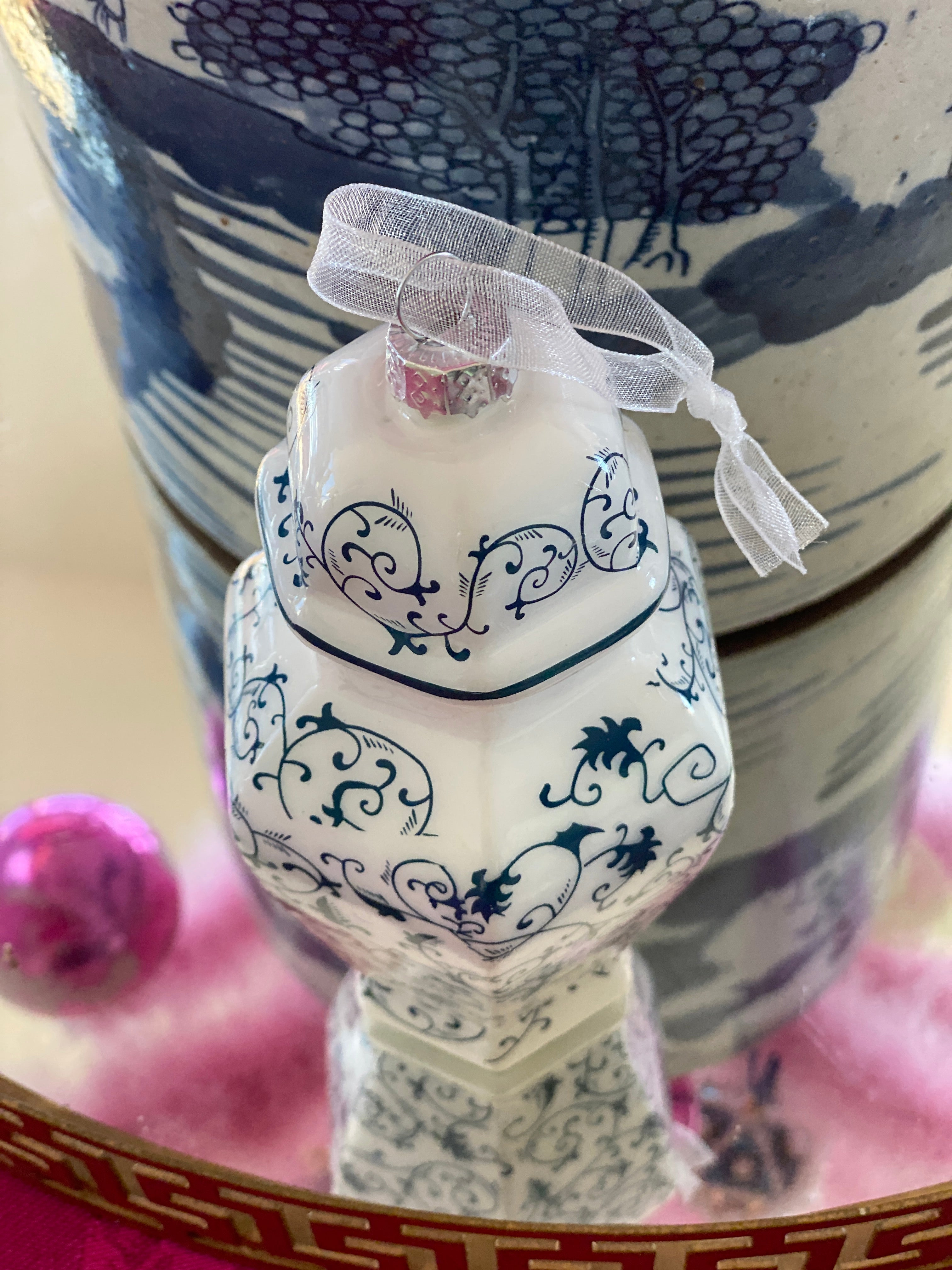 Great chinoiserie blue and white ginger jar ornament with white ribbon, ready to hang on your grand millennial Christmas tree. Decorative glass ornament also perfect for a table decoration or present topper. See pictures for description as they are part of the description.