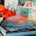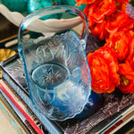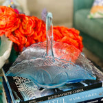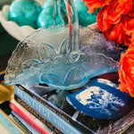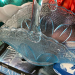 I adore this Blue depression glass basket. Fresh flowers would look beautiful laying in it. Fill with lemons and limes for the bar. Add it to a tablescape or fill with silverware rolled in pretty napkins on a buffet. See picture details as they are part of the description.
