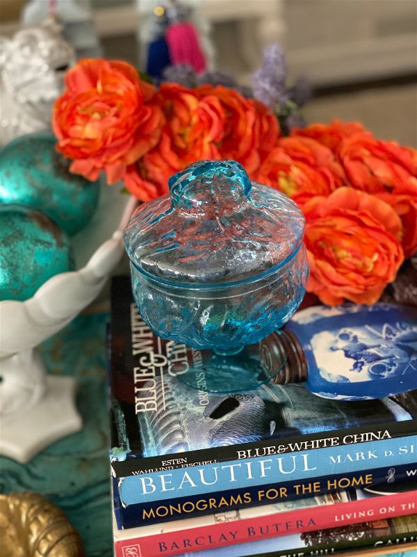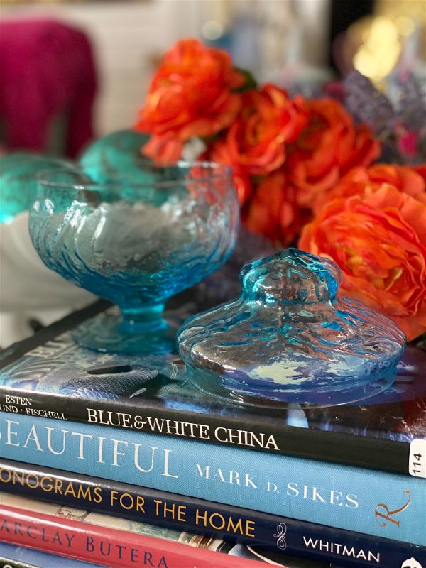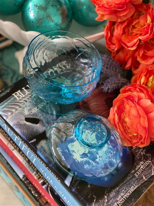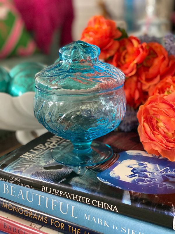This Blue glass pedestal candy jar has that wavy look and coastal vibe. How pretty would this be filled with shells you collect after walking the beach. Sweet treats or desk supplies would be fun to keep in here as well. The color is my favorite, too!! See picture details as they are part of the description.