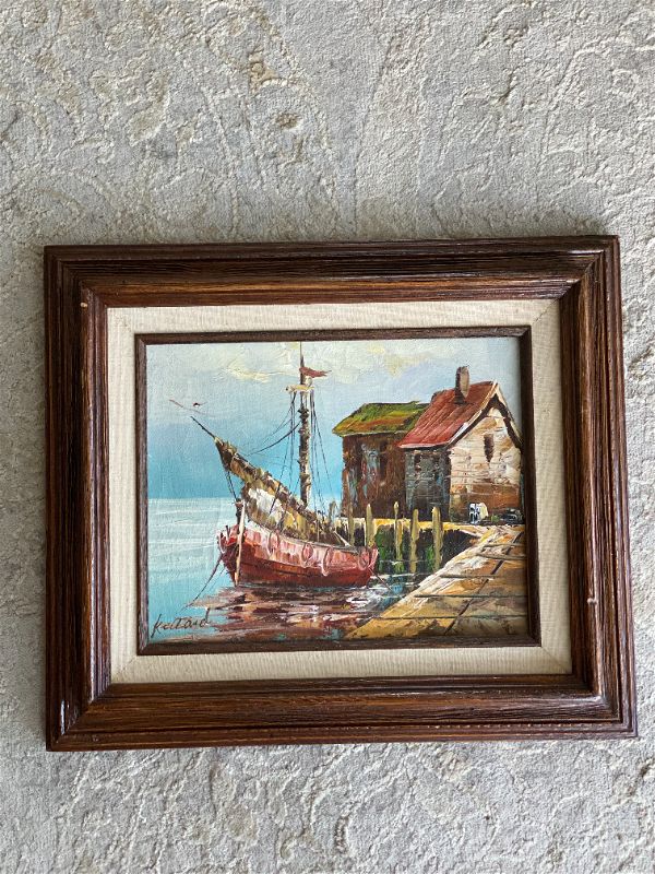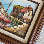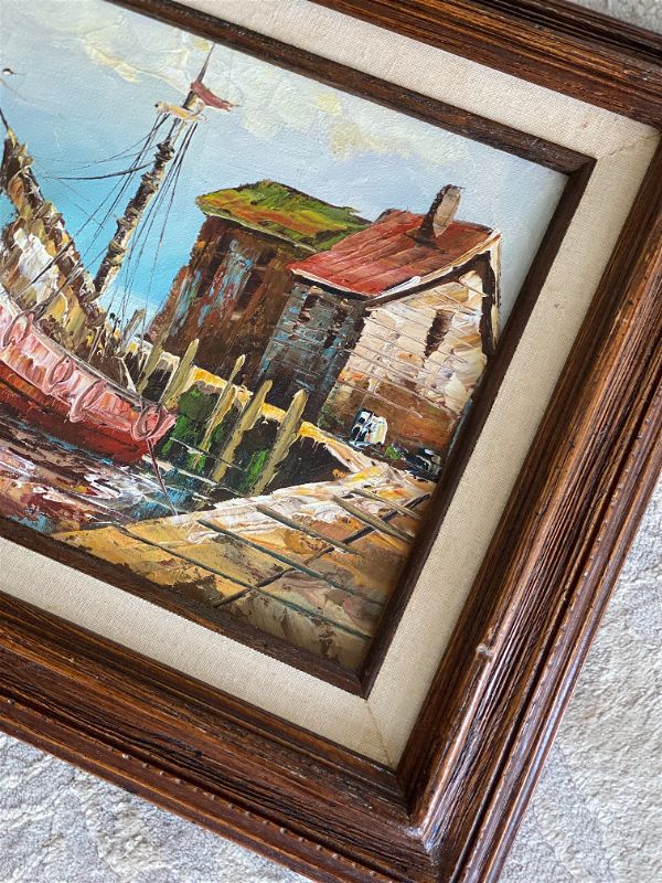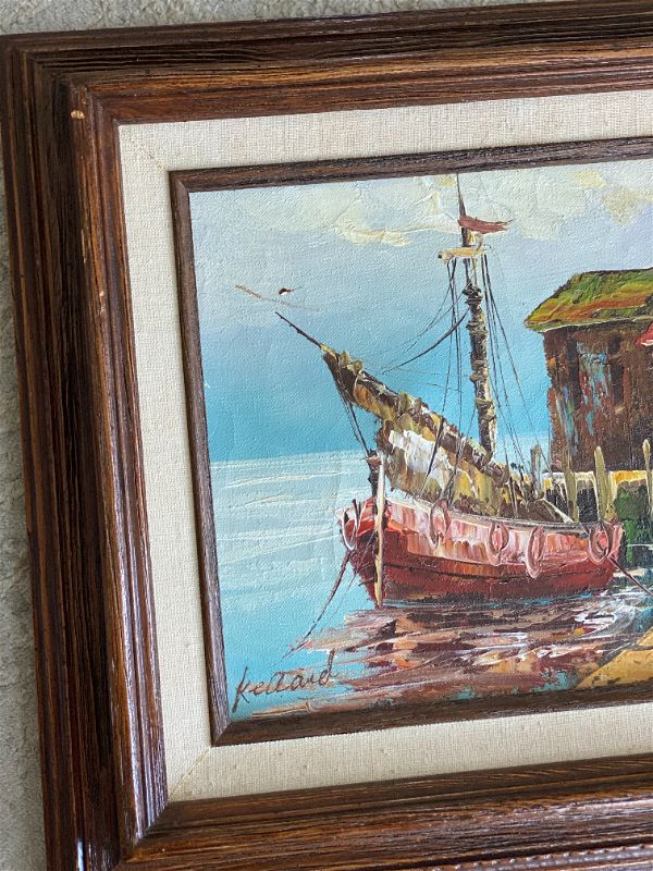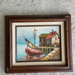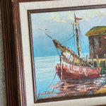 Vintage Boats coastal oil painting, signed and framed