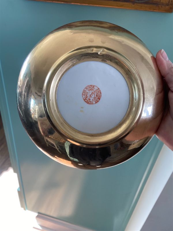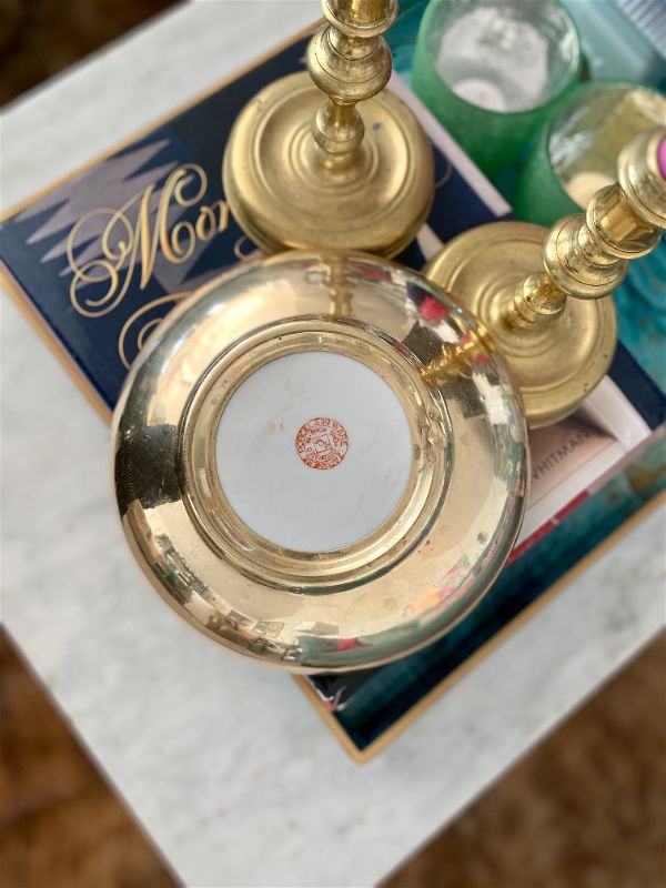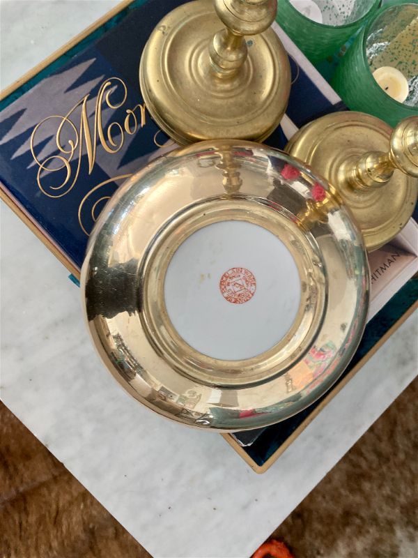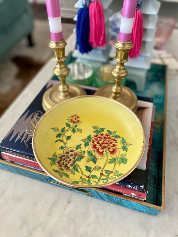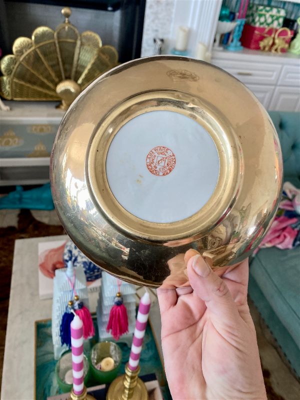 These brass backed shallow bowls/plates are so hot right now. They are beautiful grouped on a plate wall, displayed on a shelf or in a china cabinet. I love using them as trinket dishes for jewelry, loose change or for your keys and wallet at the front door.