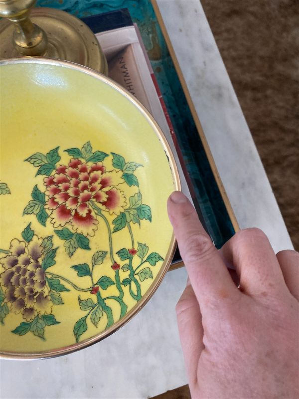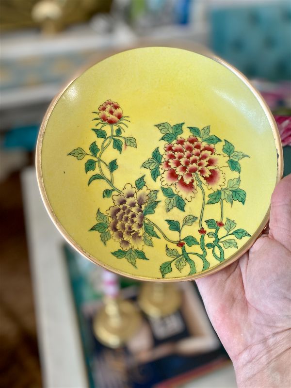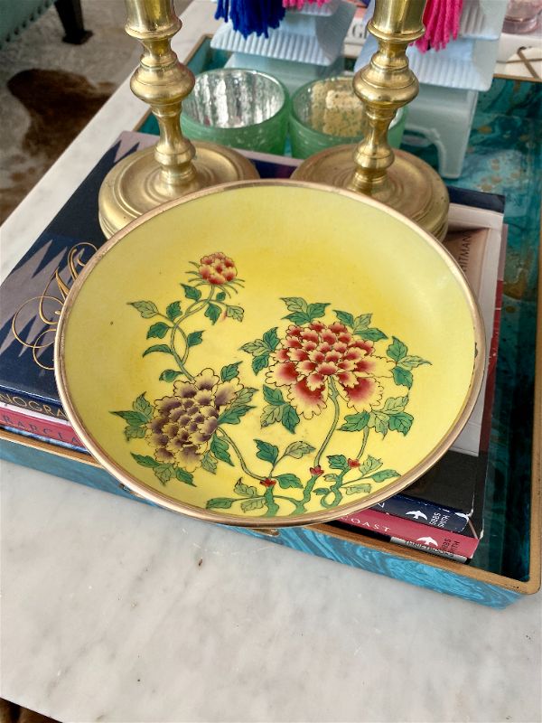 Vintage Asian Brass and Porcelain Yellow Floral Shallow Bowl
