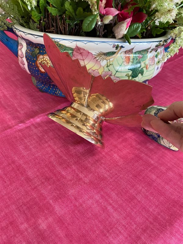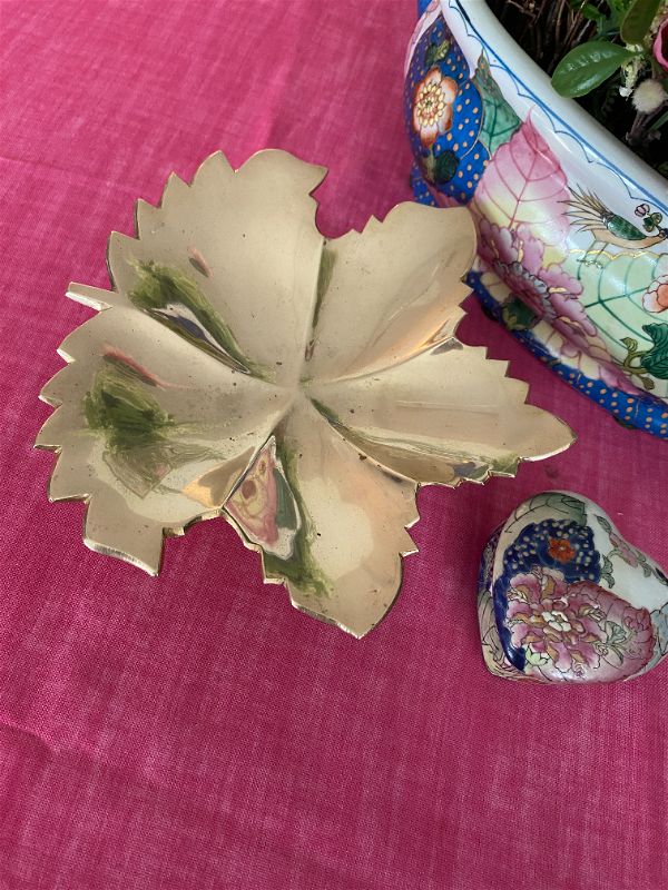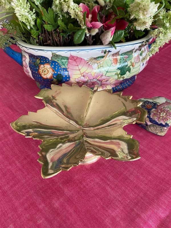 This sparkly pedestal, brass leaf dish is a great addition to a side table or coffee table. Add it to your Fall/Autumn decor or display year round. Use it to hold your jewelry on your nightstand or vanity. Great for decorative soaps in the bathroom, or to hold napkins on your kitchen counter or bar cart. Also beautiful on its own. See pictures as they are part of the description.