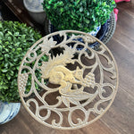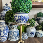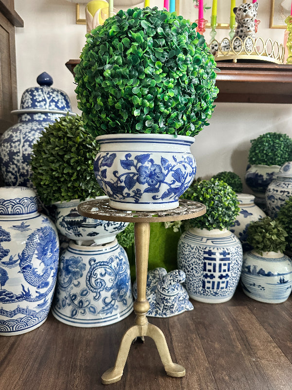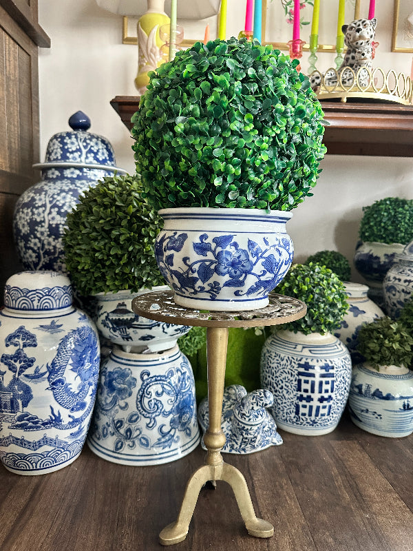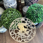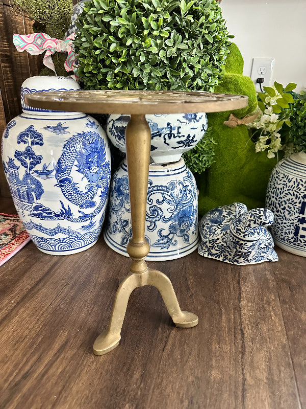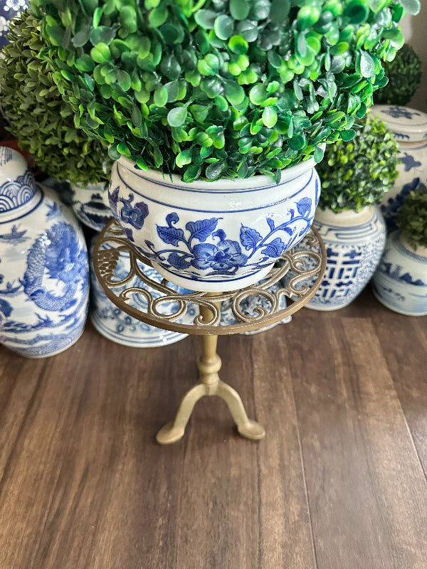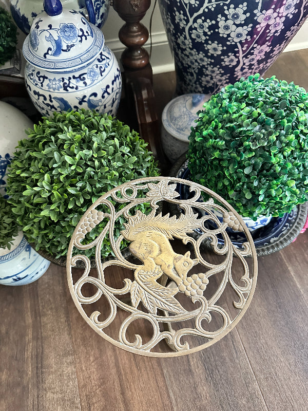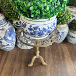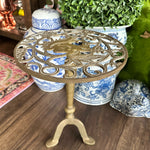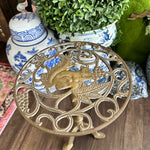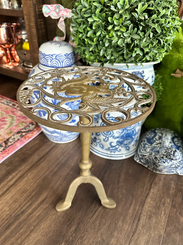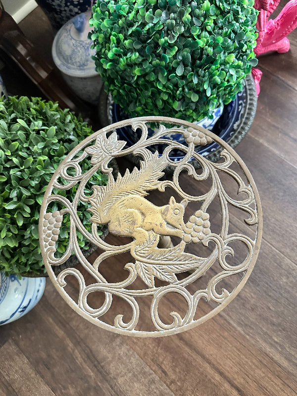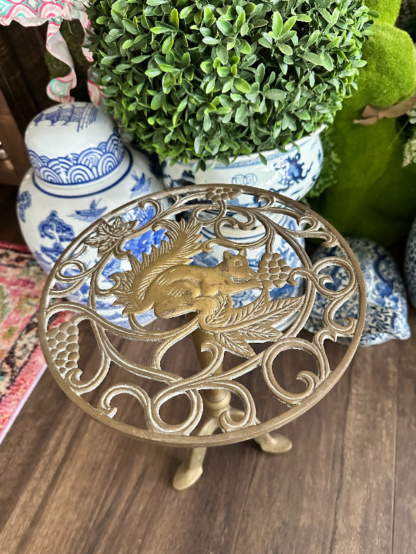 Add height to your favorite plant with this sturdy, whimsical brass stand. It has a cut out metal top with a squirrel motif. Pedestal style with 3 legs as base. Perfect for a small side table or outdoor plant stand.