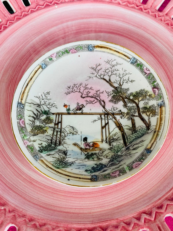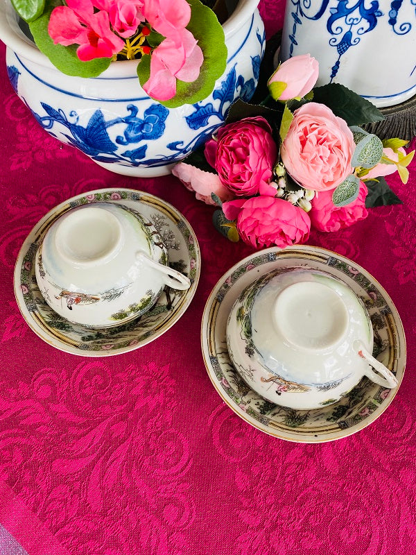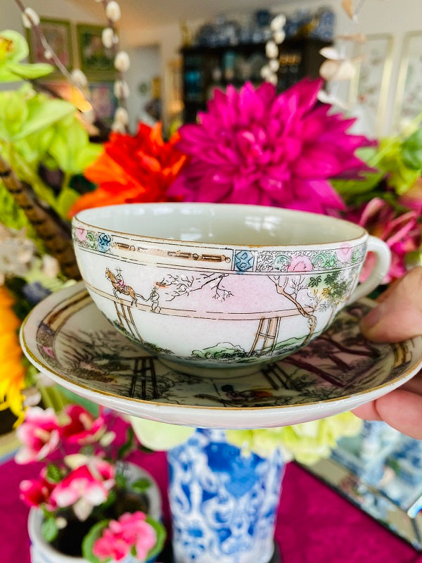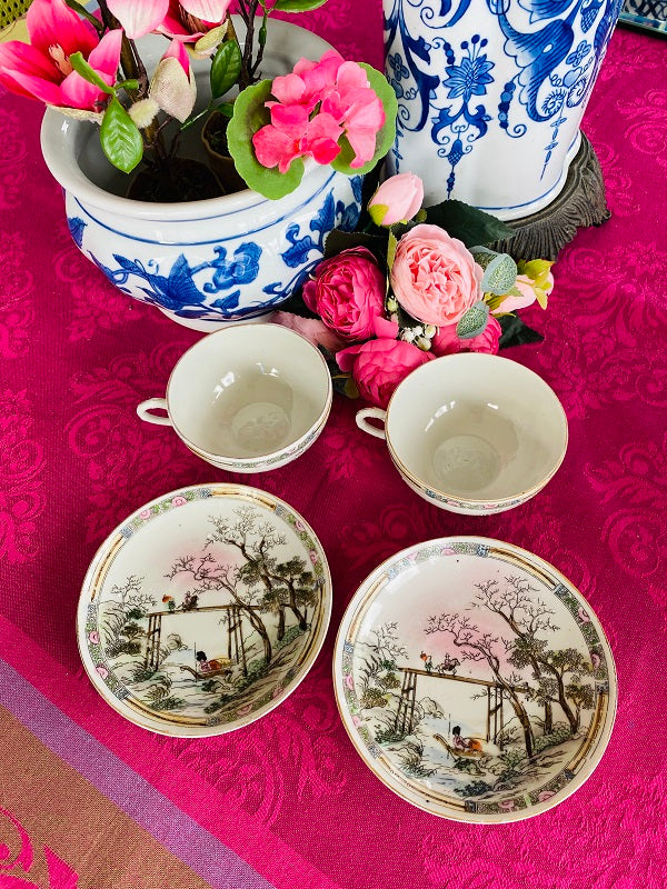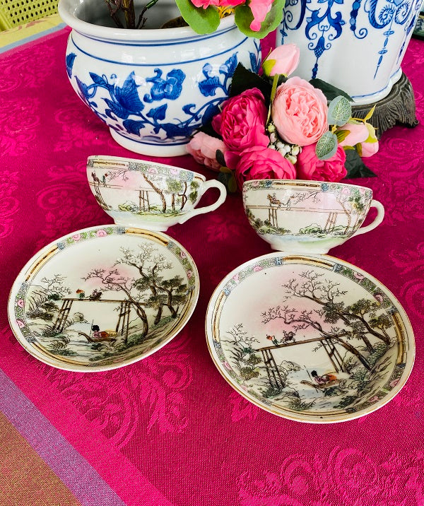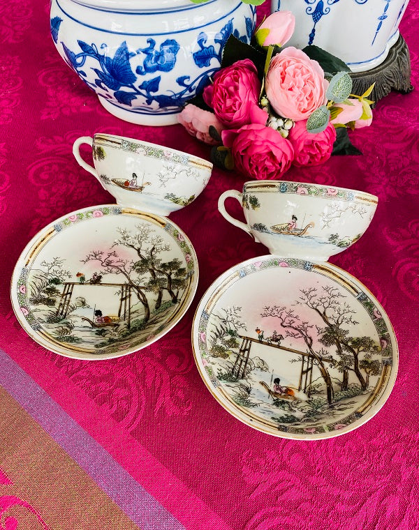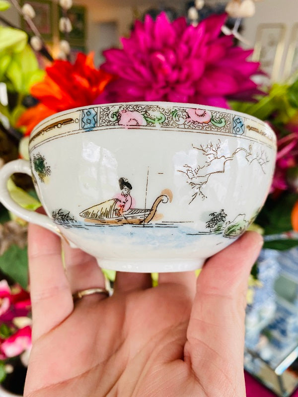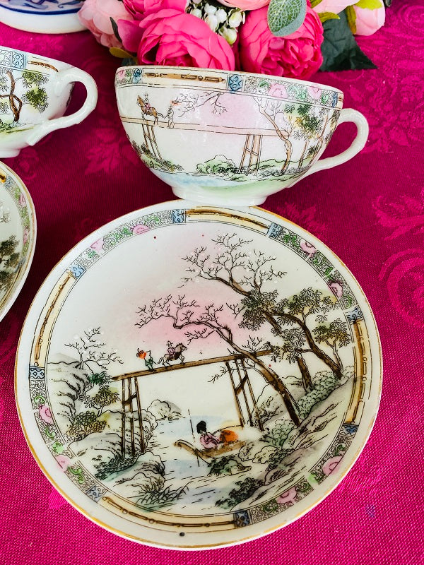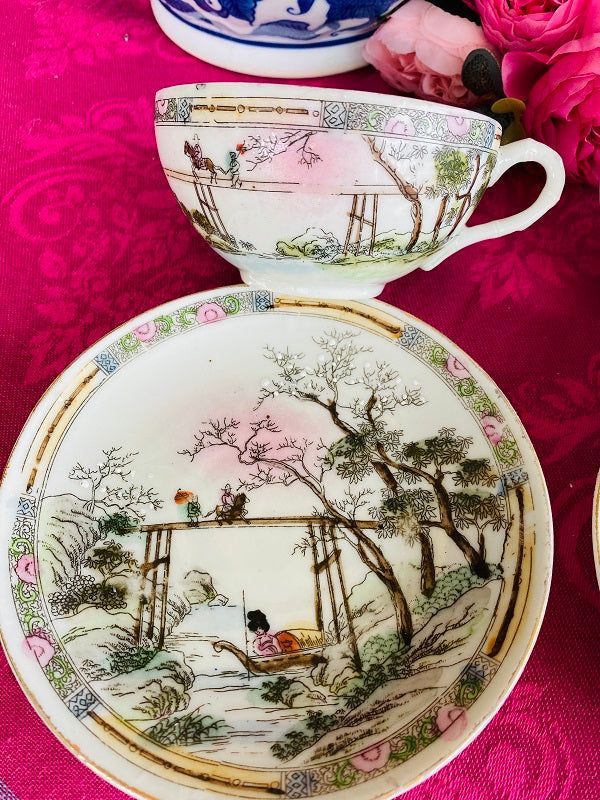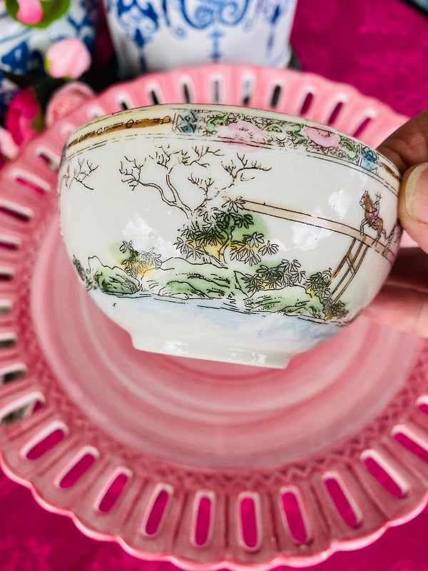 EACH SOLD SEPARATELY These amazing teacups are hand painted with beautiful Asian scene of cherry blossoms, water and fishermen on a bridge. They are a delicate porcelain with no chips or cracks. The most likely date to the early 1900s. Some colors have faded but otherwise in great condition. If you love collecting Famille Rose Medallion China these are a great addition.