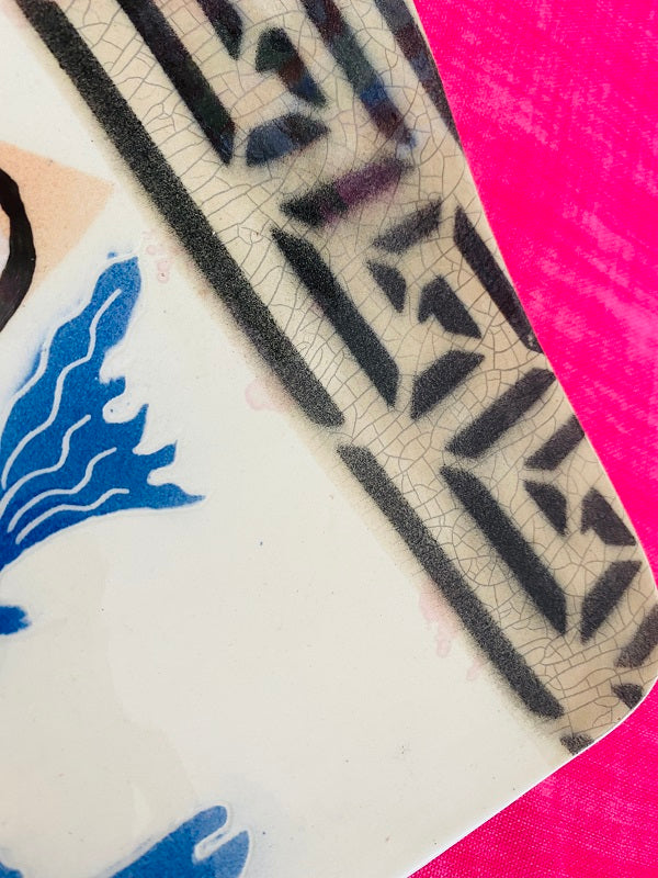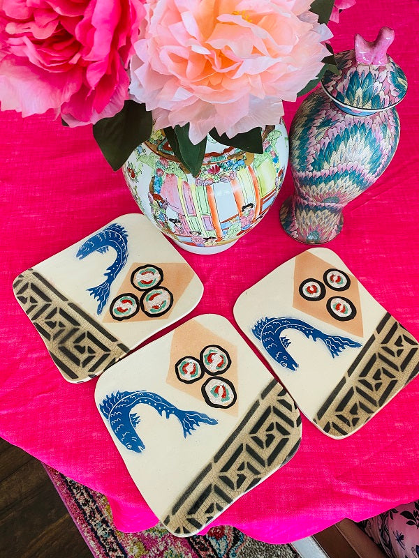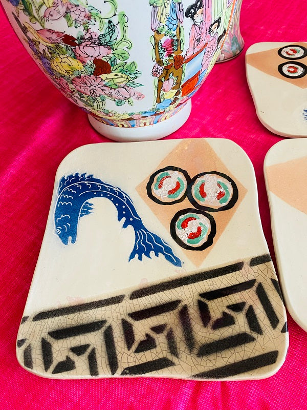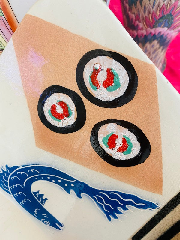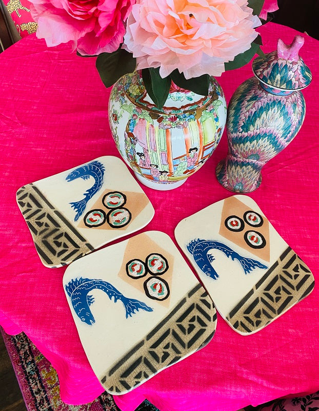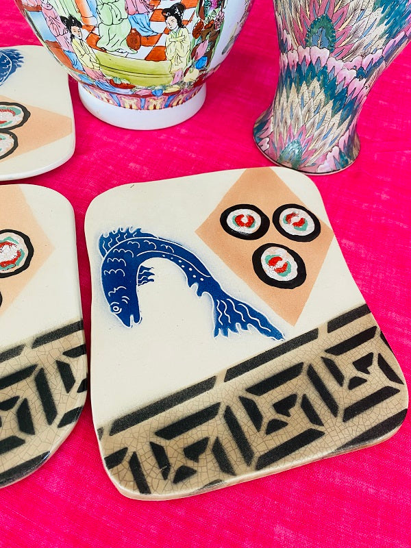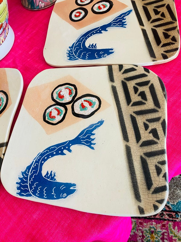 Serve a sushi meal on these fun handmade ceramic sushi plates. Each plate is a slightly different size. They have a blue fish and pieces of sushi rolls that are textured, along with a greek key style design. Great to display in a cabinet or shelf and then press into service when it's time to eat. The artist's signature is on the back noting that the were made in Maui, Hawaii.