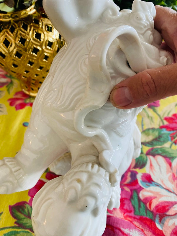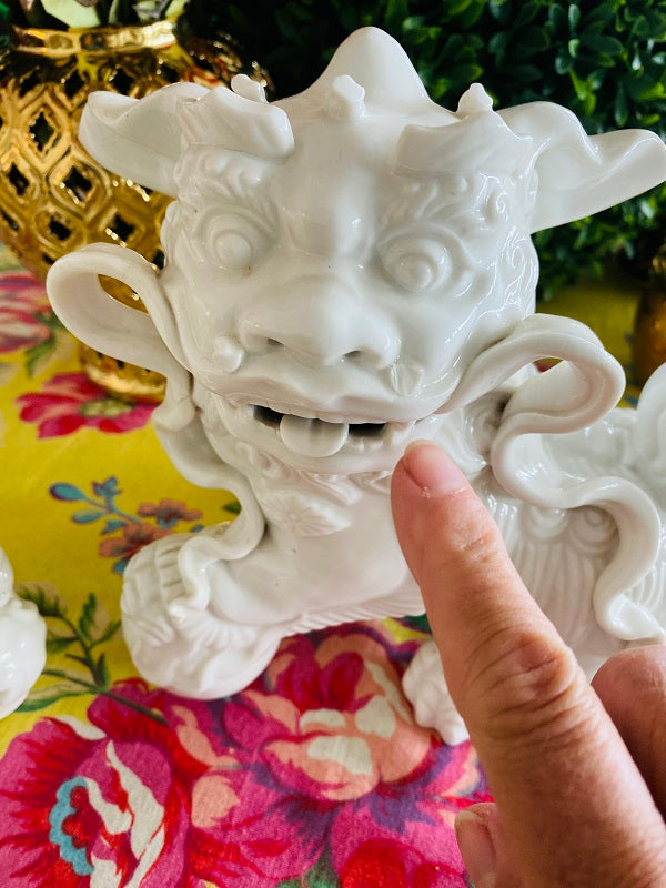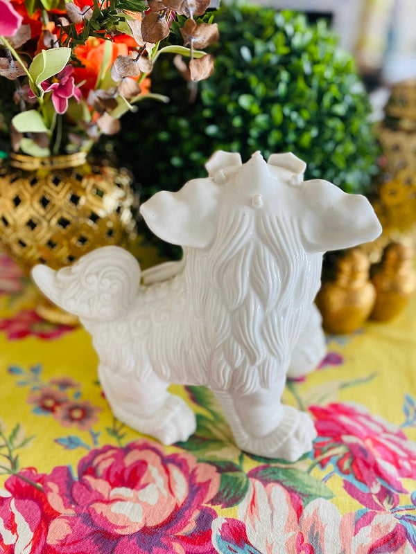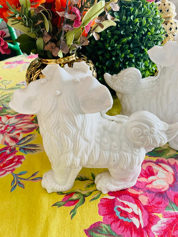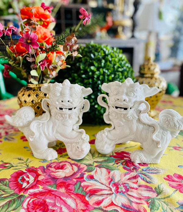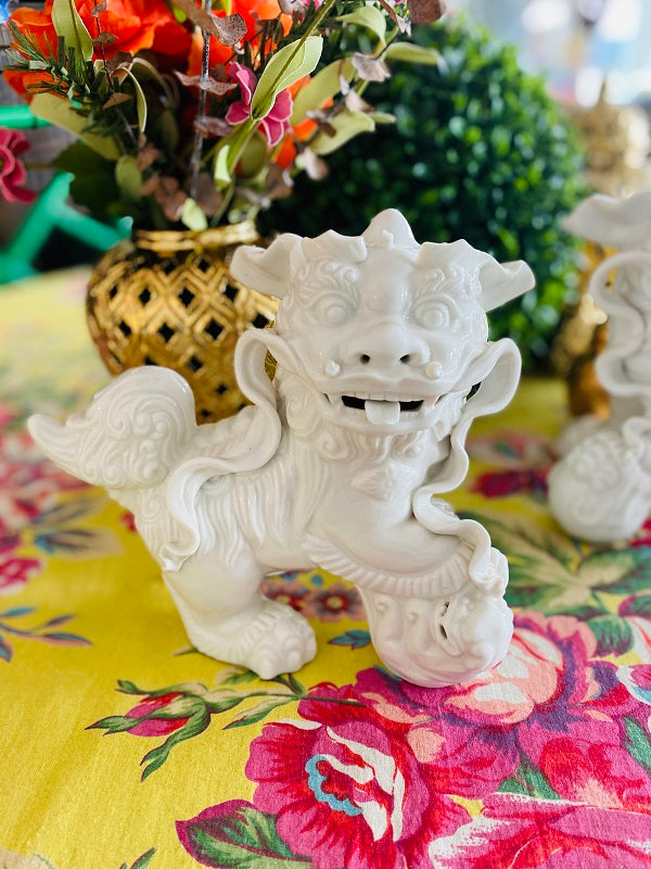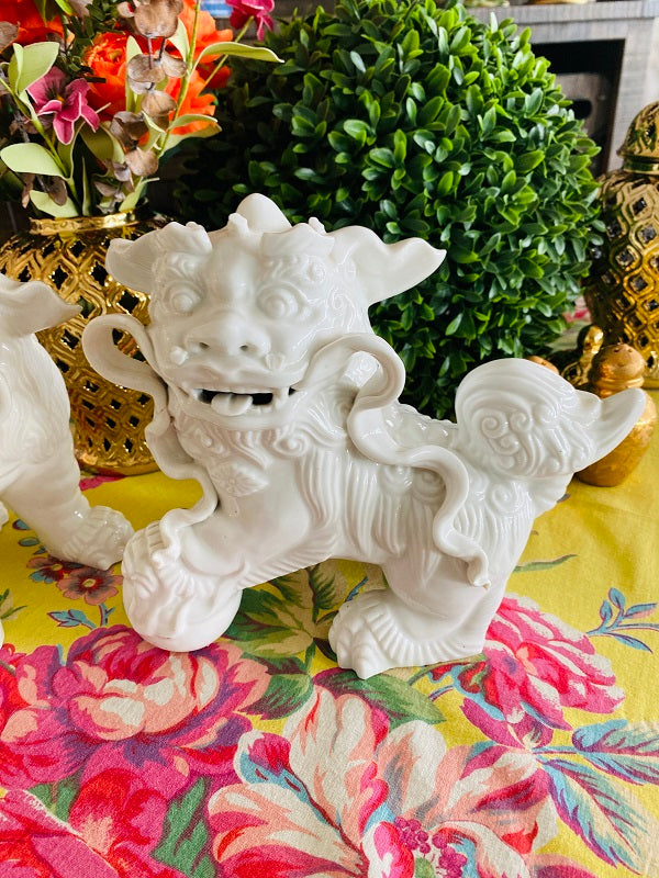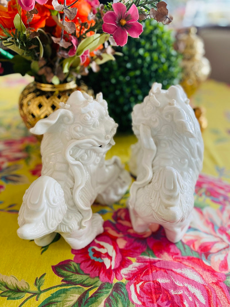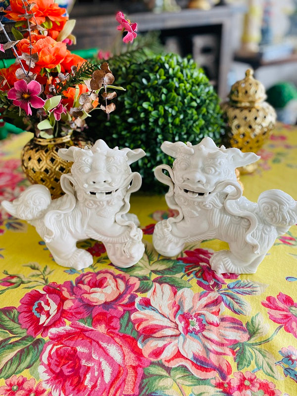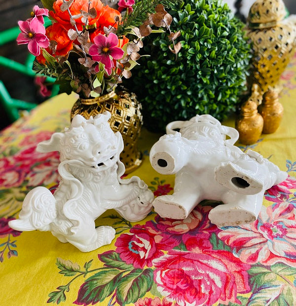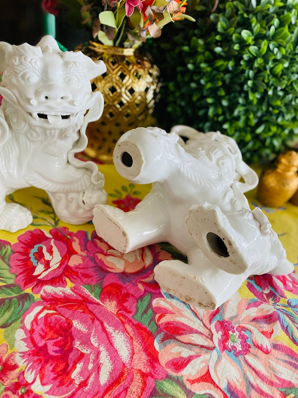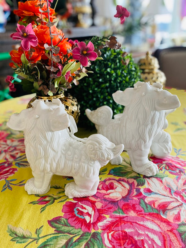 Foo dogs, also known as "Shishi" in China, were often displayed outside homes of wealth to ward off negative energy and protect the home. They were actually described as "Lions". This amazing pair of foo dogs have great detail and are a generous size. They are perfect on a table to flank a floral centerpiece. Add them to a shelf display for a whimsical look, or put them on a porch or patio surrounded by flower pots. Good vintage condition. One has been repaired on it's long whisker and there is one of the "dots" on the face that is slightly chipped. Both barely noticeable. See picture details as they are part of the description.