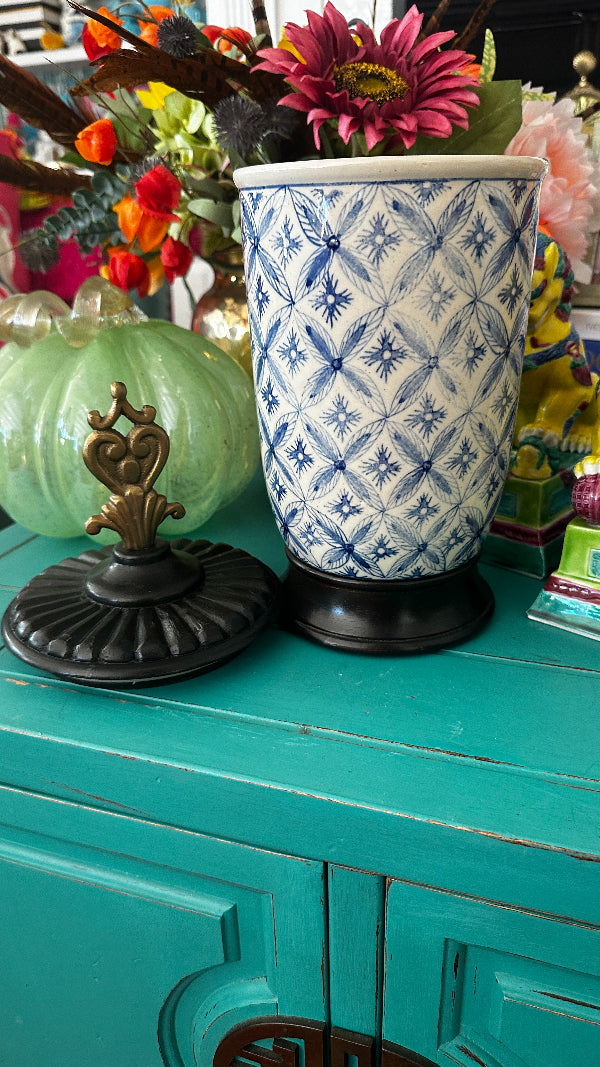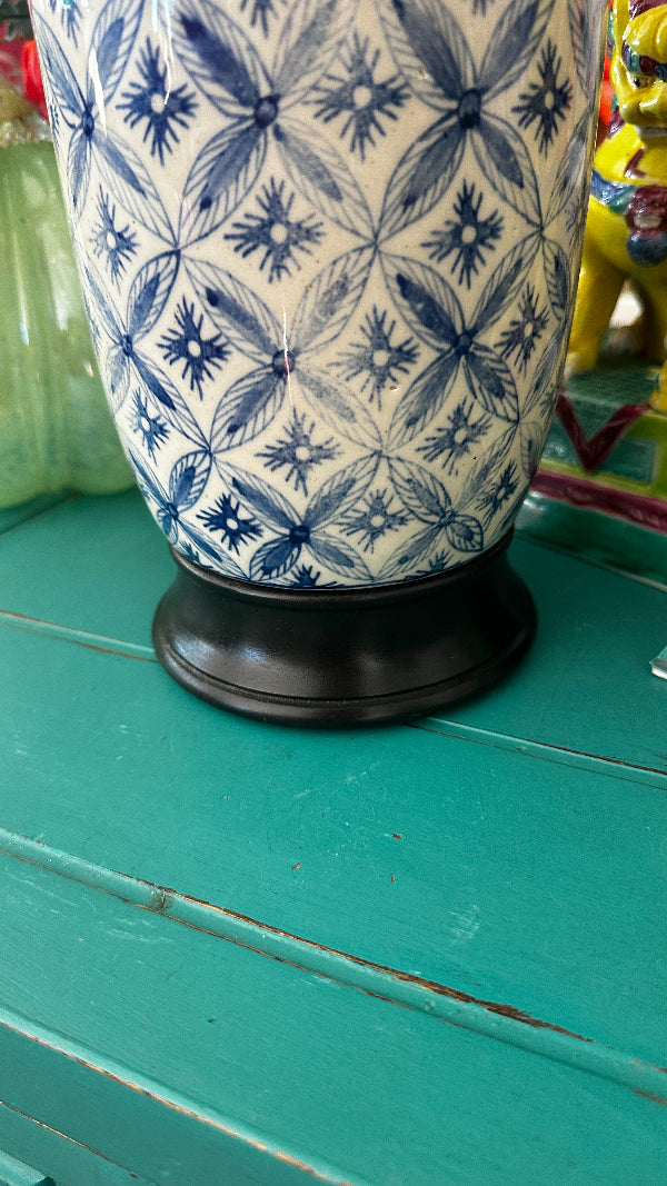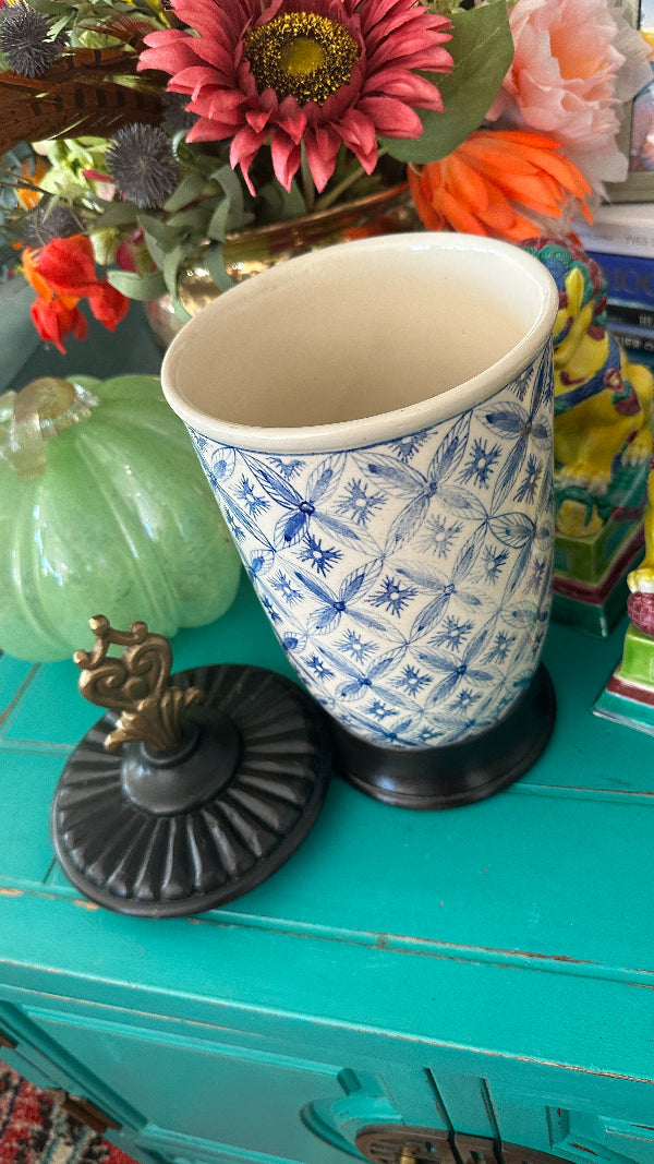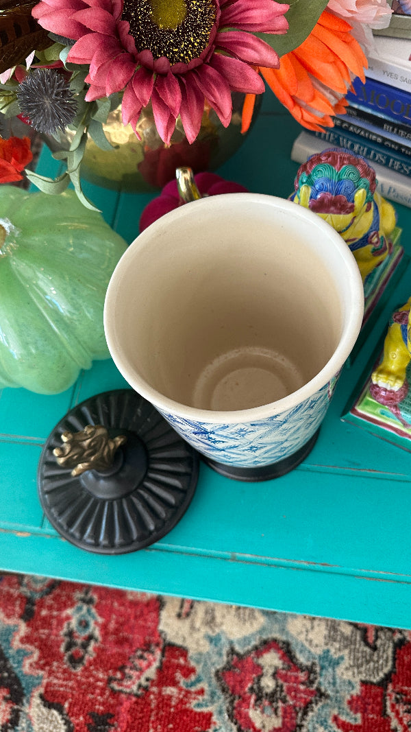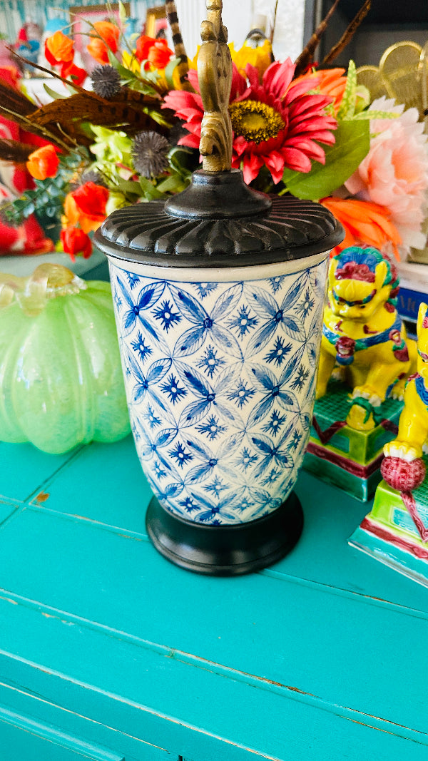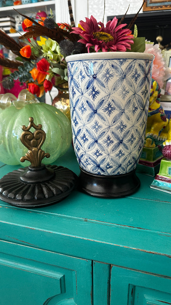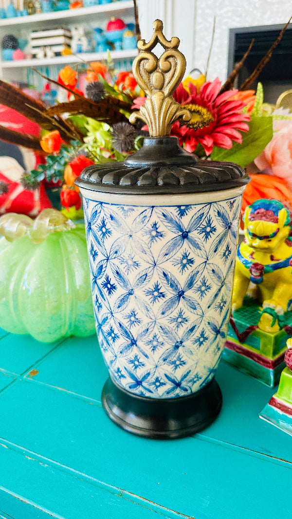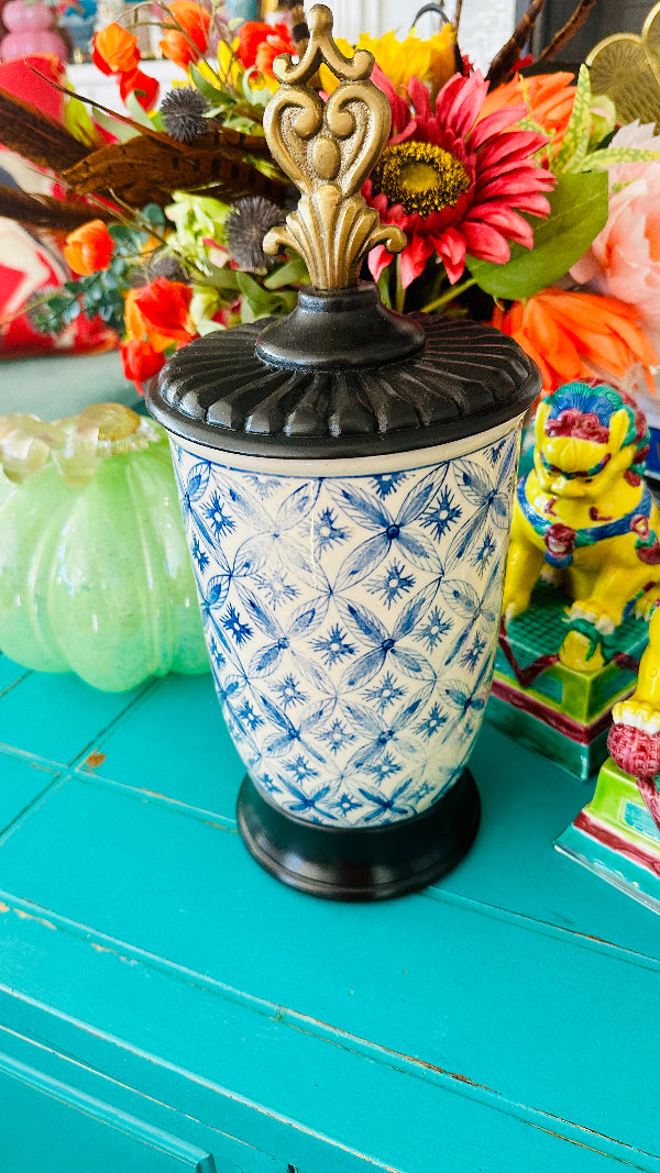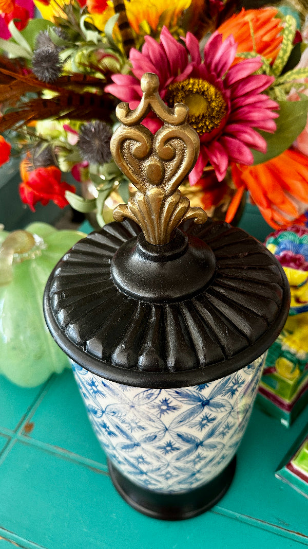 Enhance your home decor with the CBK handcrafted ceramic vase/jar, featuring a beautiful white and blue color scheme. This unique vase comes with an ornate lid, showcasing intricate detailing that adds a sophisticated touch to any room. Perfect as a storage piece or for displaying flowers. Lid has a plastic seal for keeping food items air tight.