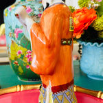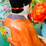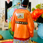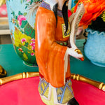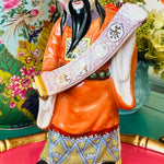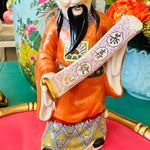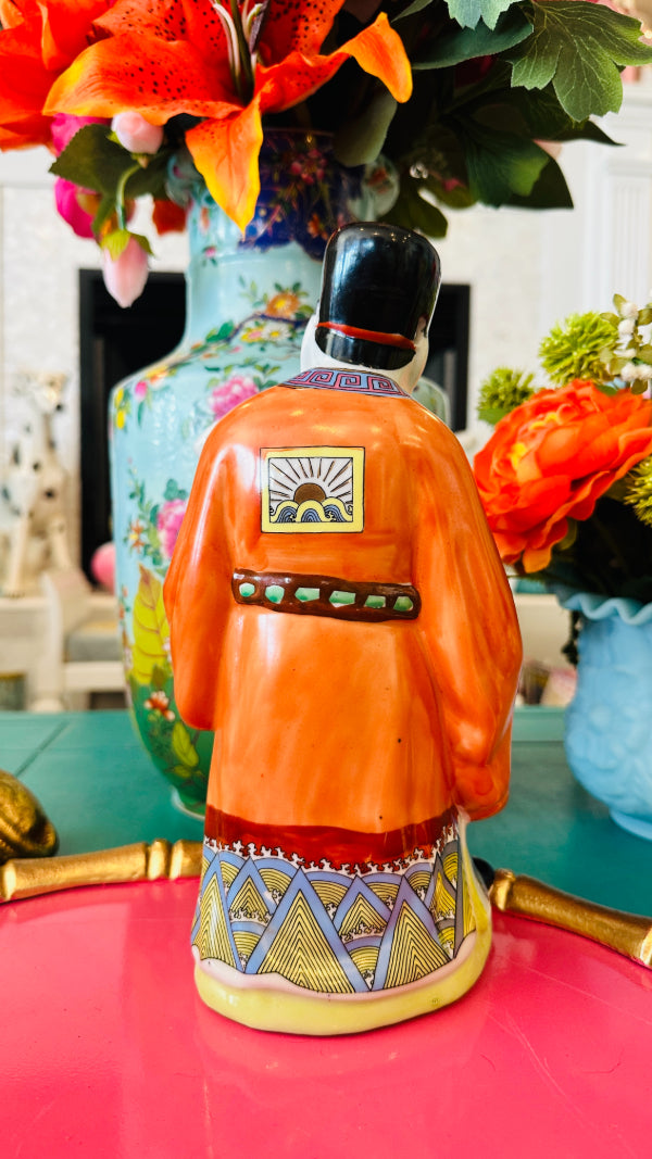 This vintage Chinese emperor figurine showcases a traditional, handpainted Asian motif, featuring the ruler holding a scroll in intricate detail. A beautifully crafted collectible, it adds cultural elegance and historical charm to any display, making it ideal for collectors or as a distinctive decorative accent.