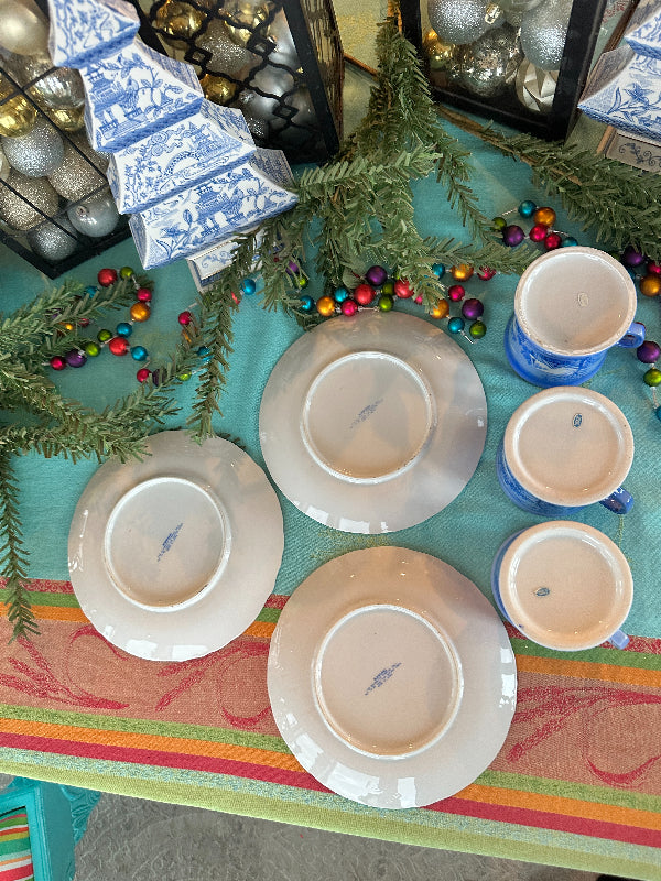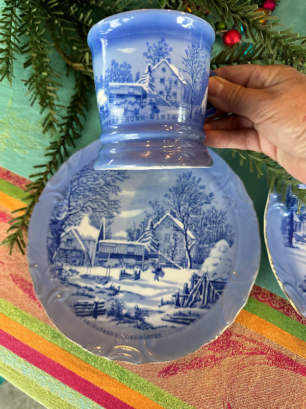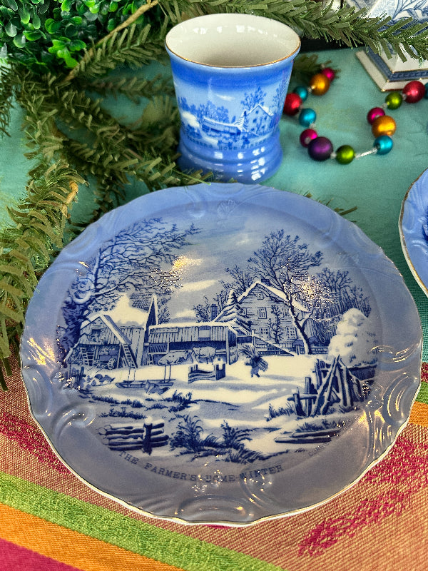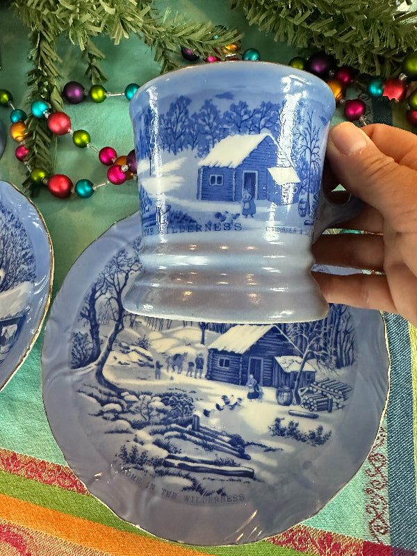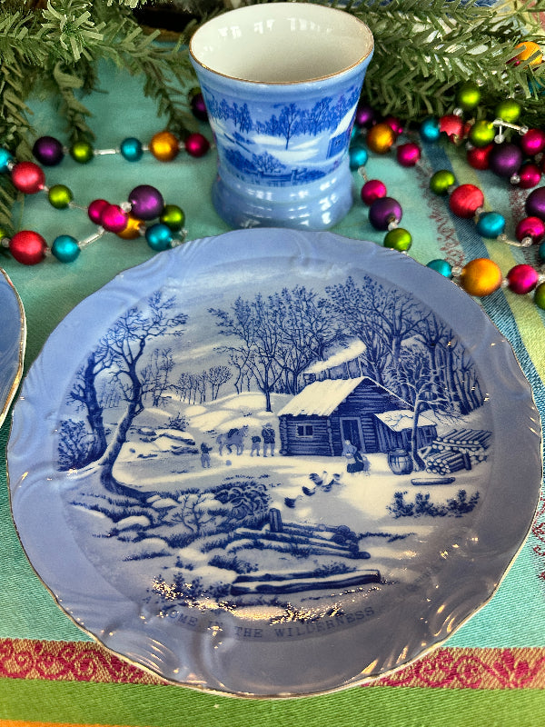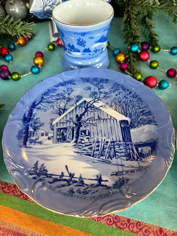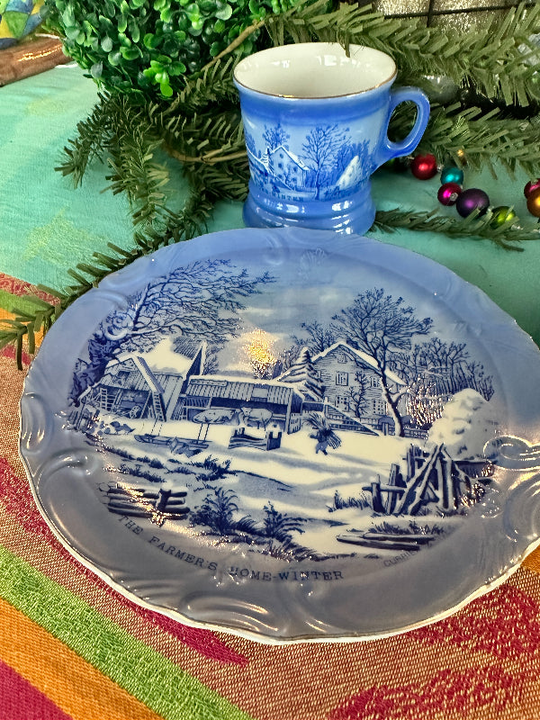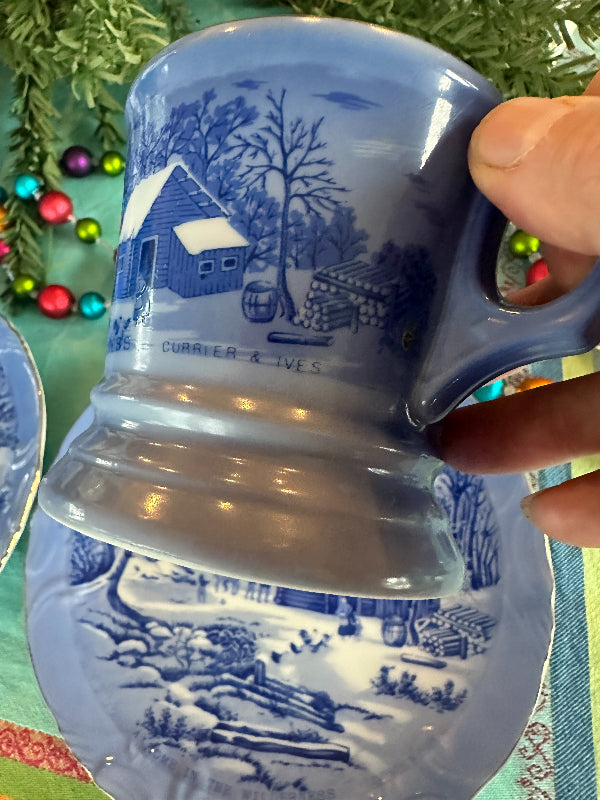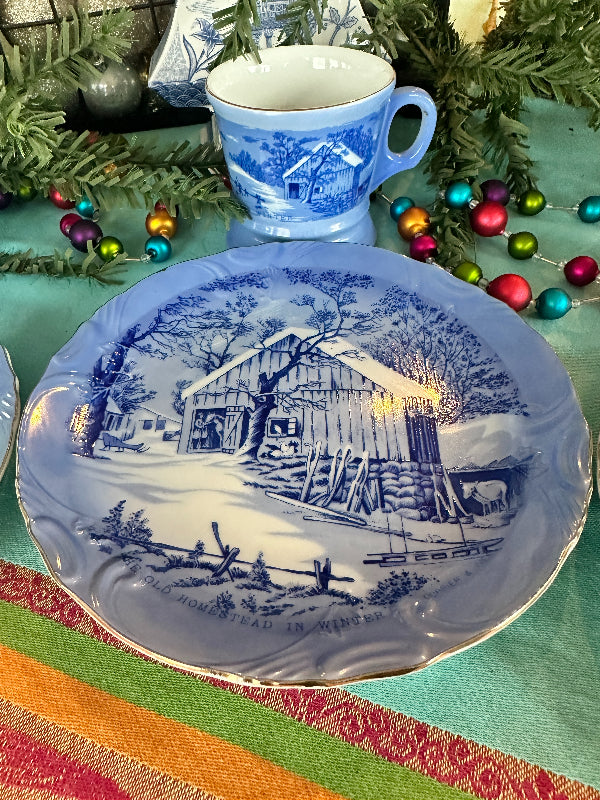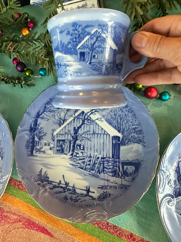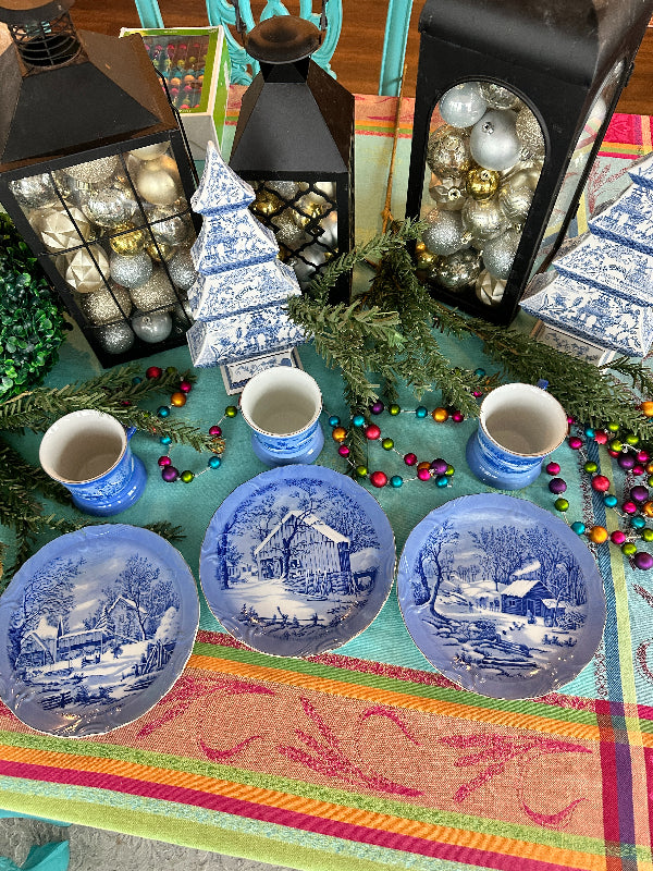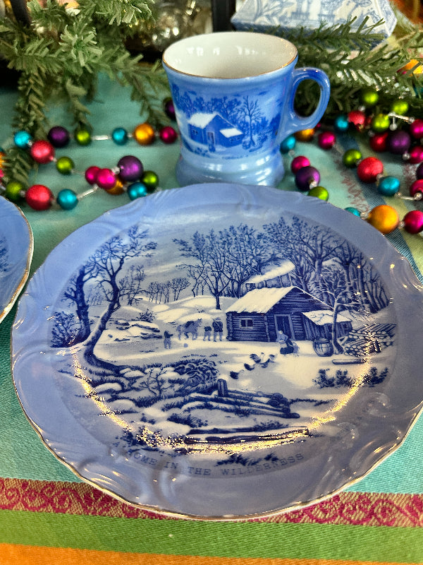 Holiday Chinoiserie!! these sets of blue and white plate with mug have a matching scene. Each displays a snowy country scene. Each mug and plate are labelled with the title of the artwork and the "Currier & Ives" inscription. These would be beautiful to display during the holidays in a china cabinet or on a shelf. They would make a perfect gift as well.