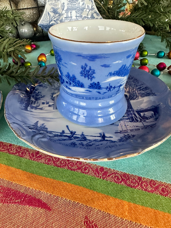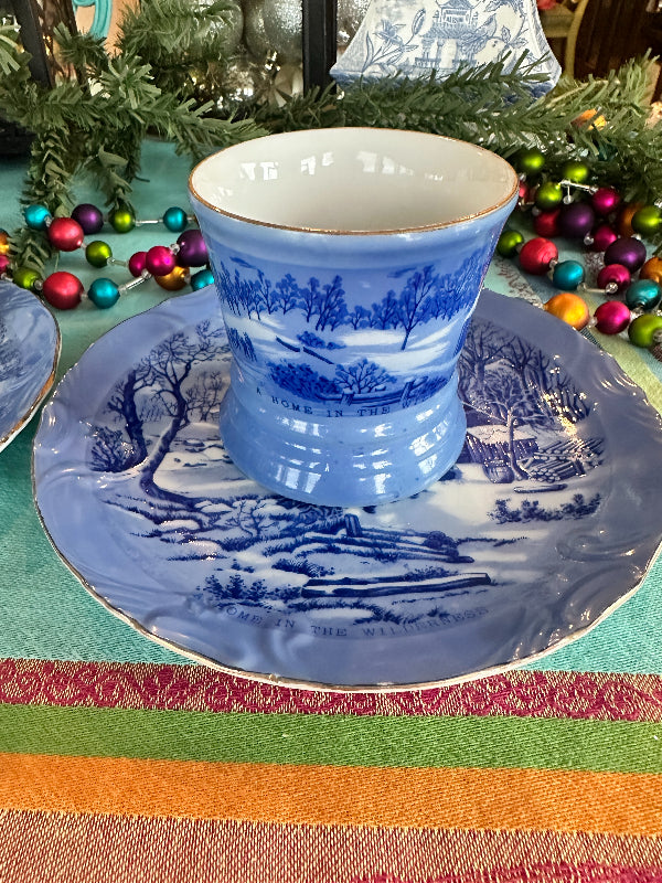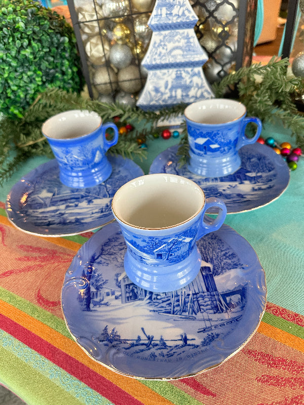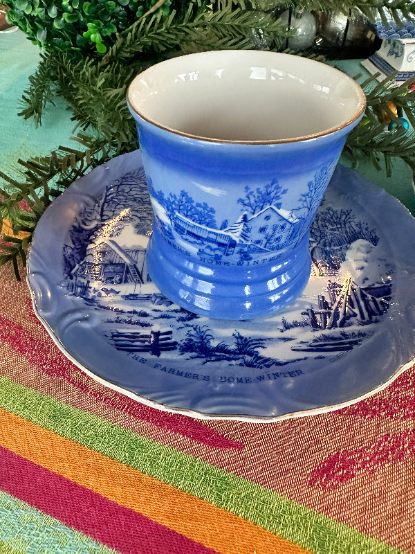Vintage China, Currier & Ives Decorative Plate and Mug set, Blue and White Chinoiserie - 3 sets available