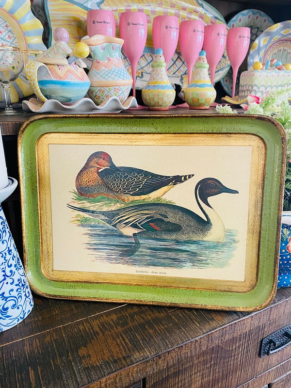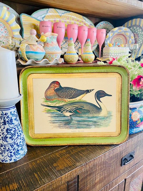 The duck lover or hunter in your life will drool over this beautiful Italian Florentine tray. A gold and green border adds that pop of color to the gorgeous duck motif. Sturdy and in amazing vintage condition. This was originally made for Gumps Department Store in San Francisco. A perfect gift for Dad. Use or display in a library, den, office or on a bar cart.