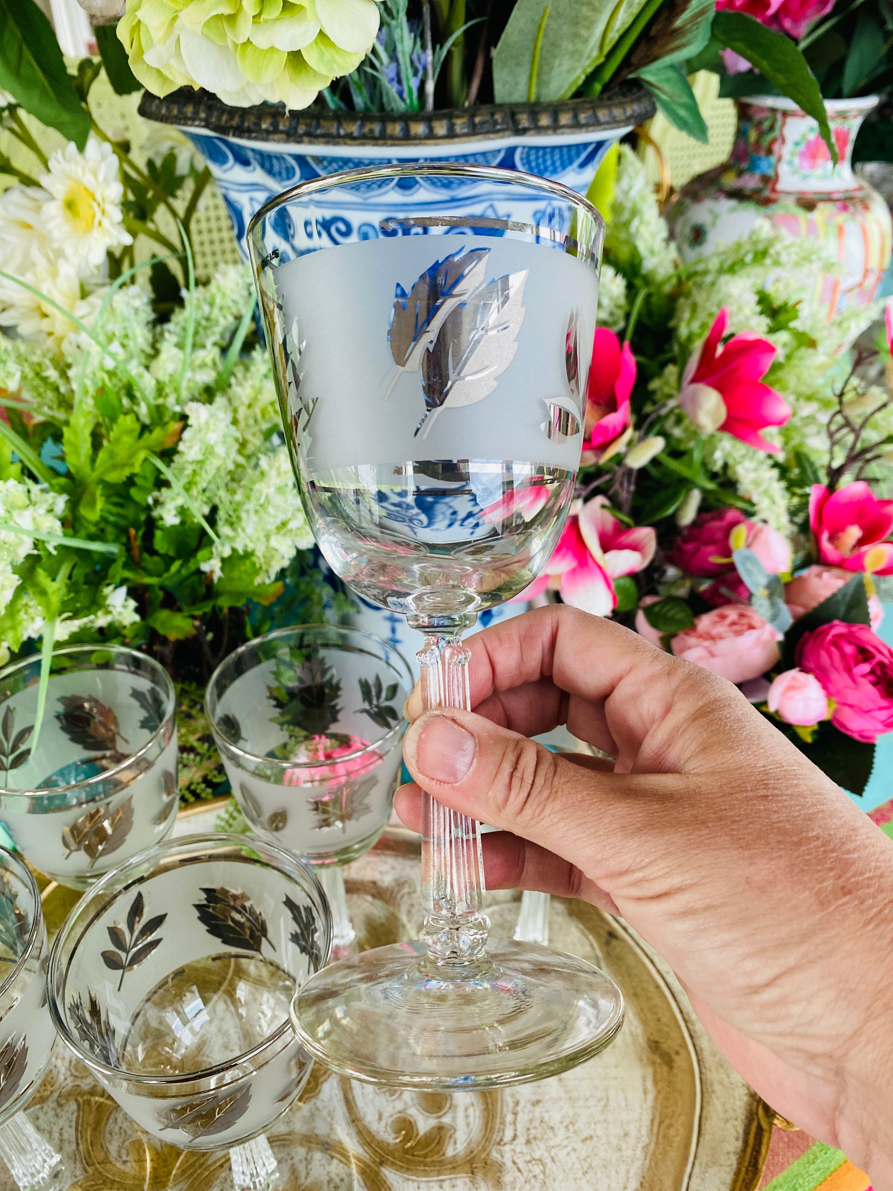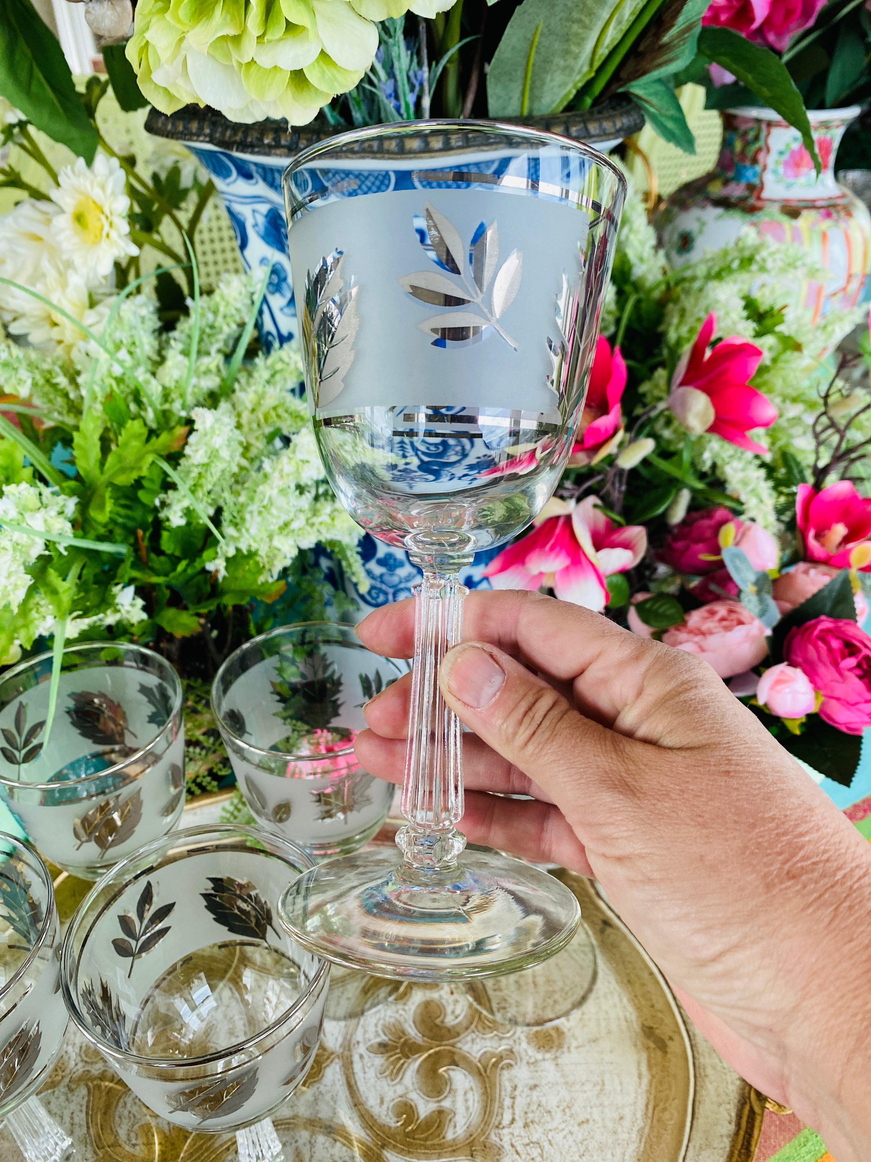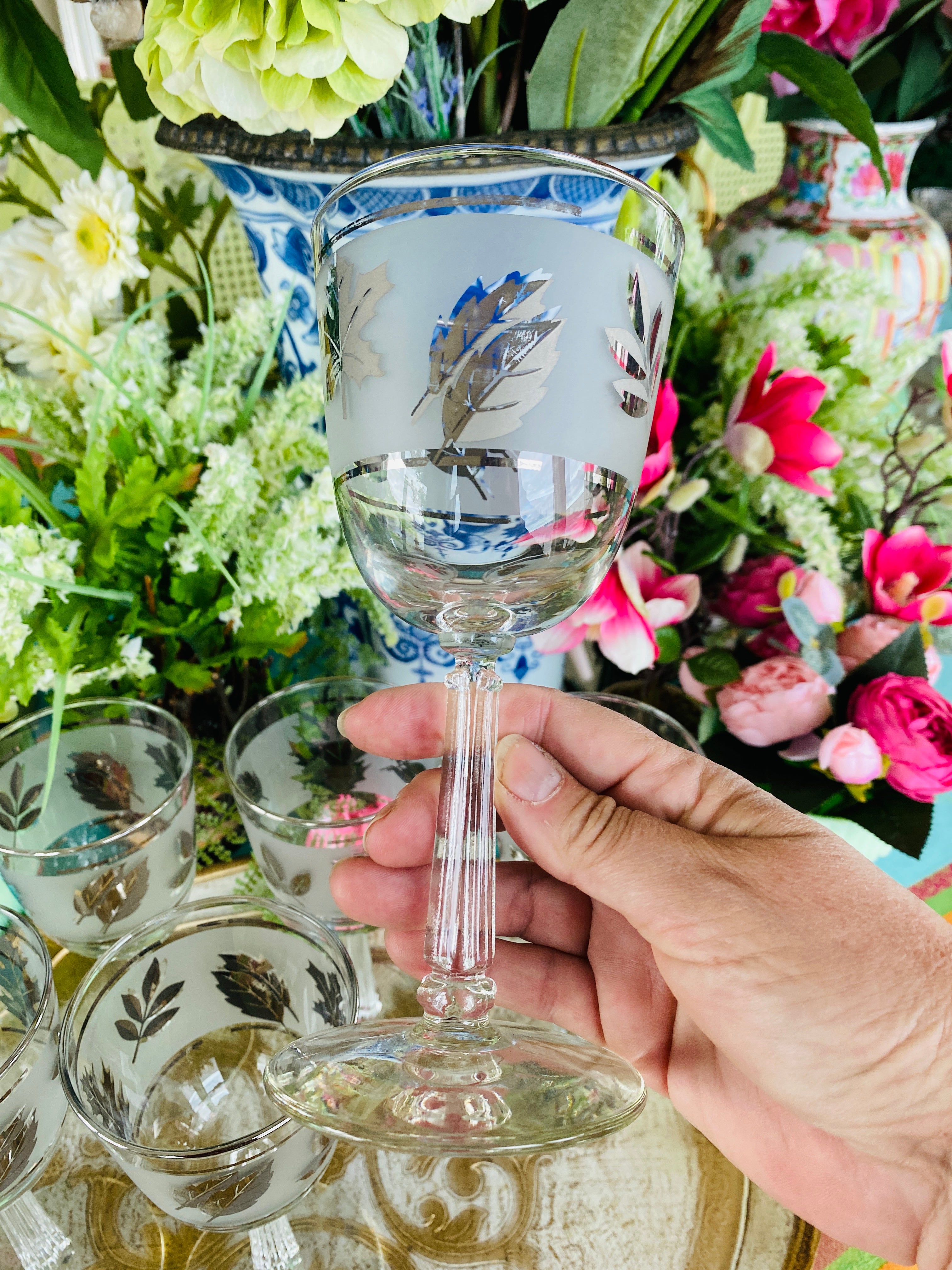 Mid Century Modern Wine Glasses Frosted with Silver Leaf Pattern set of 6