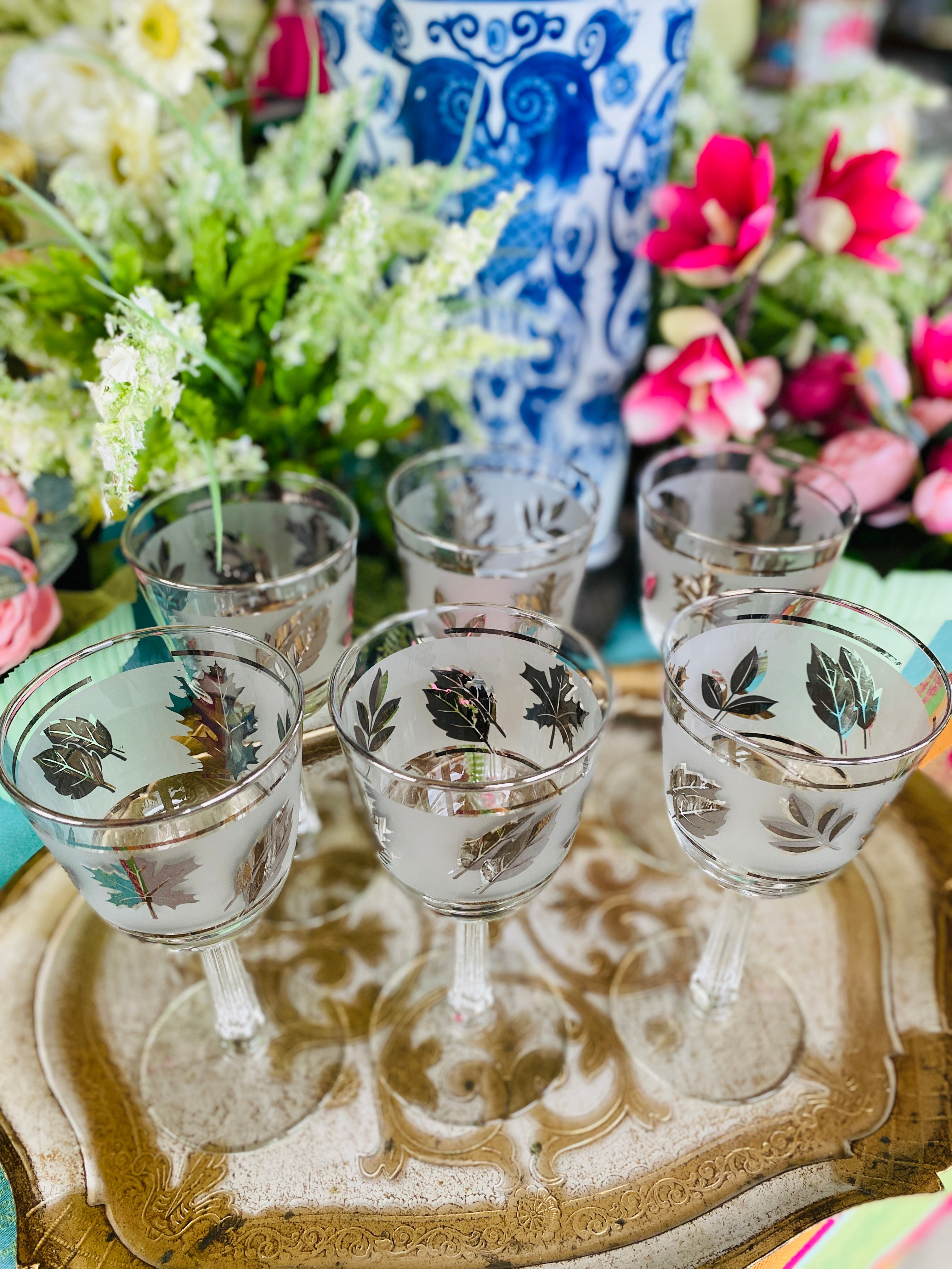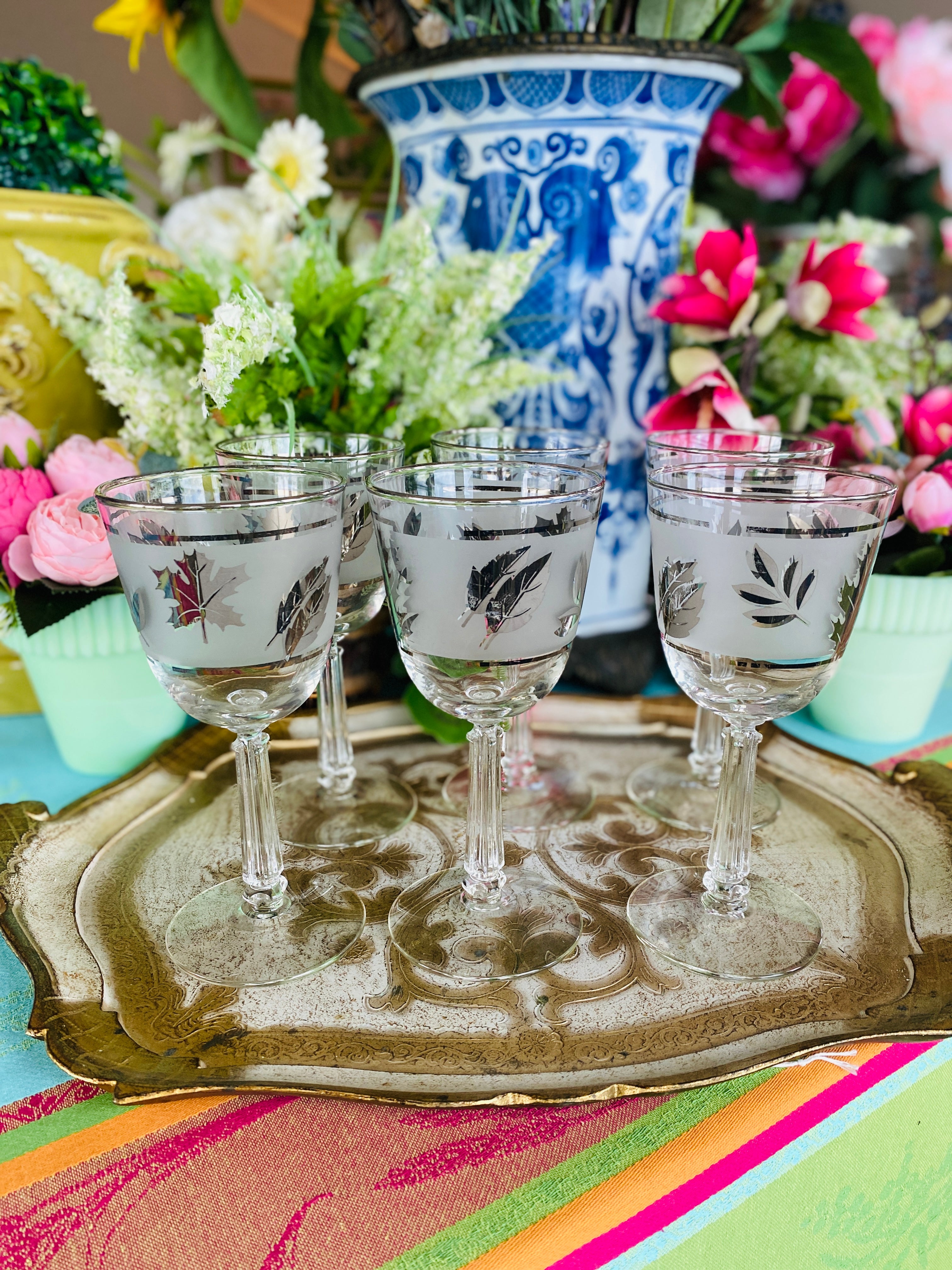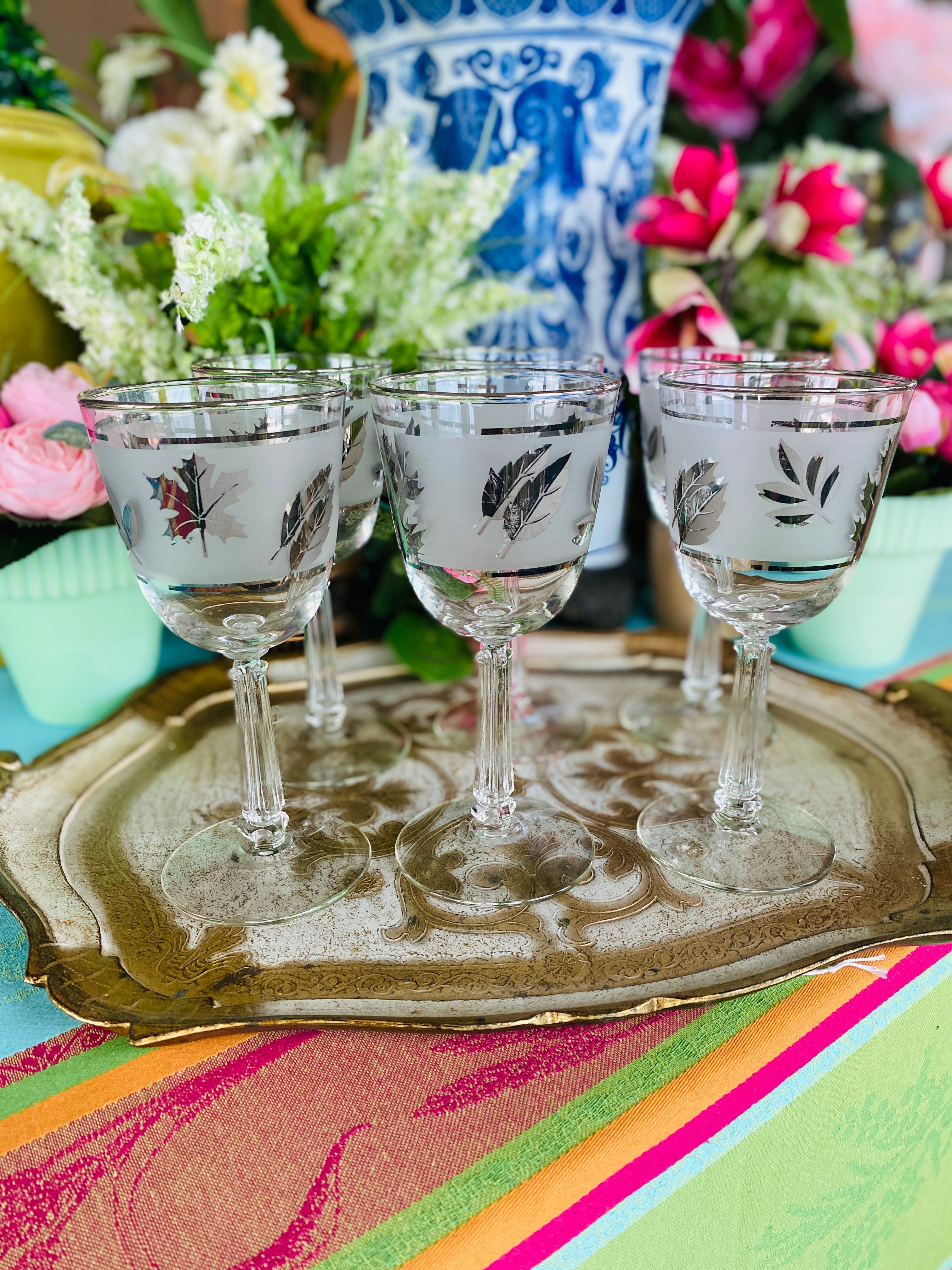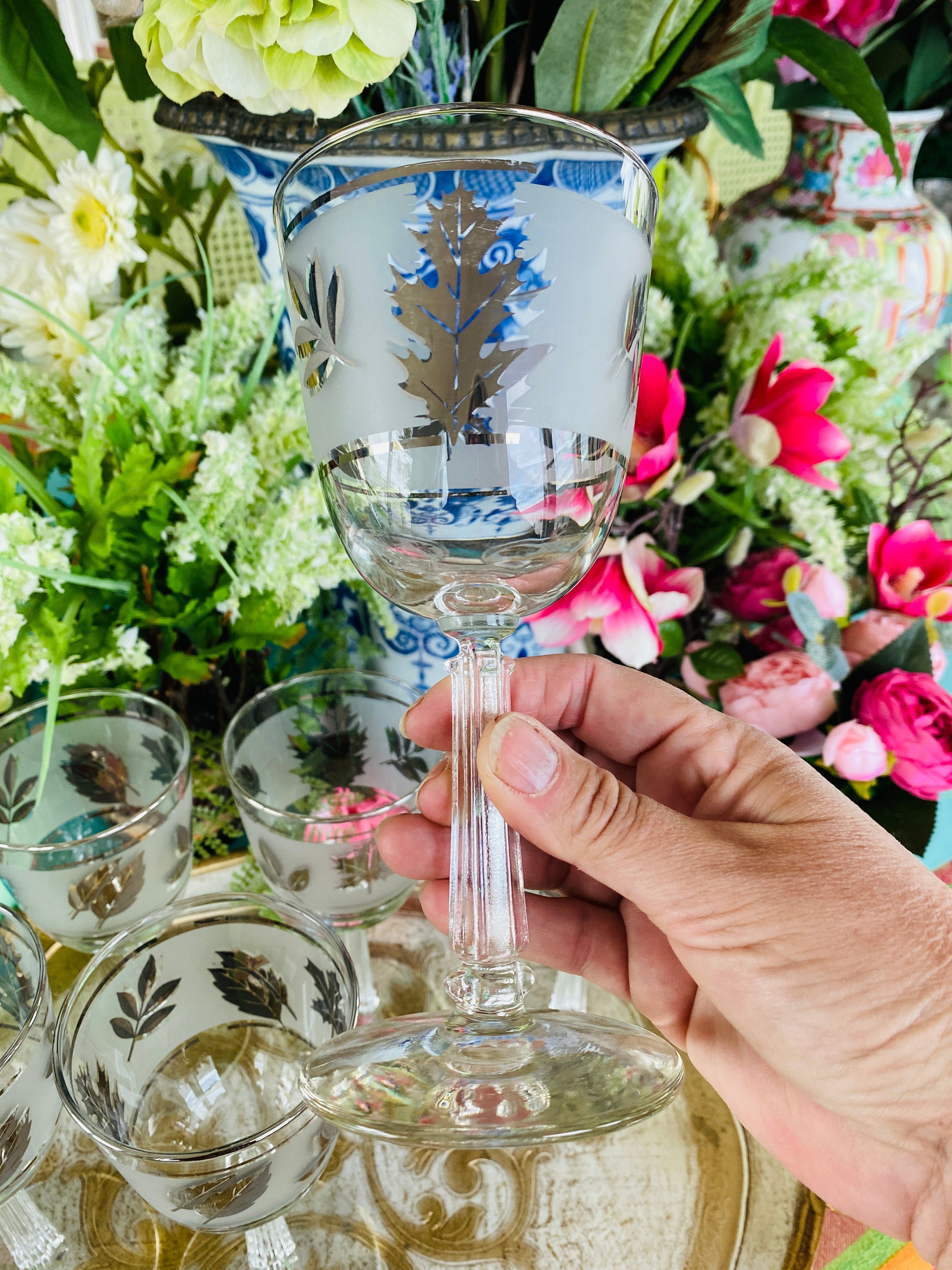 Mid Century Modern Wine Glasses Frosted with Silver Leaf Pattern set of 6