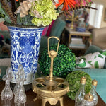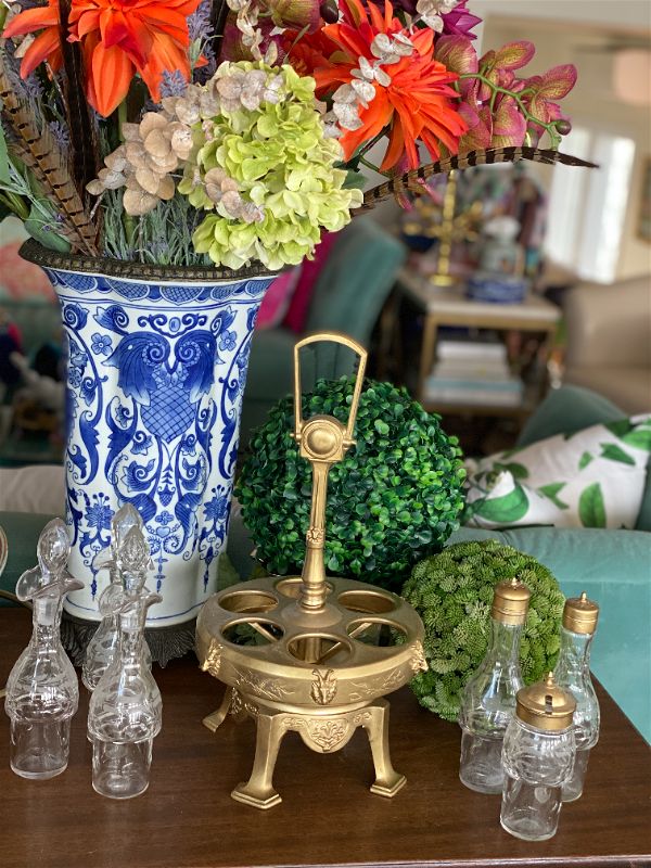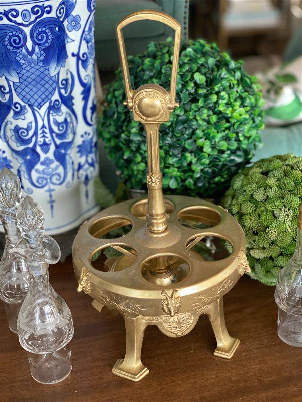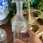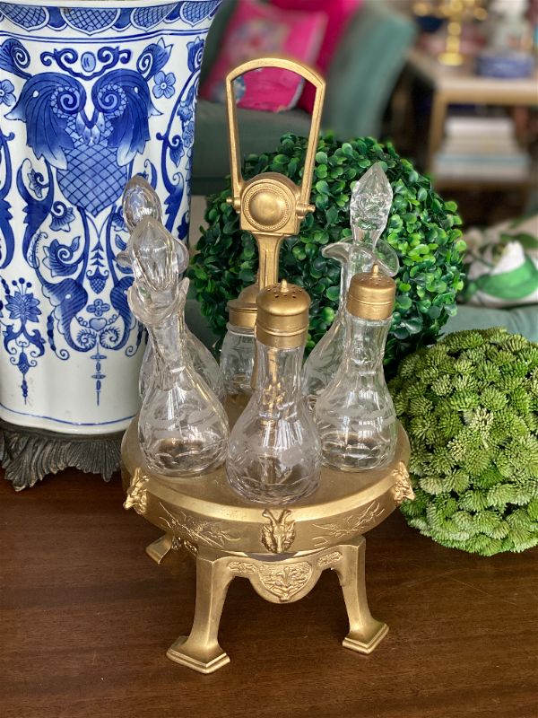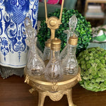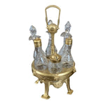 Antique Cruet Set, Gold Leaf on top of silverplate 1800's, Stand with 6 Crystal Containers