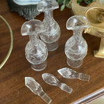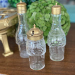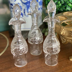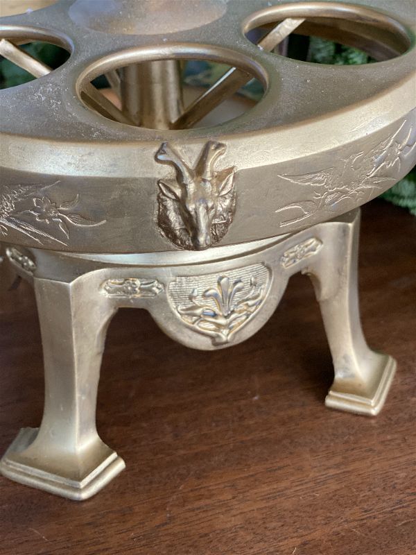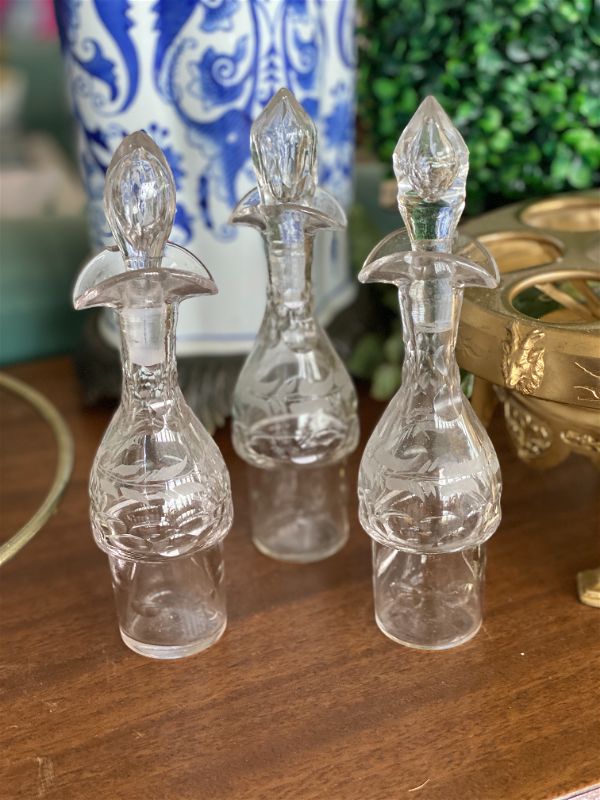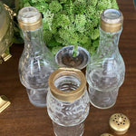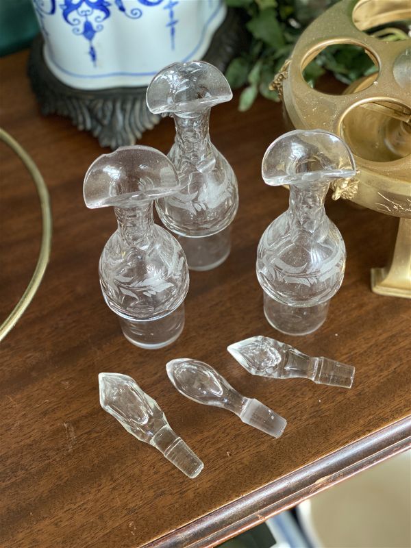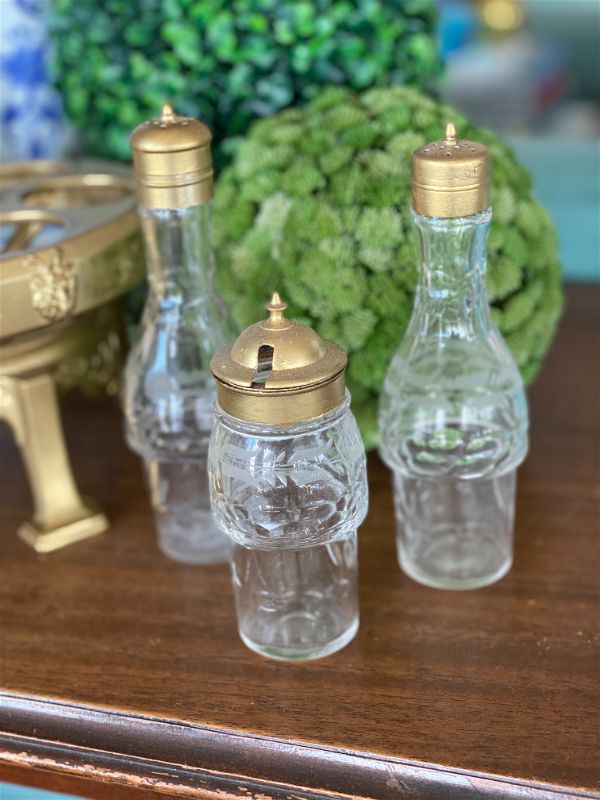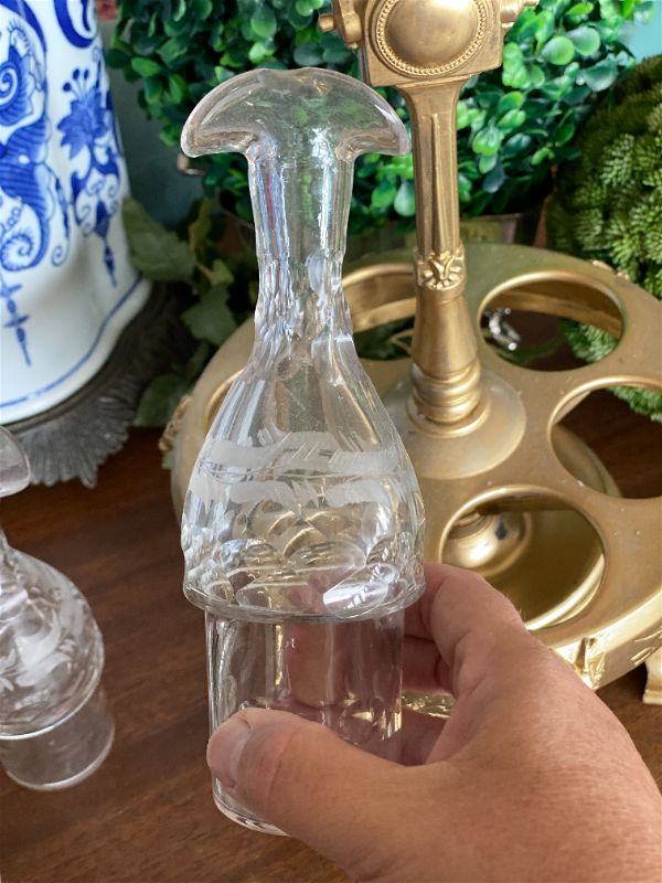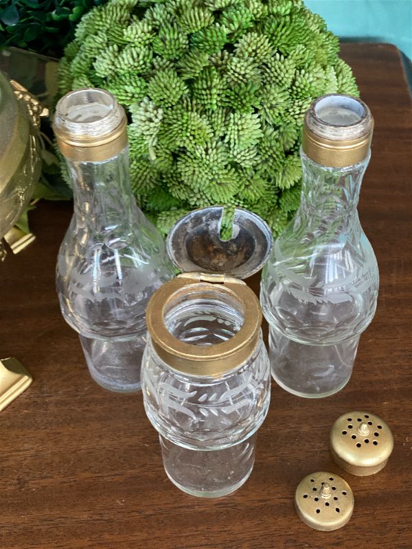 Antique Gold Leaf on top of silverplate 1800's cruet set of 6 crystal containers with 3 stoppers. This beautiful ornate cruet set is in great vintage condition. The 6 crystal glass containers and cruets are beautifully etched to match. The gold leaf frame base is beautifully embossed and stands 15" tall. This antique Victorian cruet set is lovely and great for use, or would make a wonderful table display. See picture details as they are part of the description.
