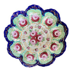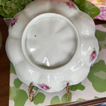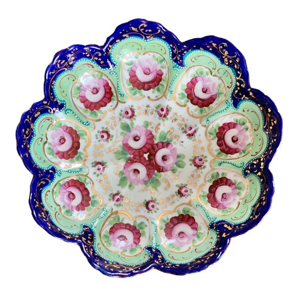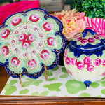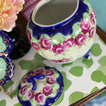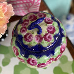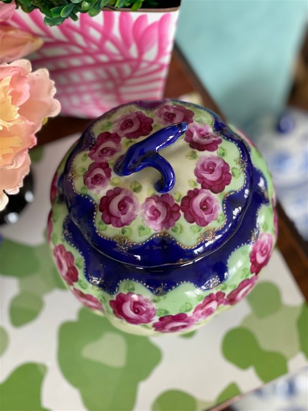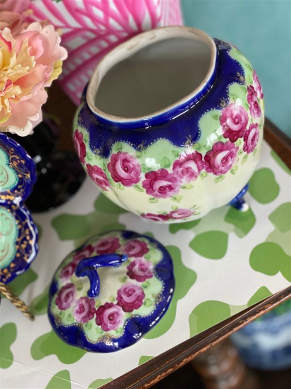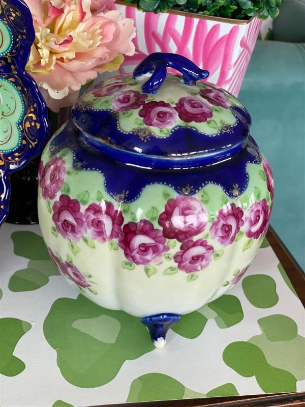 Love a colorful, vintage find? This antique Nippon Lidded jar, potpourri bowl is hand painted in lovely pink and green florals with a vibrant blue and white background. An amazing, colorful addition to any shelf, tabletop or vintage vignette. Perfect for storing small valuables, cotton balls, sweetener packets or as a stand alone Ornate top and footed jar. Nippon fine bone china is always a rare and special find. Plate sold separately.