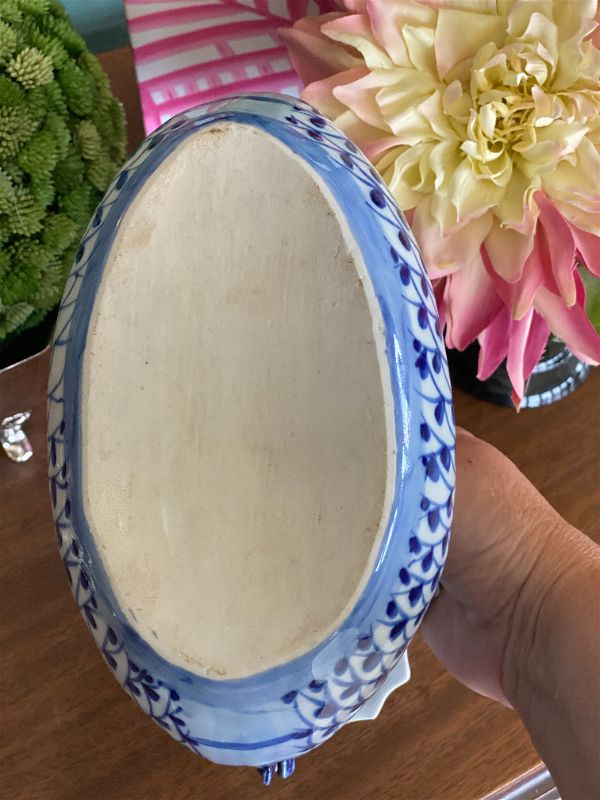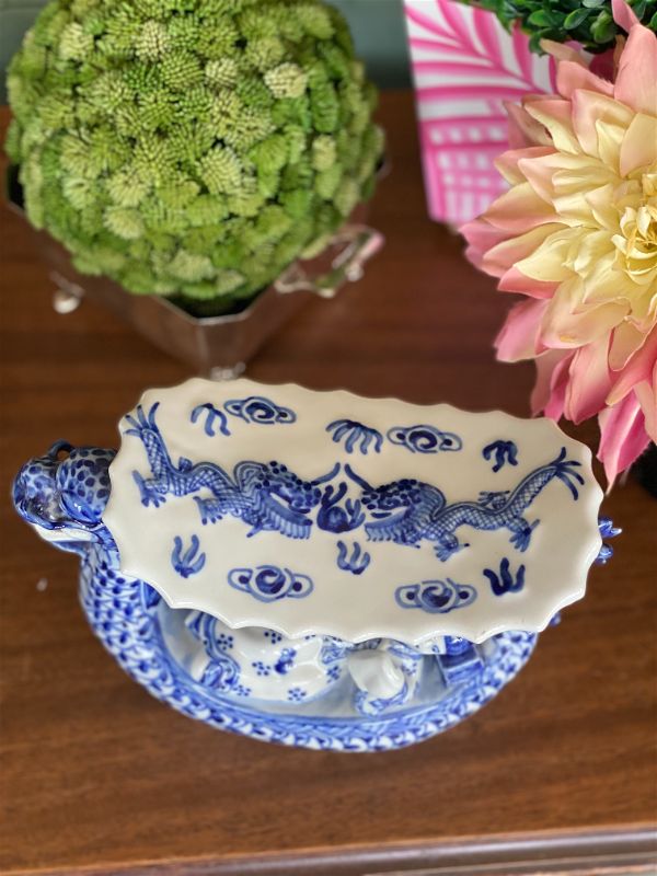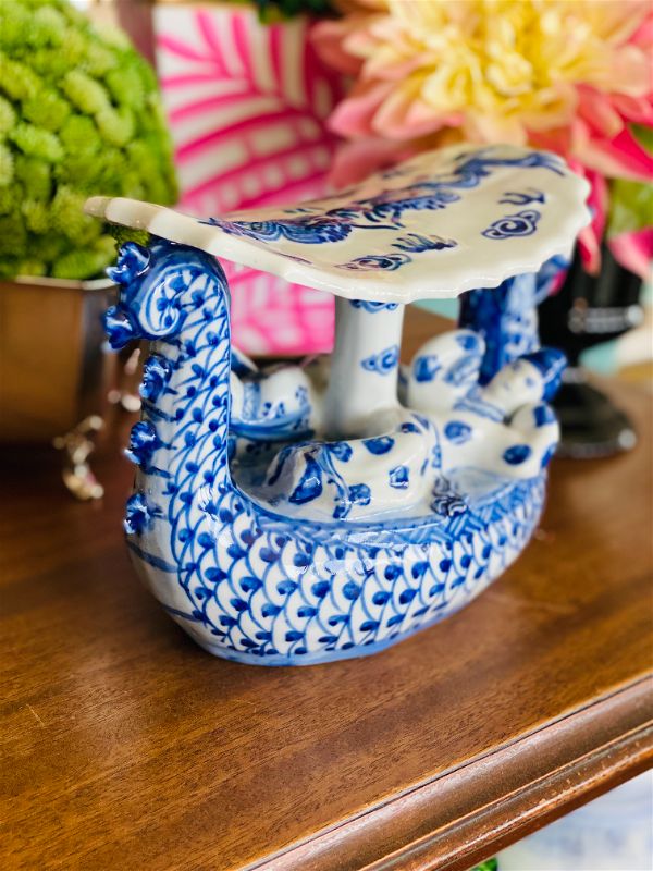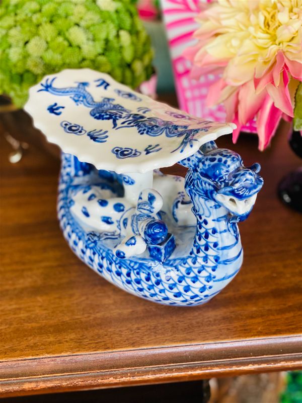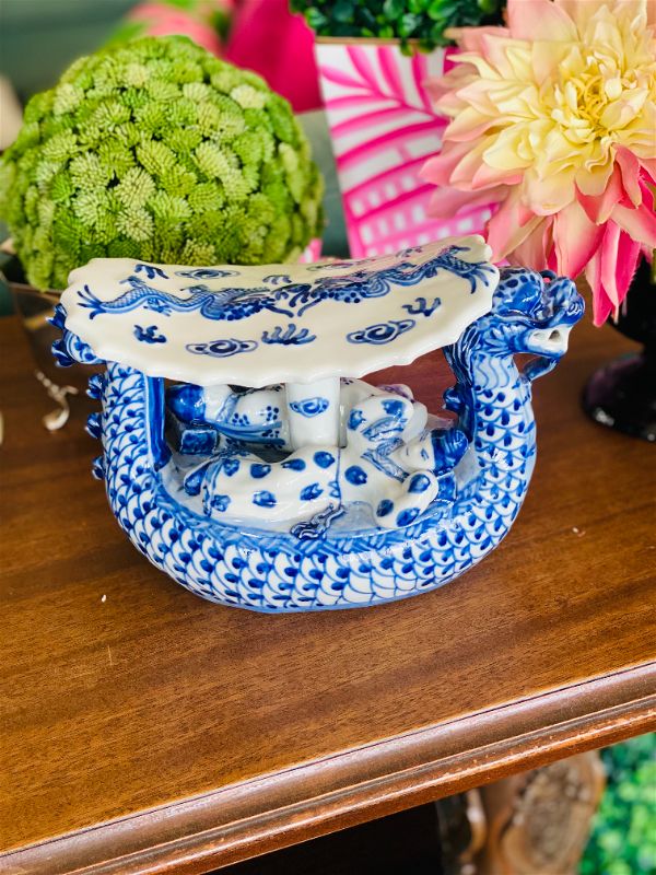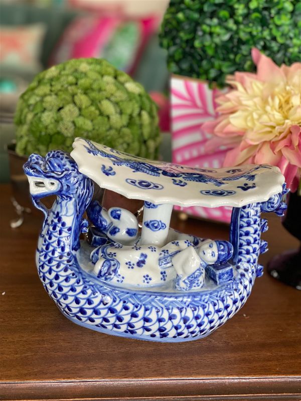 Dragon lovers this is for you! An amazing blue and white chinoiserie Opium Asian Dragon Pillow! The detail on this piece is phenomenal. Looks like a pagoda being paddled down a river with passengers lounging on either side. A fun and whimsical figurine that is sure to spark conversation. Pristine vintage condition.See picture details as they are part of the description.