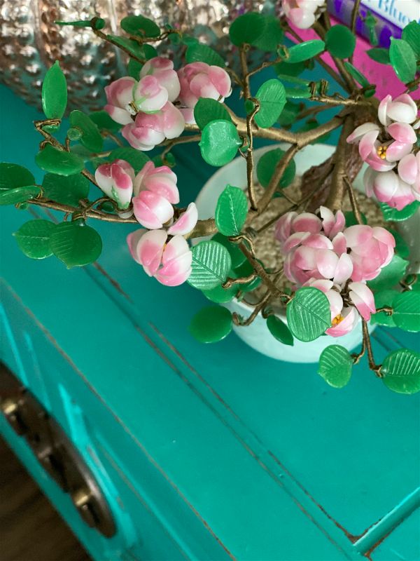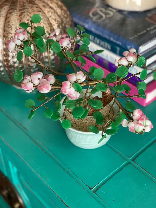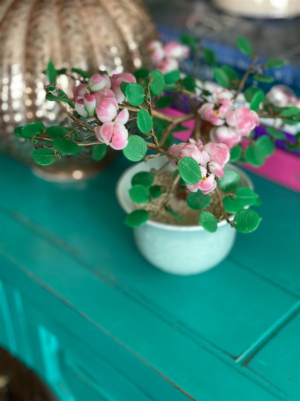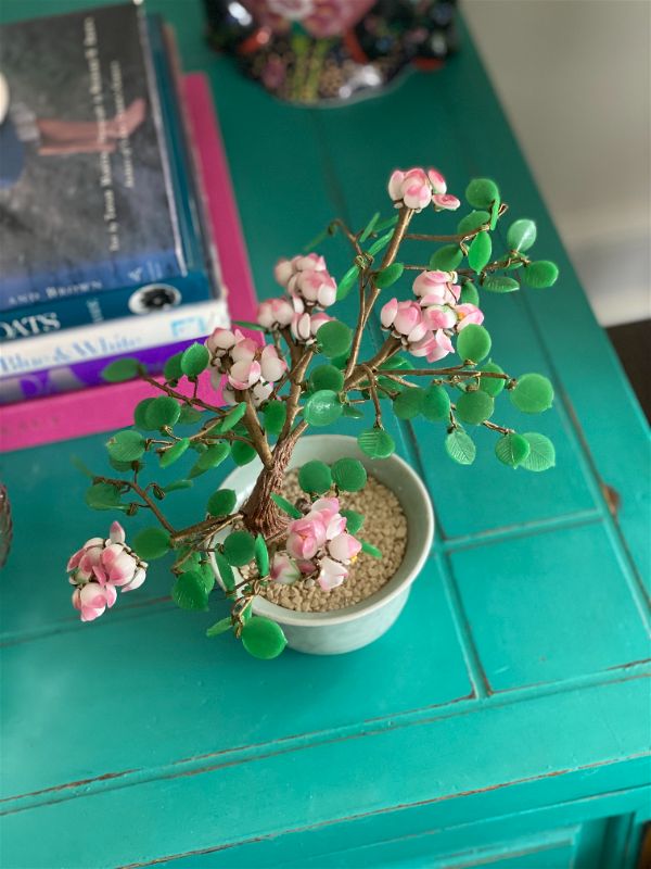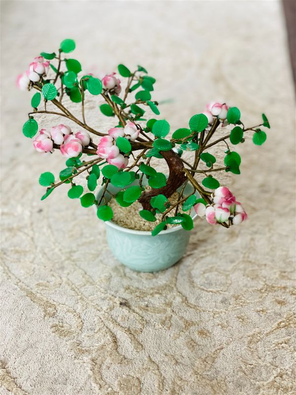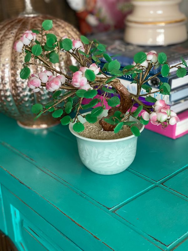 Add some Asian decor to your home with this amazing pink and green vintage Jade style Bonsai tree. This decorative tree shows pink cherry blossoms with bright green leaves in a celadon ceramic pot. It's in amazing condition, leaves and blossoms are easy to "fluff" to create a full tree look. Great on a shelf or side table. Add to your Jade tree collection or start one. See picture details as they are part of the description.