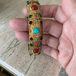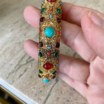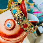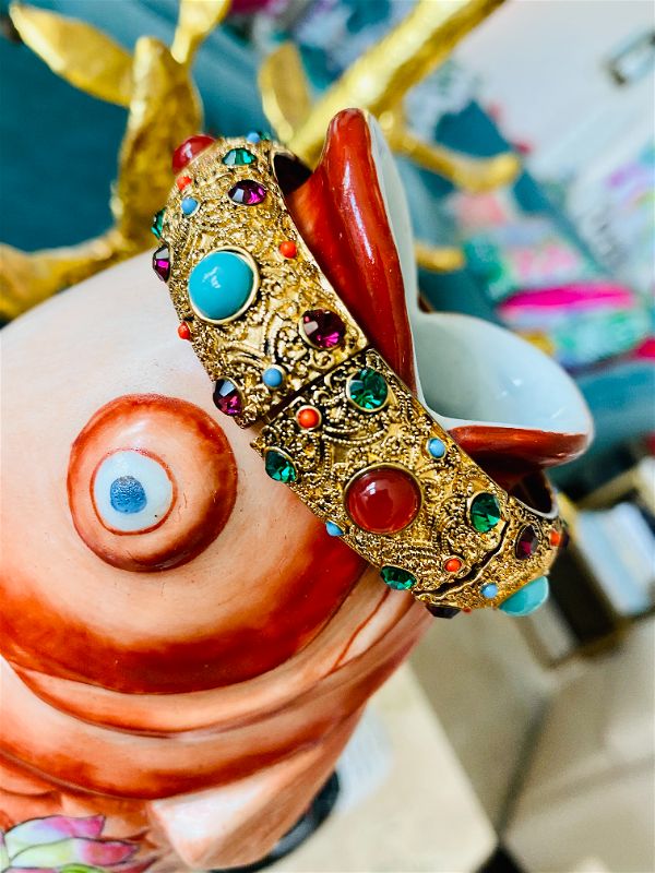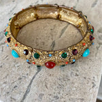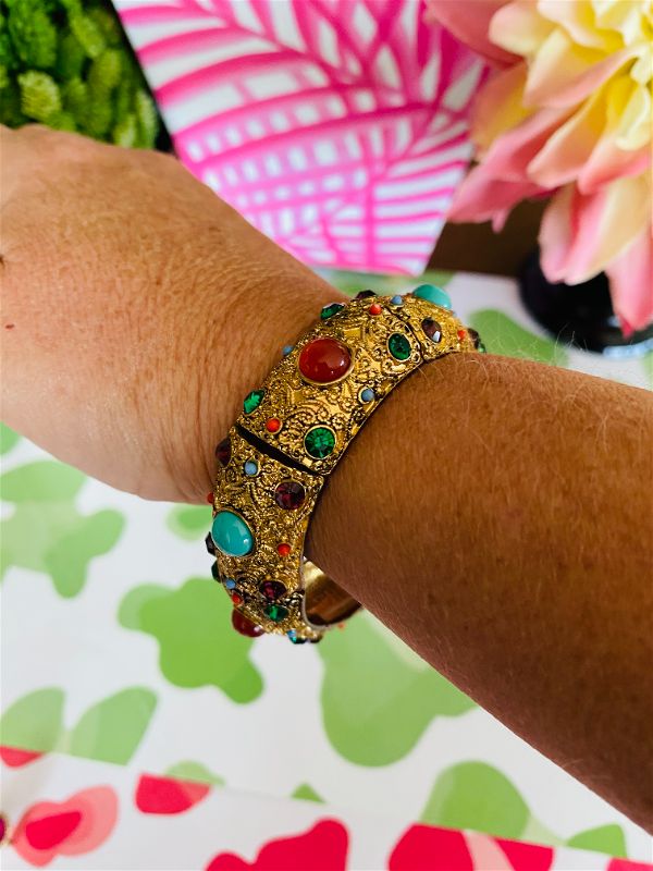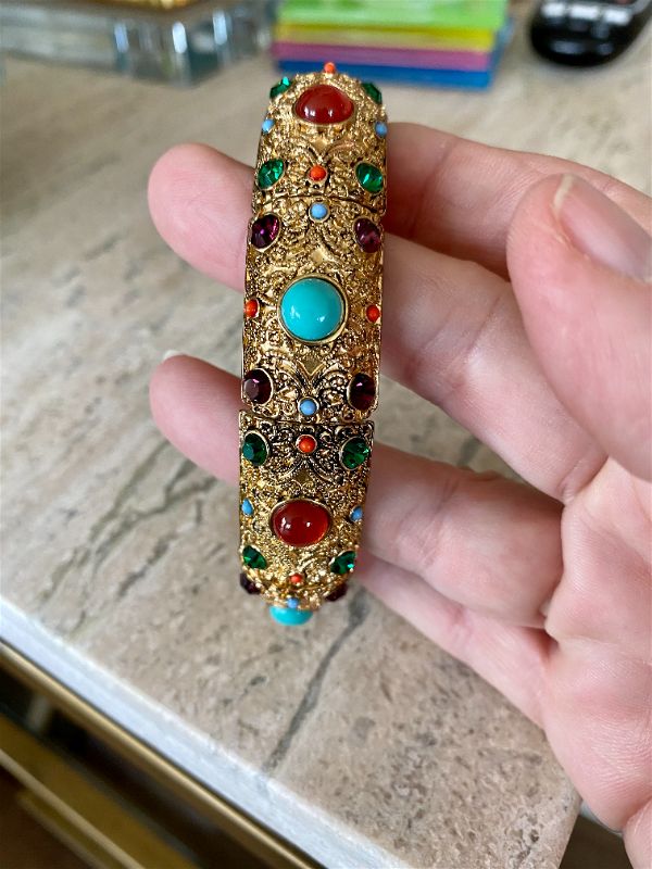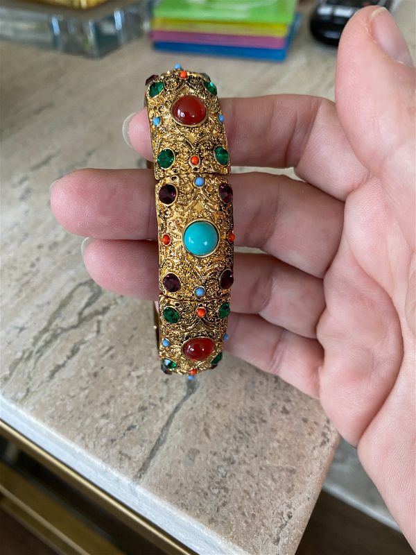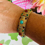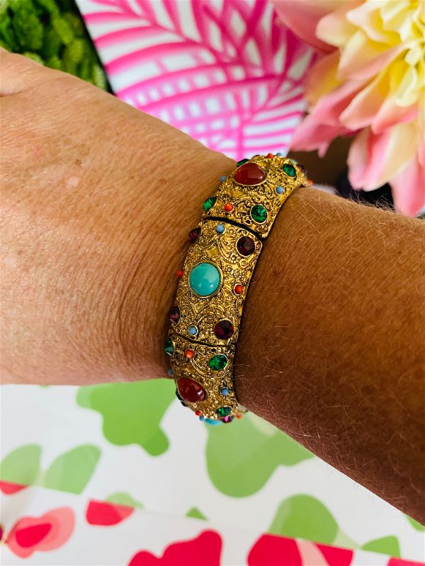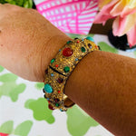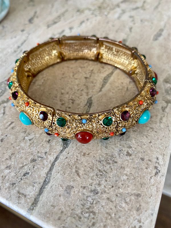 this amazing Heidi Daus Crystal Rhinestone Cabachon Stretch Bracelet is in pristine condition. I love the colorful stones and intricate gold detail. This fits a larger wrist size. A great piece to wear dressed up or dressed down. It really does go with anything!! High quality and a rare find!!