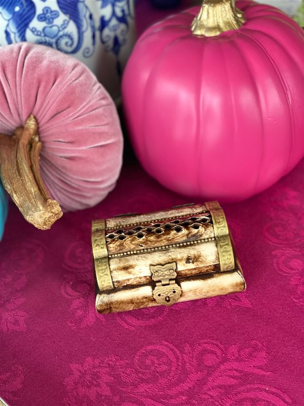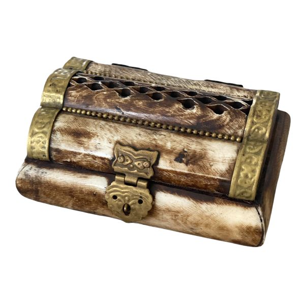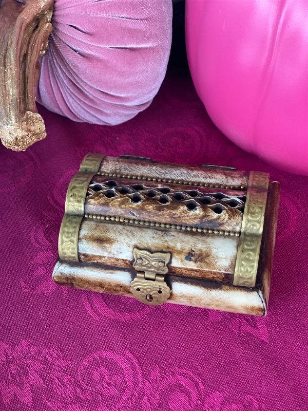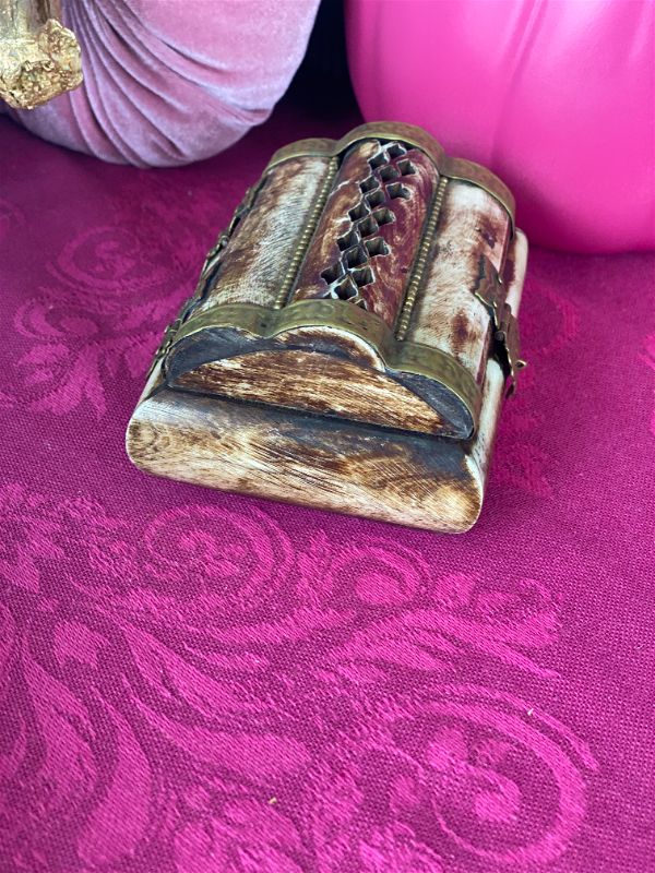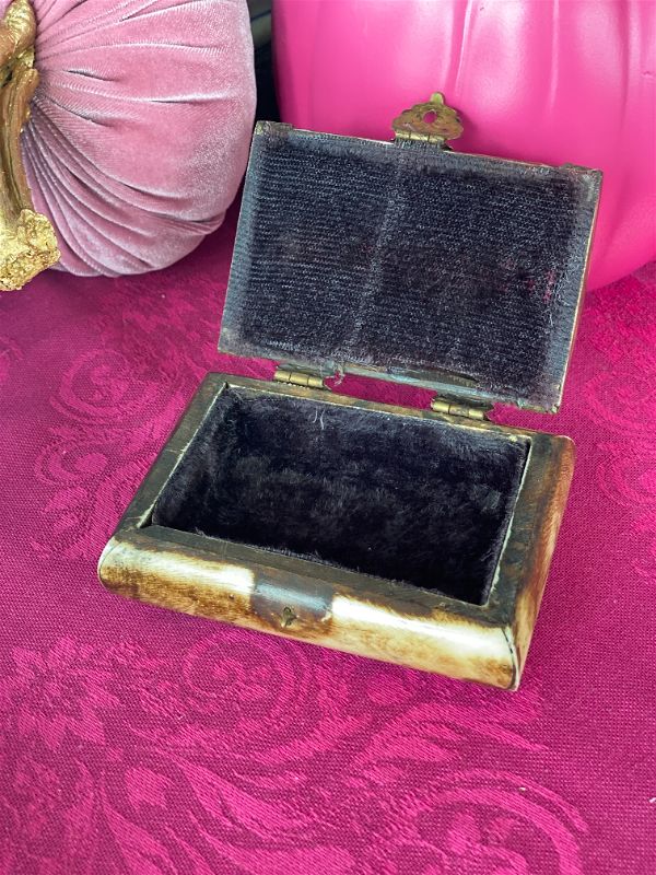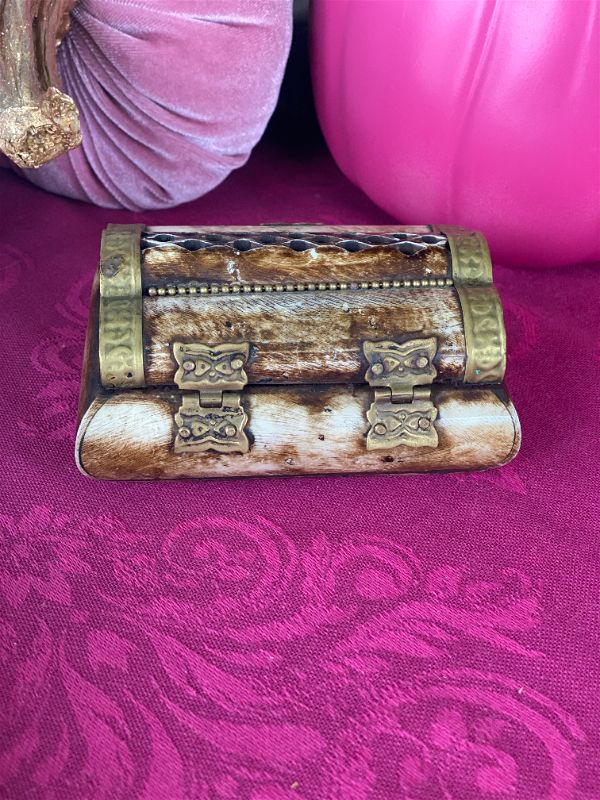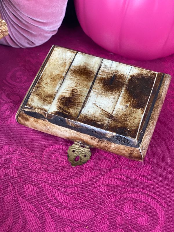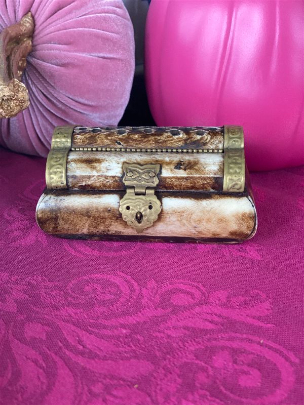 Me neither, but i knew I had to grab this. Amazing brass hinged detail and enclosure adds to the unique style of this bone trinket box. Hand crafted and ready to hold small valuables such as jewelry, coins or love notes. The brown and gold coloring adds warmth to a space. Great to add to a stack of books, shelf display or maybe a collection of trinket boxes. Amazing vintage condition. See picture details as they are part of the description.