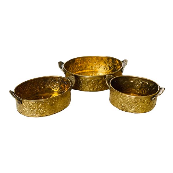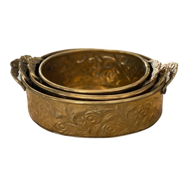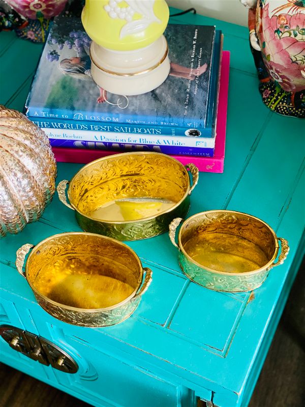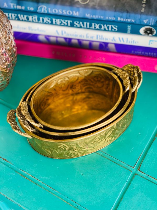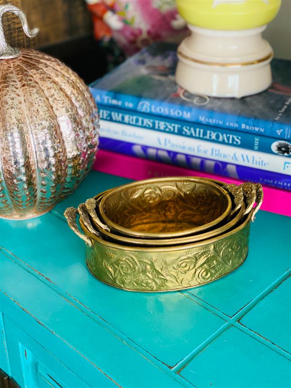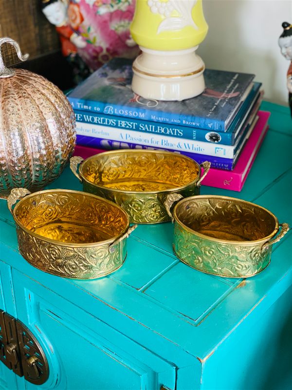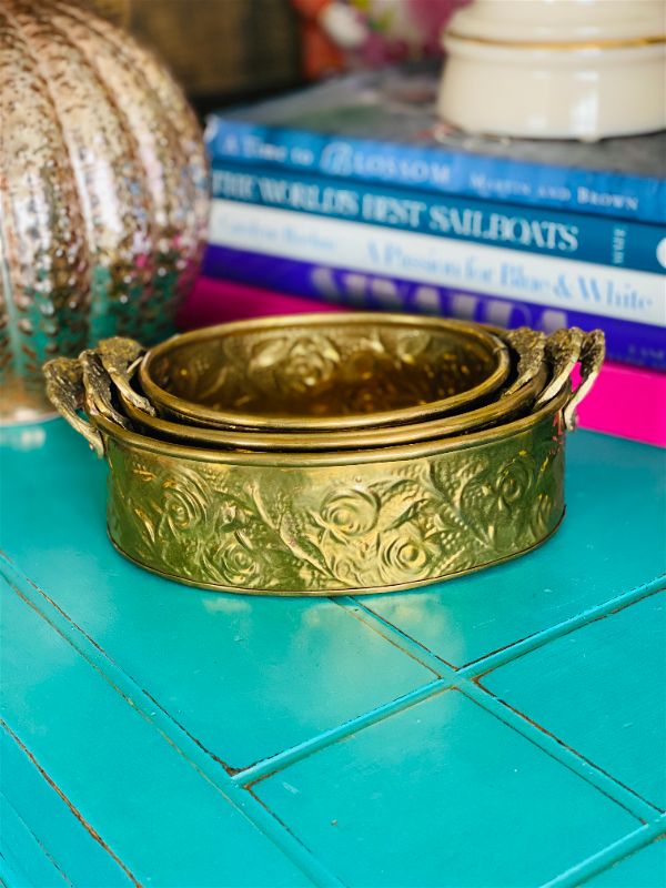A gorgeous Vintage set of 3 Brass planters ready to fill with paperwhite bulbs for the holidays. Use them for plants or succulents, or for storage of office supplies, kitchen essentials, make up or toiletries. Each has a matching hammered metal floral pattern with decorative and functional handles. Great to fill and give as gifts, too.