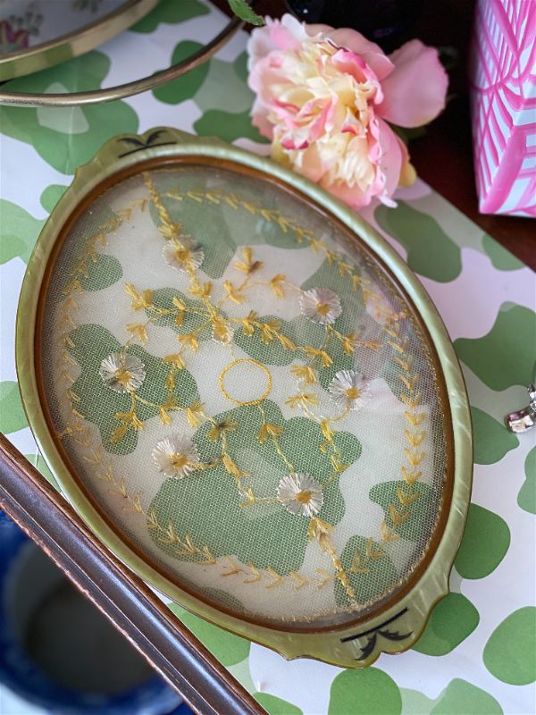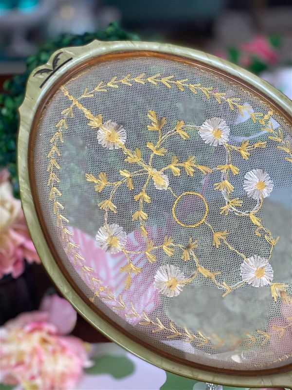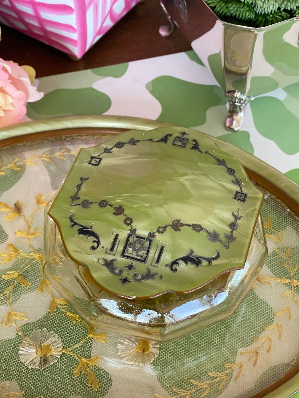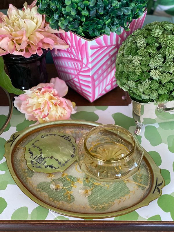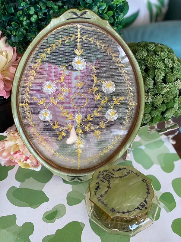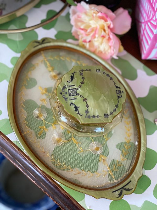 1930s antique celluloid Bakelite Green Vanity Set w/ flower stitched tray and powder jar