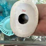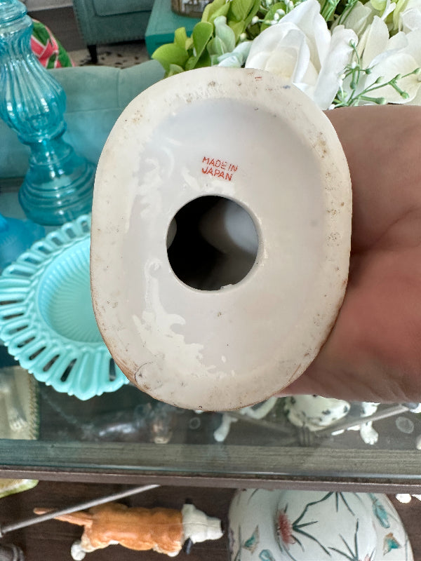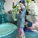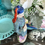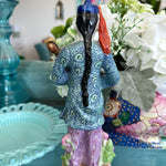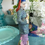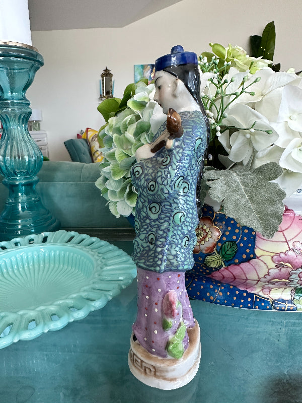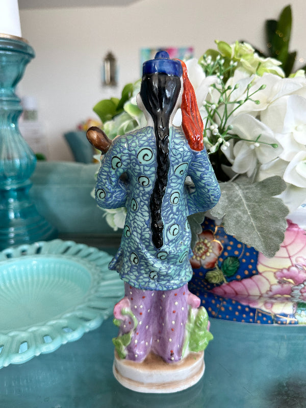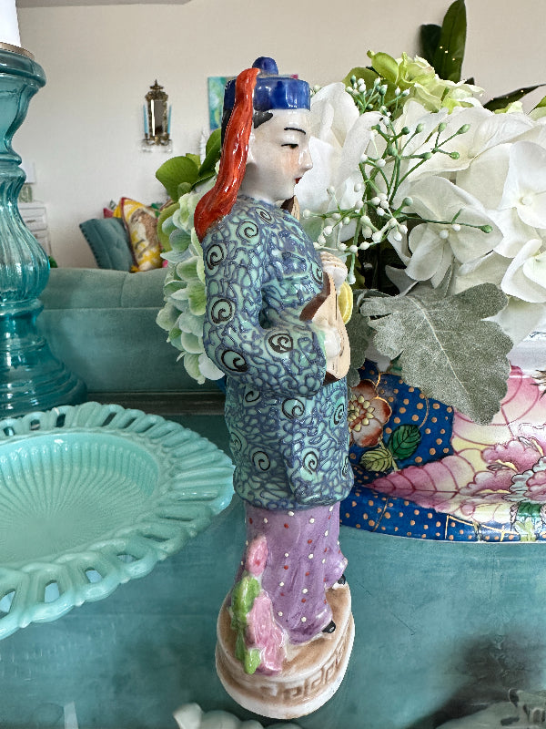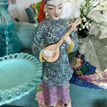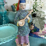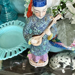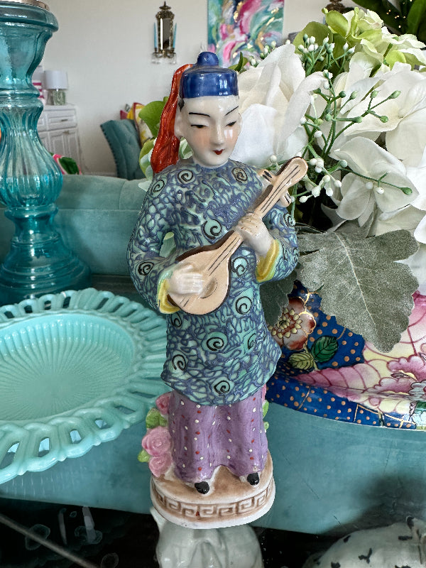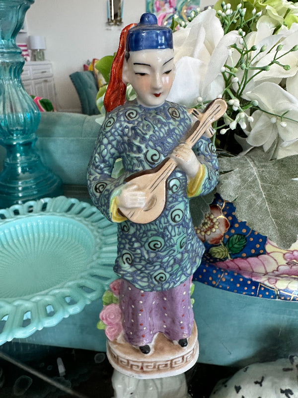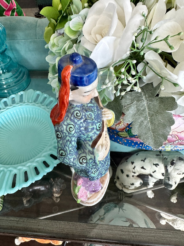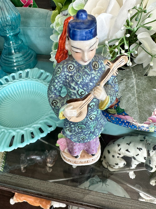 This Asian figure is playing a string instrument dressed in traditional garb. Bright colors of aqua, blue, green and purple. He stands on a greek key pedestal. A long braid flows down his back. This is perfect for a shelf or vignette. Great vintage condition. No chips or cracks.