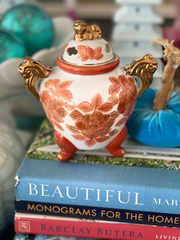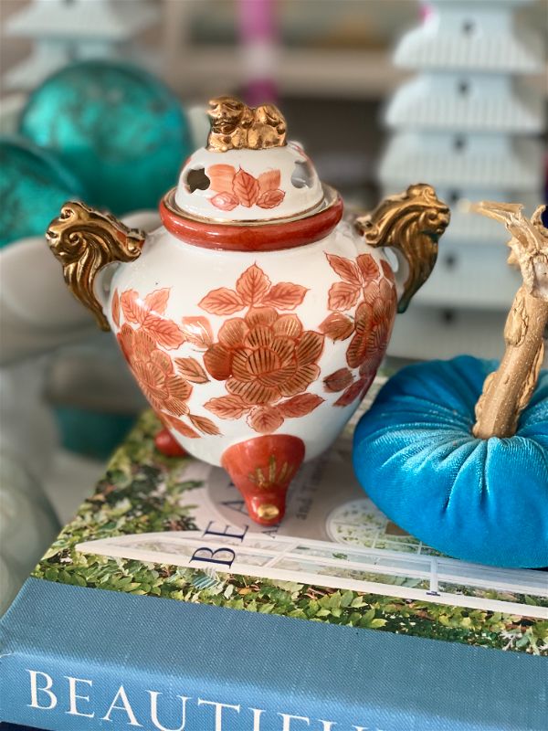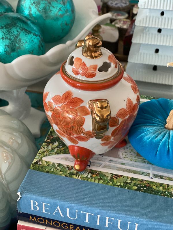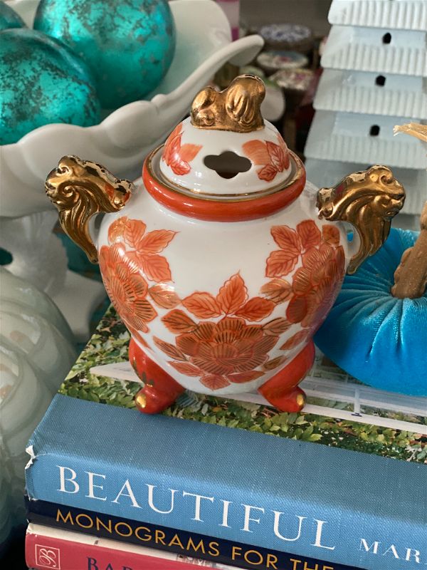 This is an amazing Vintage Japanese porcelain orange, white, gold Sensor with foo dog accent . Love the coloring for Fall, and the added touch of gold handles and foo dog on top of the lid really makes this piece extra special. Asian vintage sensors are a fun item to collect, although hard to find. Use as a display piece, for storage of small valuables, or to burn incense. See picture details as they are part of the description.