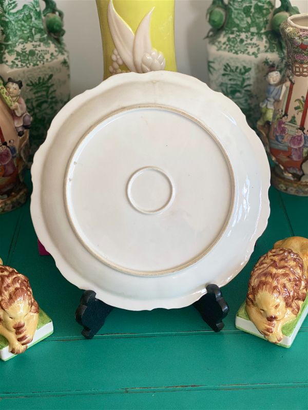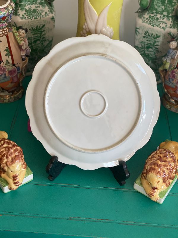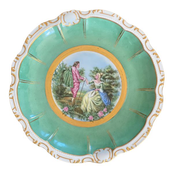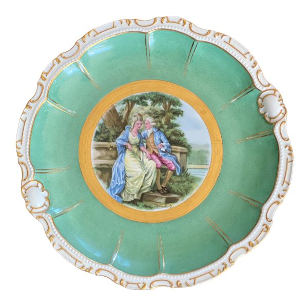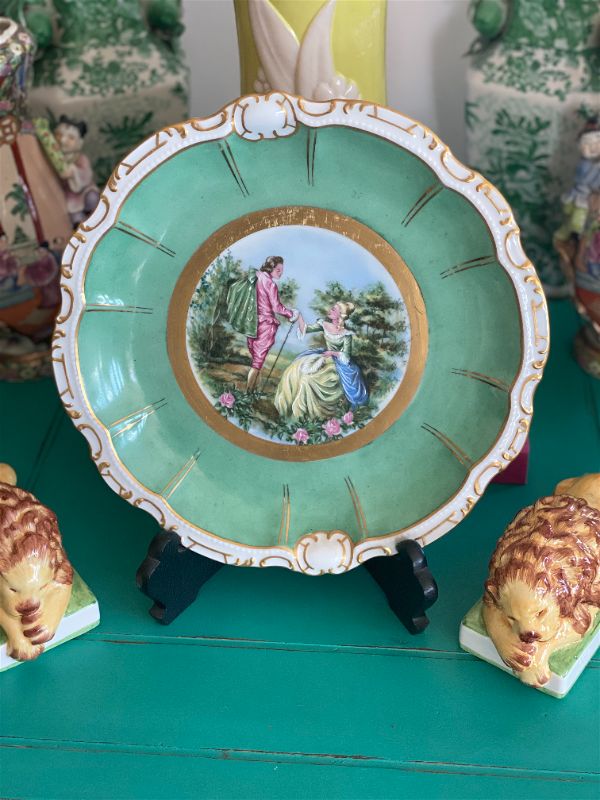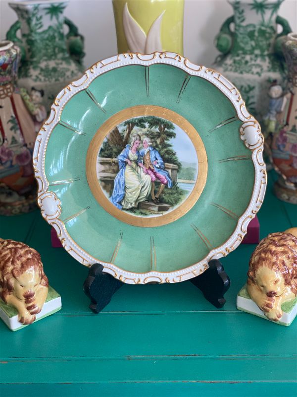 These Large Decorative Antique Courting Plates are perfect for a china cabinet or plate wall. They are in amazing condition for their age. A beautiful green with touches of white and gold. The center scenes of a courting Victorian couple is handpainted with pops of pink, green, yellow and blue. These have been lovingly cared for and are a generous size. Each sold separately. See picture details as they are part of the description.
