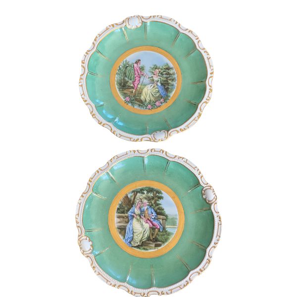 Antique Courting Plate, Green and White, Decorative, 2 Available