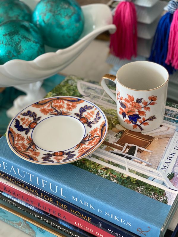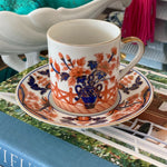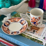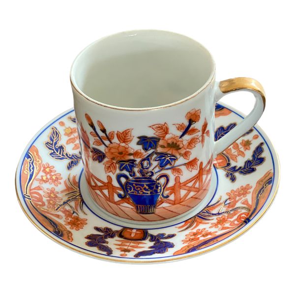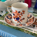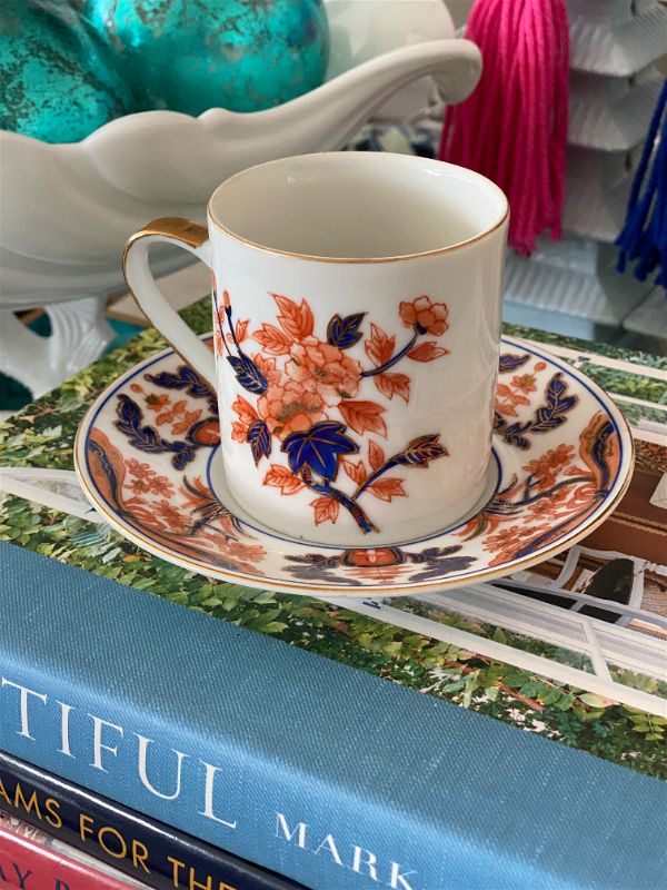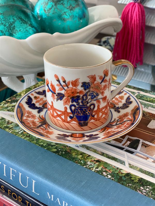 This vintage 1940s LJ Japanese teacup has vibrant colors of with a white background. Hand painted with a blue and gold urn, orange fencing and floral design. Pristine vintage condition. Ready to use for your next tea party or ladies lunch. Perfect to display with your collection. See picture details as they are part of the description.