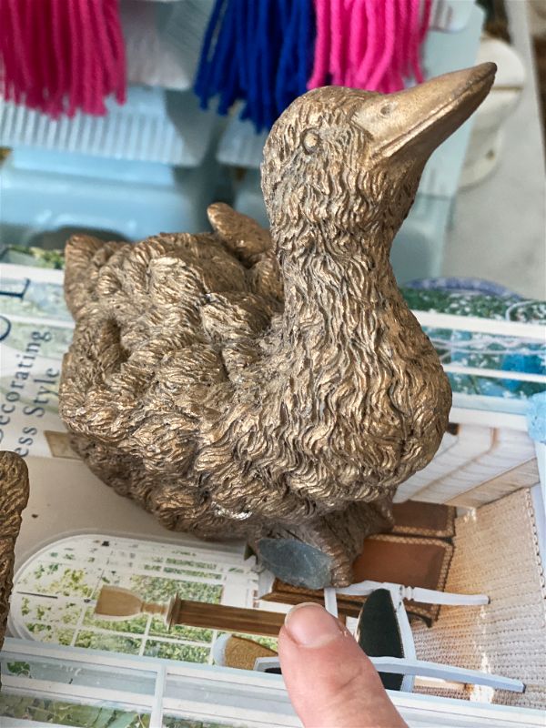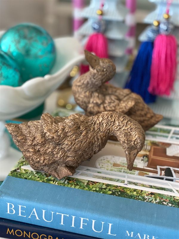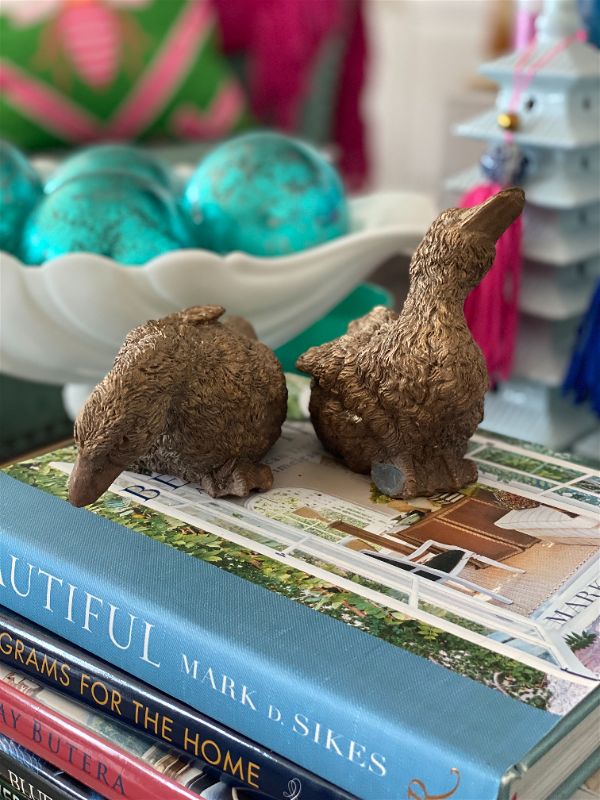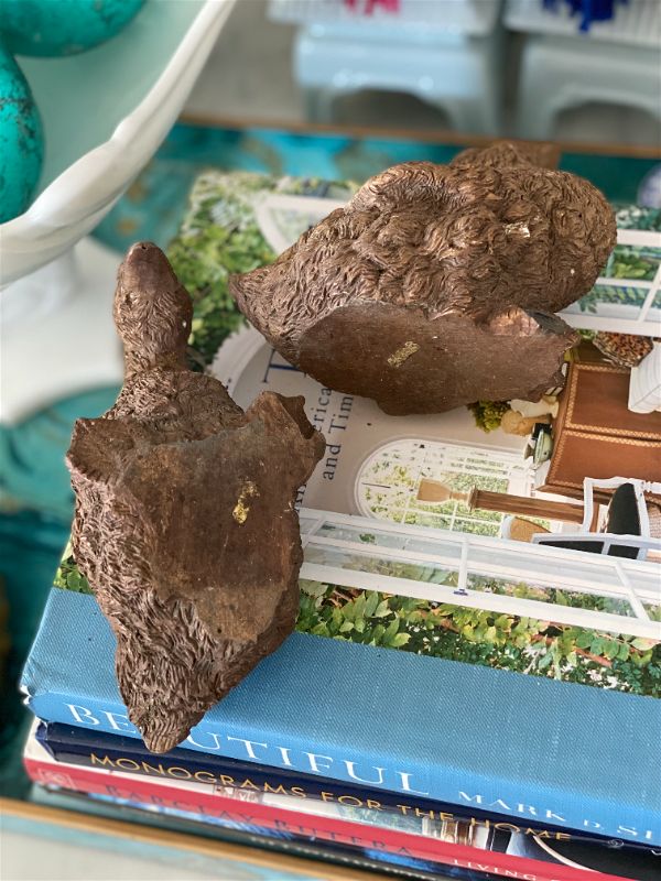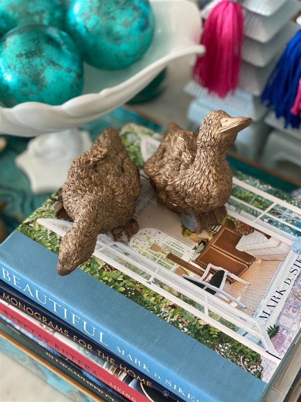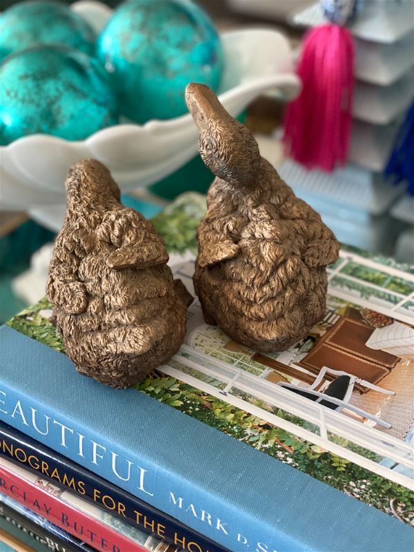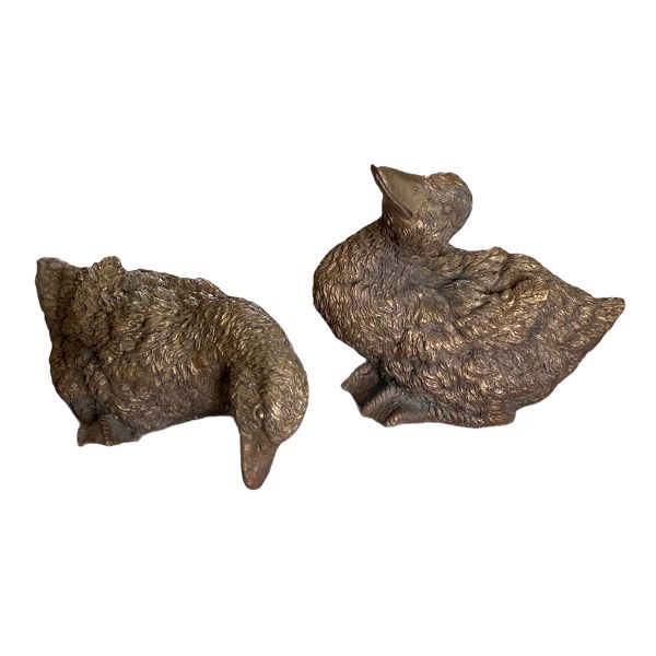 This sweet pair of vintage ducks with a bronze like finish are a cute addition to your Spring decor. They are made out of resin, one has a slight chip on it's foot, otherwise great vintage condition. Detailed feathers and heads turned make these whimsical and fun. See picture details as they are part of the description.