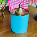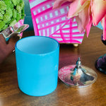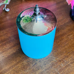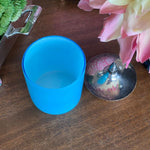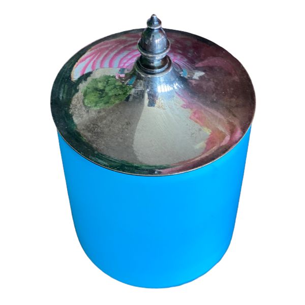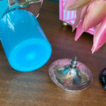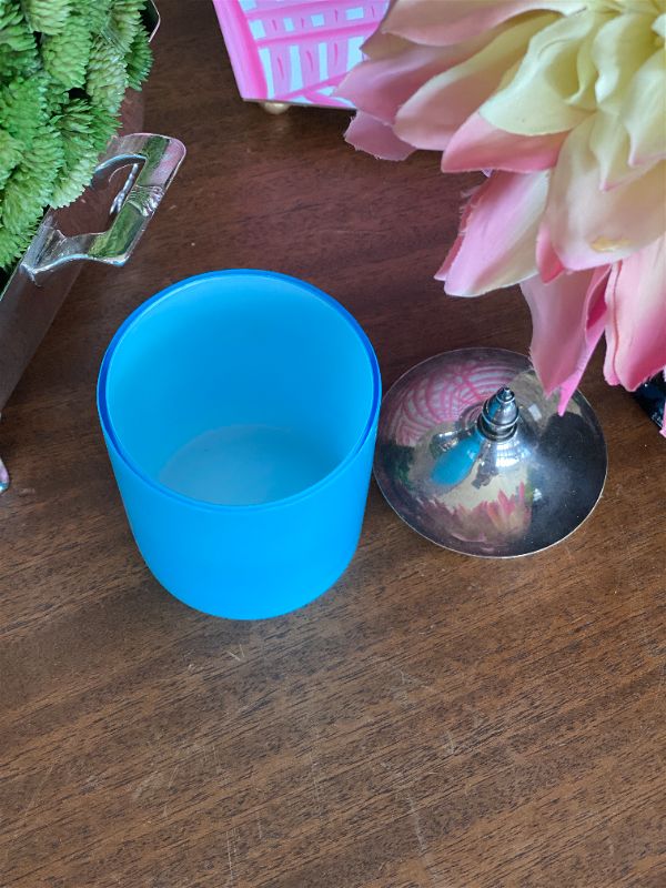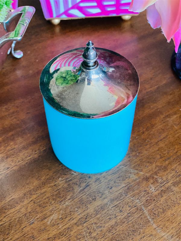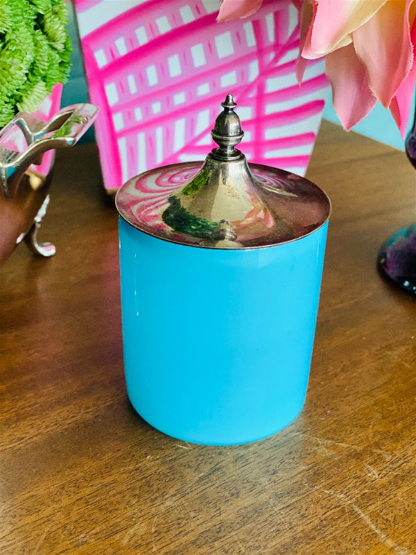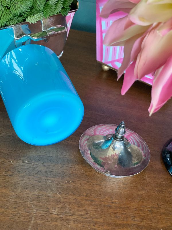 A lovely Portieux Vallerysthal vanity jar with silverplate top perfect to display on a mirrored tray with other vintage glass bottles and jars. Amazing turquoise blue color. Fantastic vintage condition. Use it to store q-tips, cotton balls, band aids, small desk items. A highly collectilbe and rare find for sure. See picture details as they are part of the description.