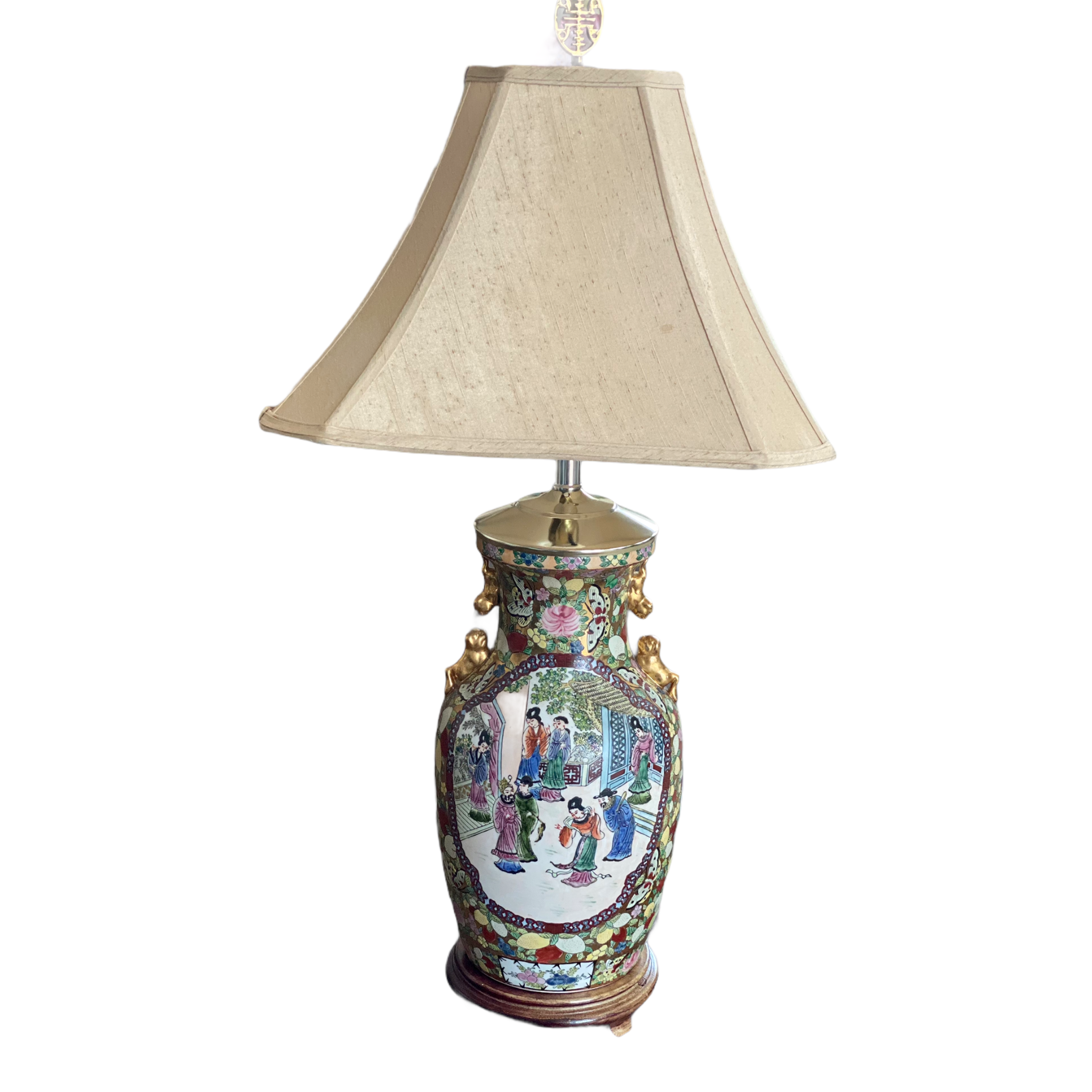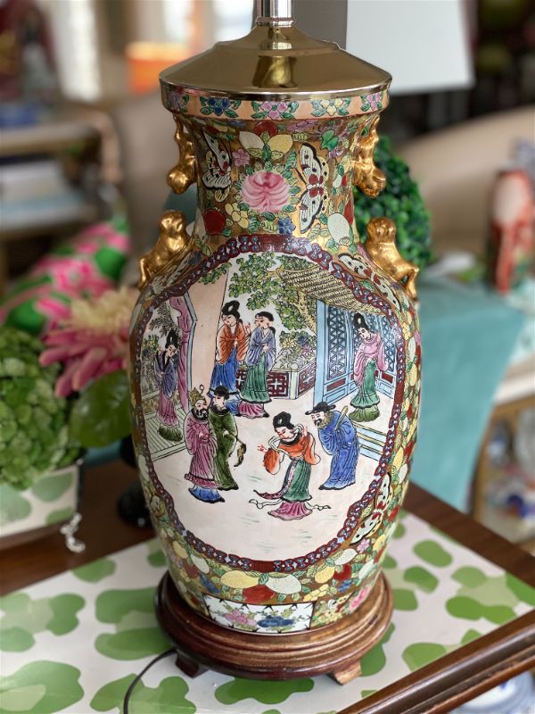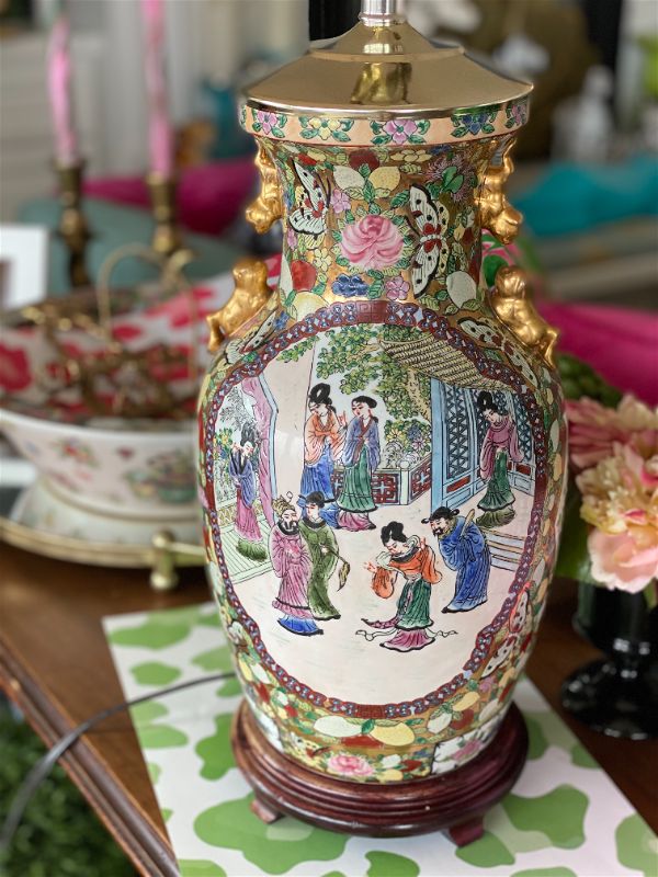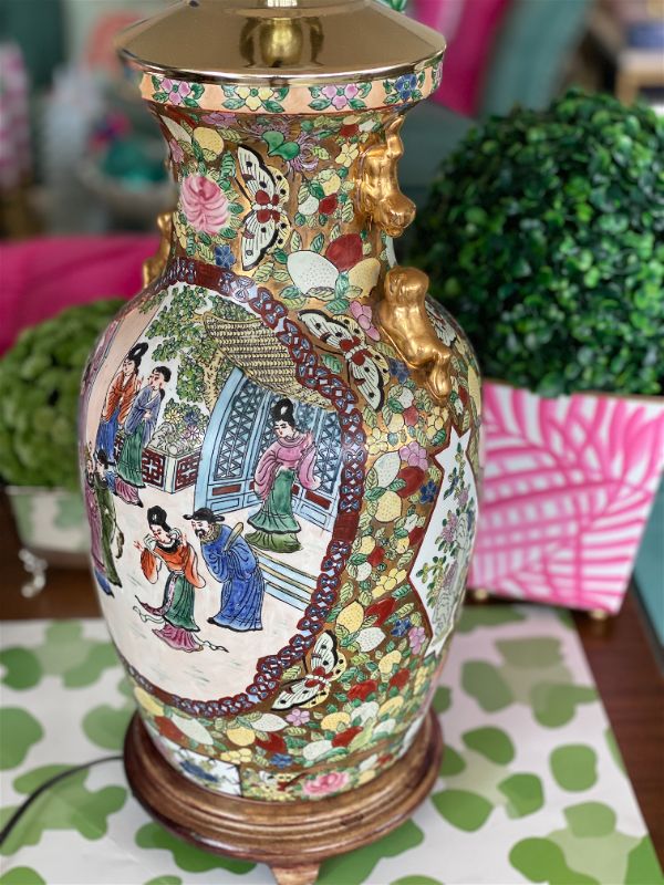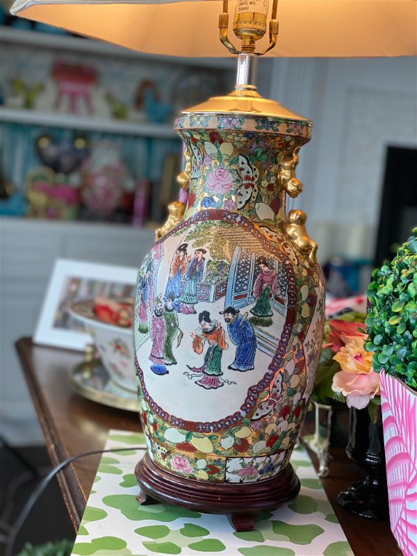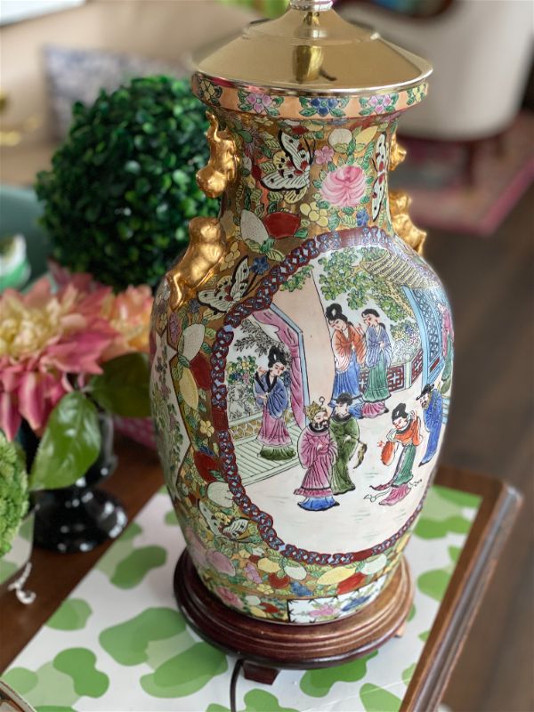 Bold and bright colors decorate this amazing vintage Famille Rose Medallion Lamp. Gold detail, Shade is optional. Pretty Asian style brass finial. Handpainted scene of geisha ladies in a garden. Wooden base. Nuce size for end table bedside table. Great vintage condition. See picture details as they are part of the description.