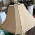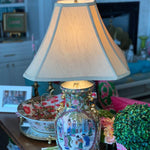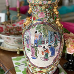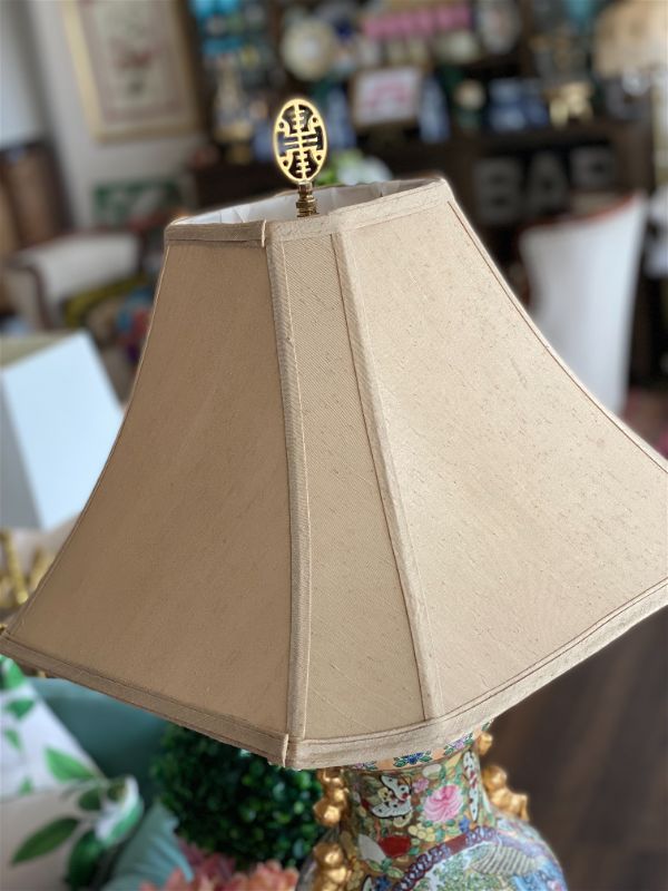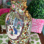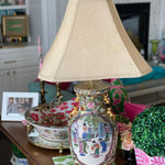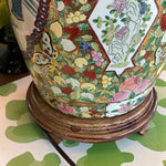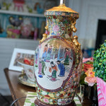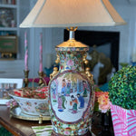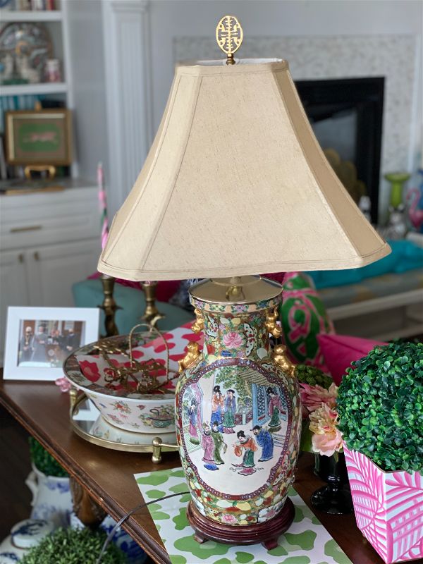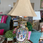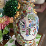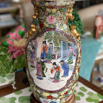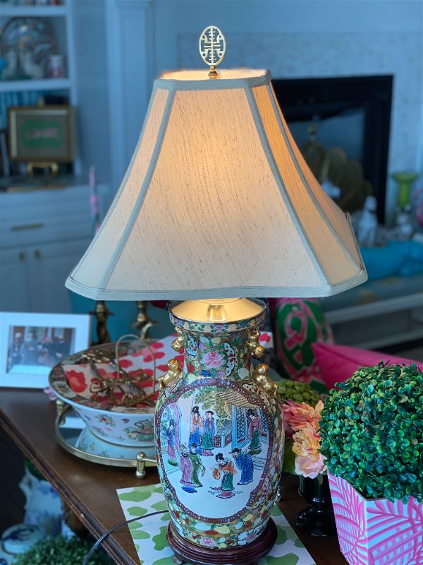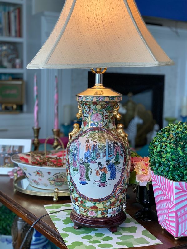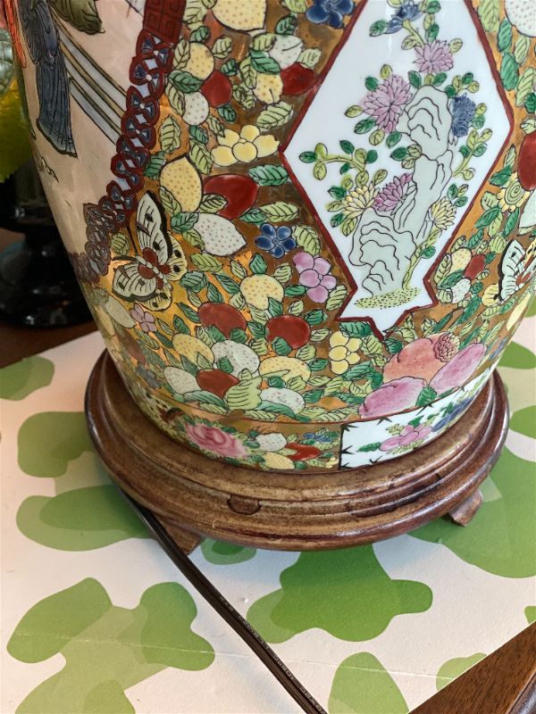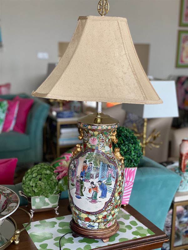 Bold and bright colors decorate this amazing vintage Famille Rose Medallion Lamp. Gold detail, Shade is optional. Pretty Asian style brass finial. Handpainted scene of geisha ladies in a garden. Wooden base. Nuce size for end table bedside table. Great vintage condition. See picture details as they are part of the description.