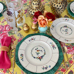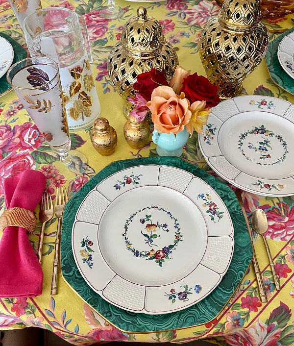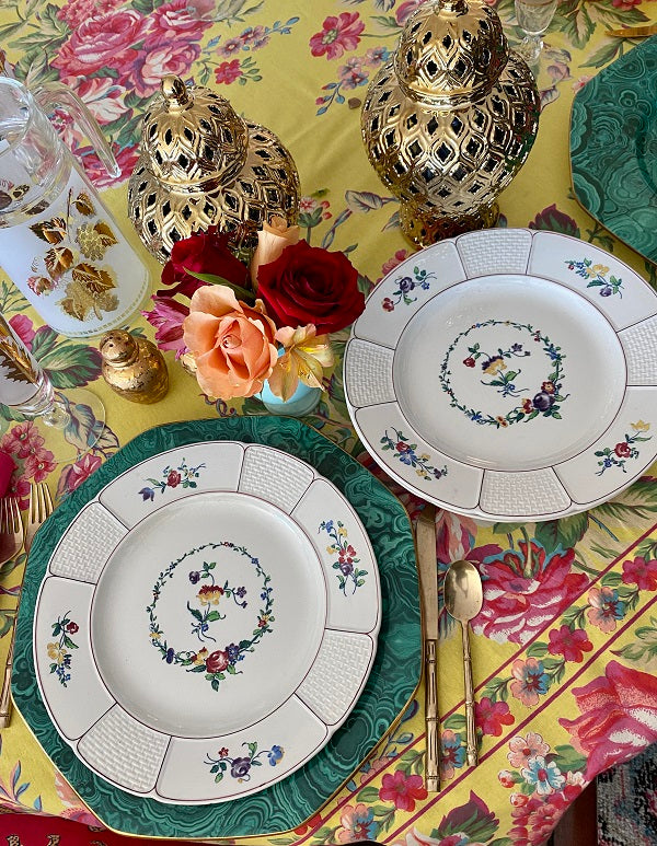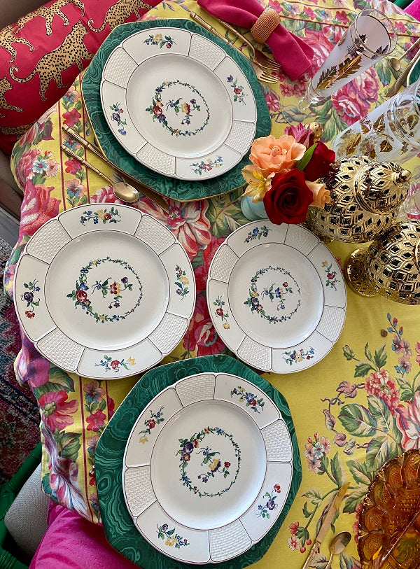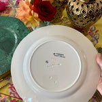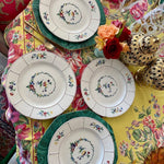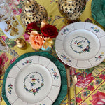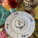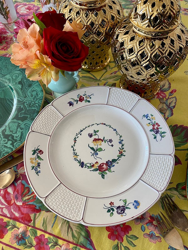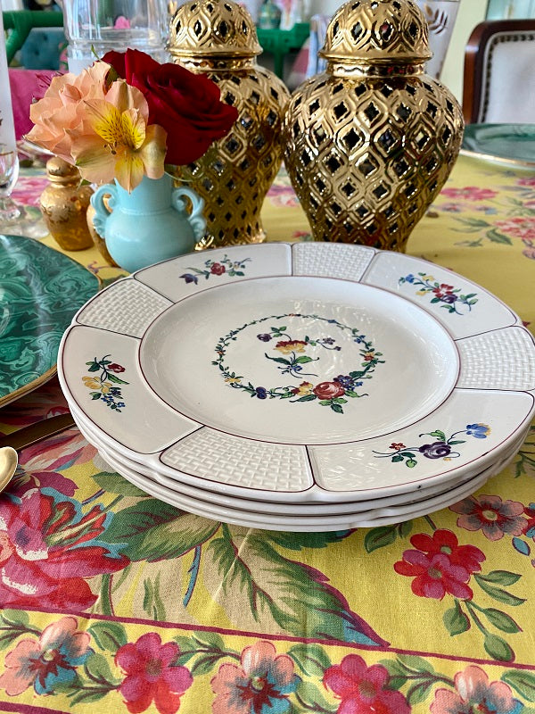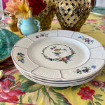 This highly collectible set of dinner plates has a white background, basketweave pattern with colorful flowers. A floral wreath with red, gold, blue and green colors circles the center of each plate. Great for your Fall dinner table. Mix and match with other vintage/antique plates. Stamped and imprint marks on the back. Great condition no chips or cracks.