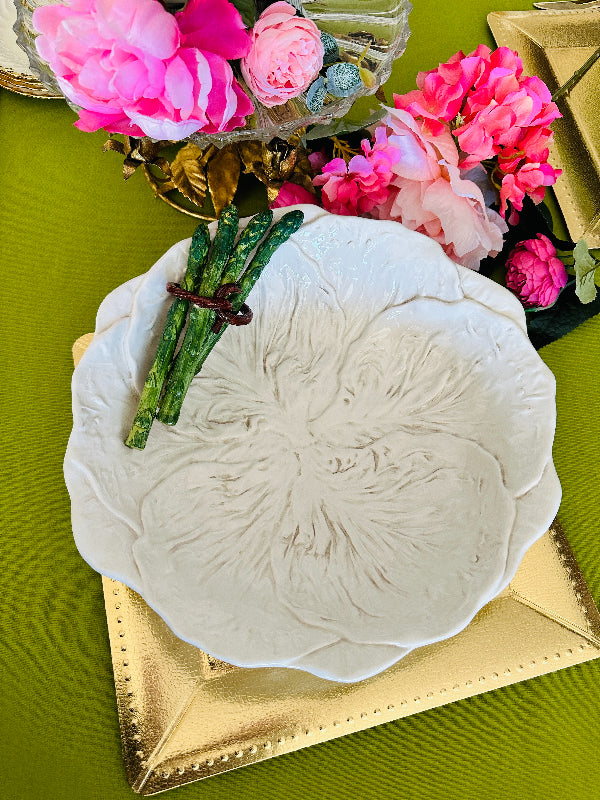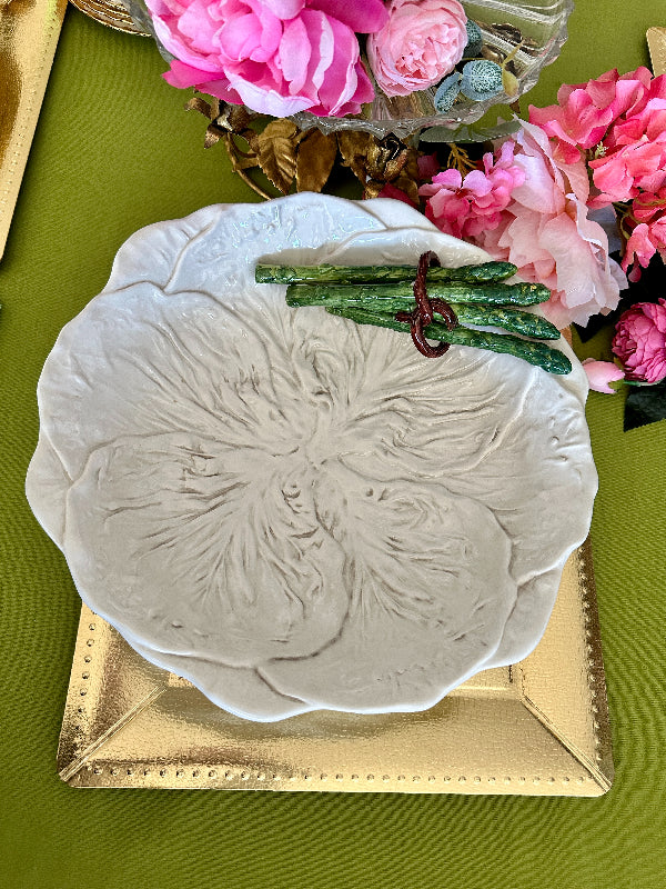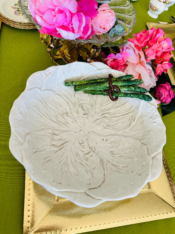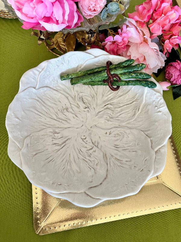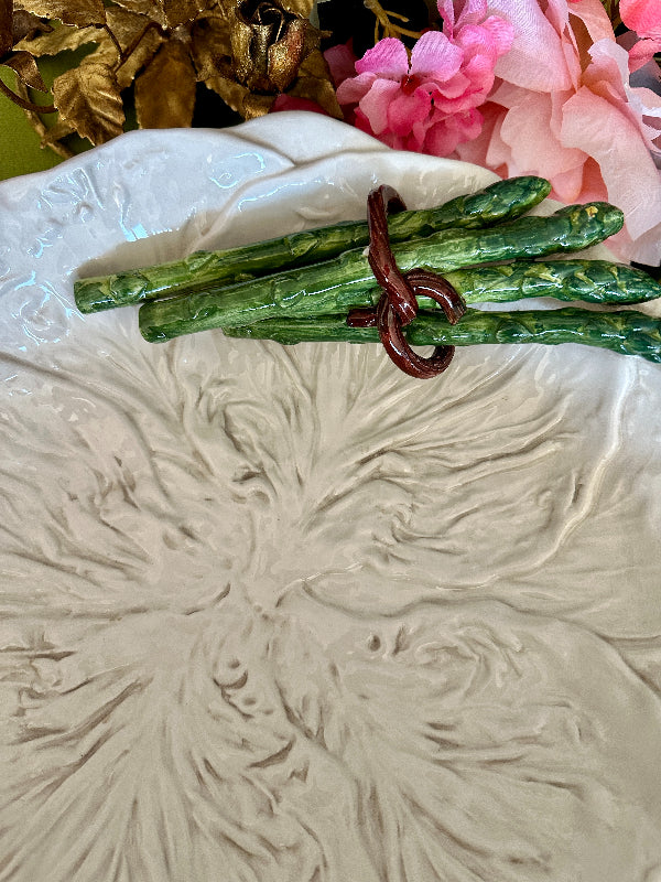 Cabbage leaf dishware is all the rage these days! This platter fits right in with the trend. This gorgeous white cabbage leaf bowl is a generous size. It has porcelain asparagus bundled on the side that looks like the actual food. This is so meticulously designed it feels like a piece of art. Perfect for serving your favorite sides,salad or appetizer for your Spring gathering. Slight wear on the ridges inside the bowl otherwise in great vintage condition. No chips or cracks.
