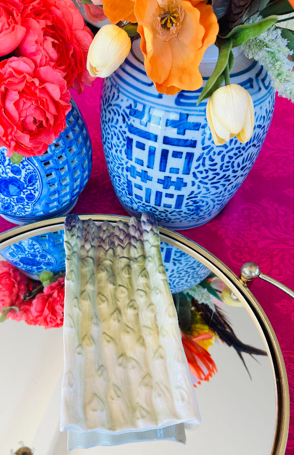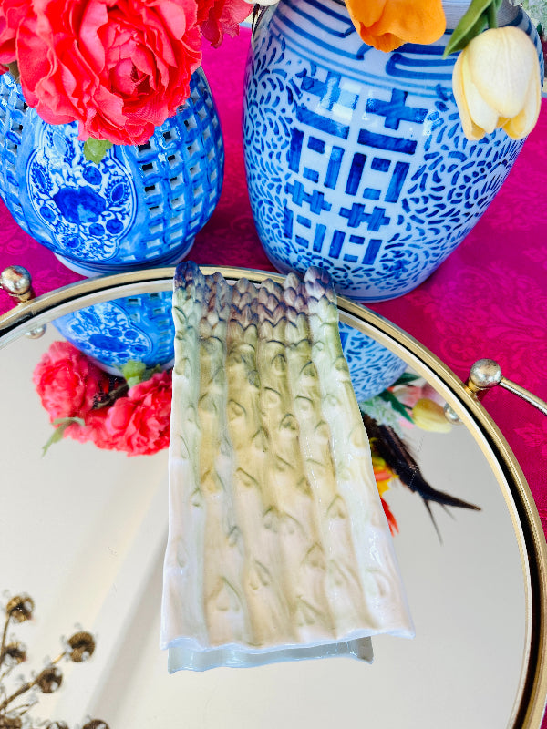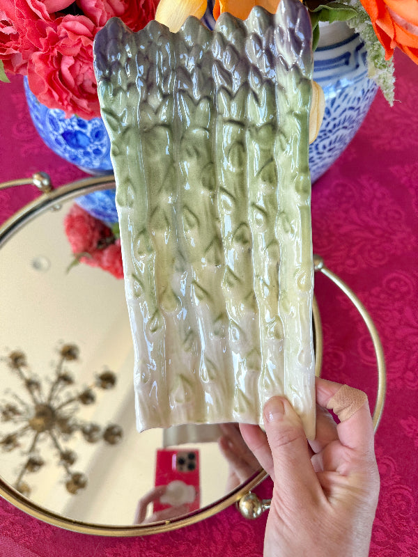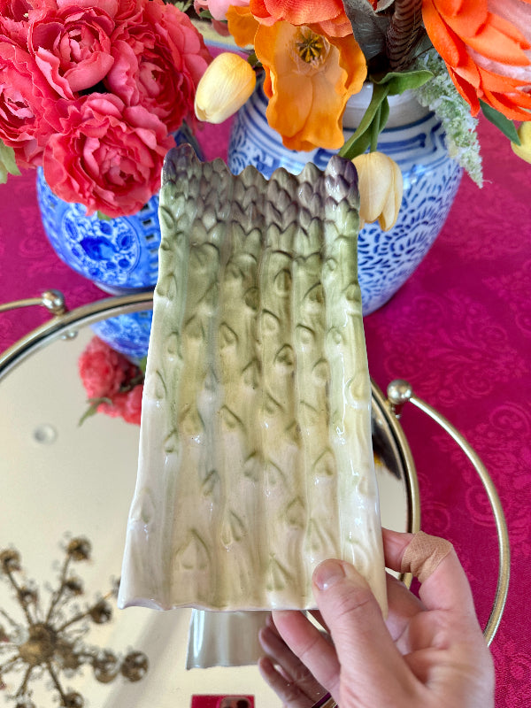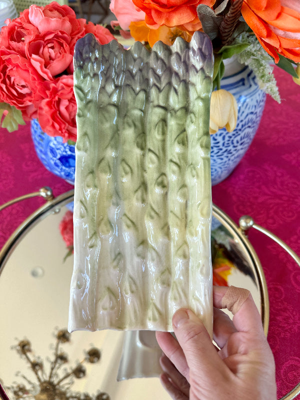 Serve your roasted asparagus spears on this fun dish. A pretty ceramic dish designed to look like real asparagus. These dishes are really popular for a Spring table setting. Also a great size for a snack plate. Made by Cardinal and in great vintage condition, no chips or cracks.