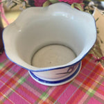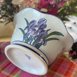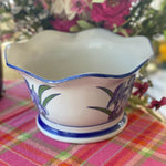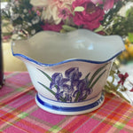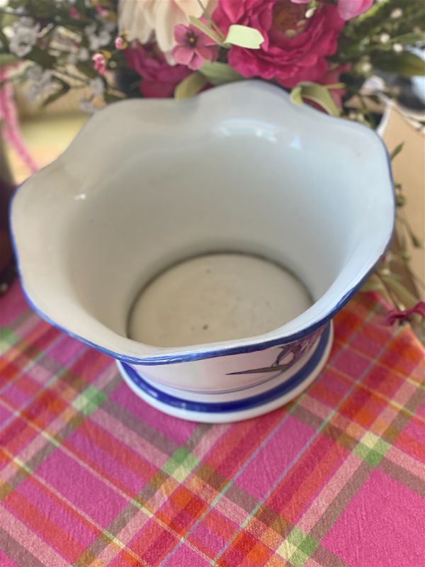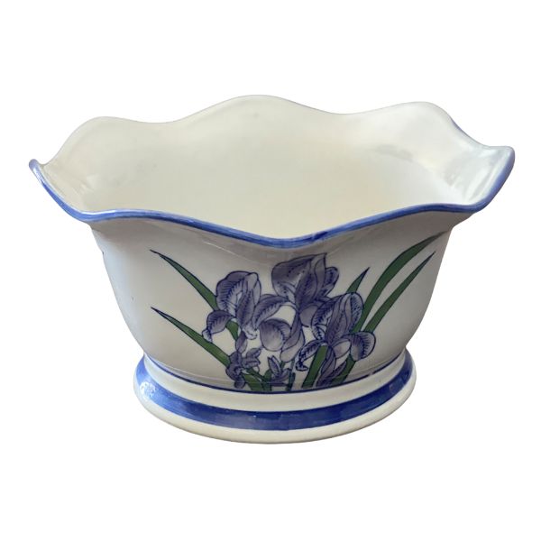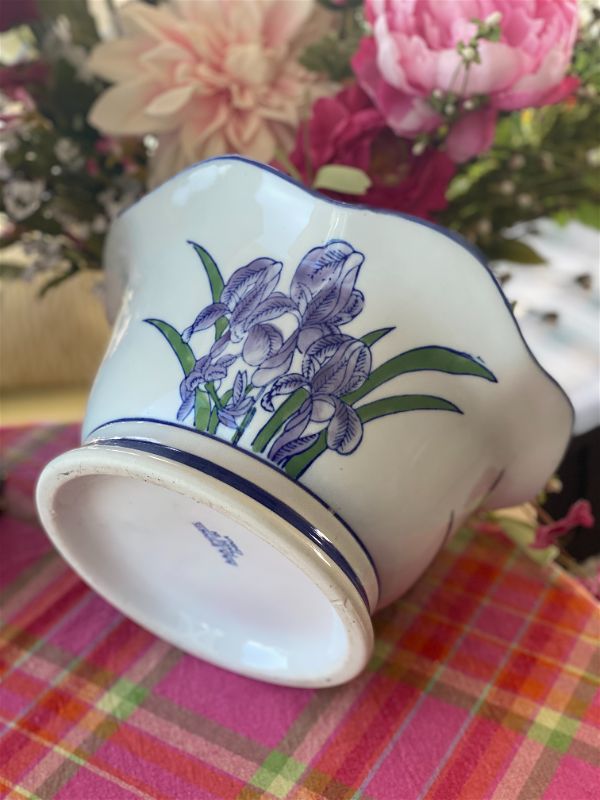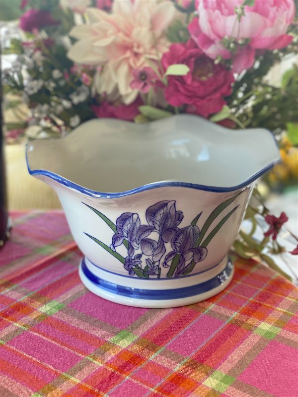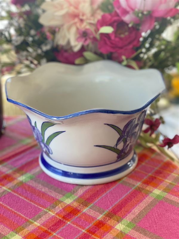 Vintage Blue and White Porcelain Planter bowl with purple iris detail. Hand painted and great for a larger size plant or orchid. Add fillers like ornaments, carpet balls, pinecones, Easter eggs and use all year round. Fluted edging with the classic blue and white coloring. Perfect on a porch, patio, coffee table or kitchen island filled with fruit. See picture details as they are part of the description.