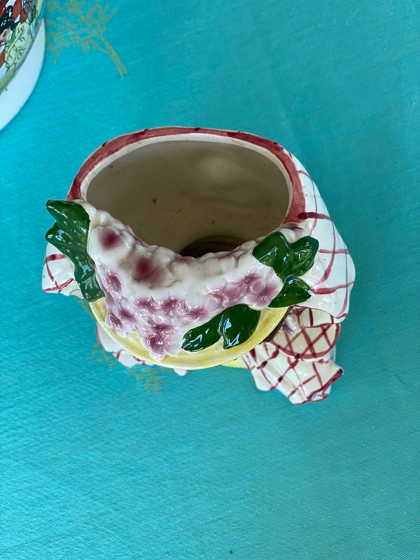 This sweet lady with her floral adorned bonnet and bow is the perfect piece to plant herbs or succulents. These are highly collectible and rare. She is most likely from the 1940s and I can imagine she has seen some things. Add her to a kitchen window sill, outdoor space or porch for a fun Summertime display. She will go well with a collection of lady heads or may inspire you to start your own collection. Some small flaws.