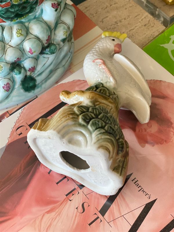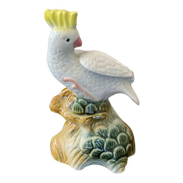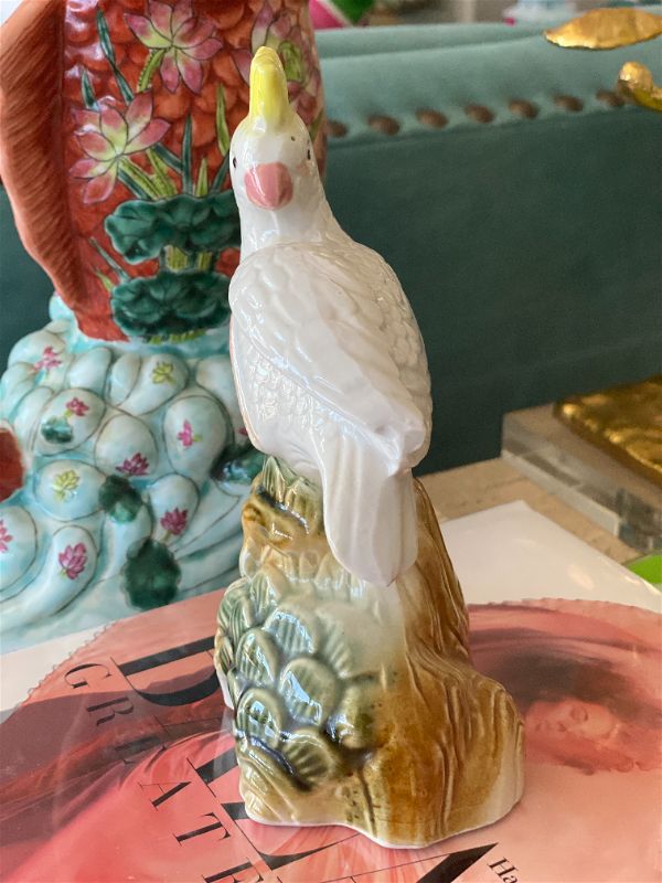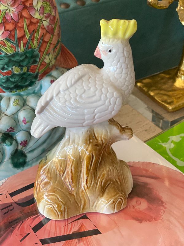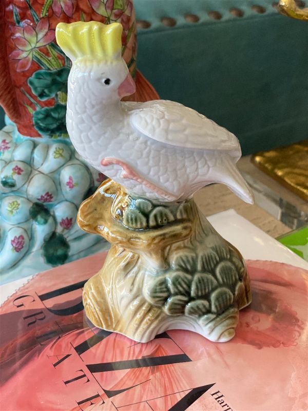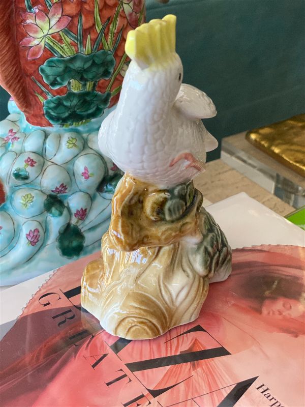 Are vintage bird figurines your weakness? This sweet parakeet with yellow comb of feathers on its head is such a fun piece. Adding figurines to your bookshelves or tabletops adds a touch of detail and whimsy to a space. This beauty is perched on a tree stump with leaves. Delicate hand painted porcelain. Mid Century Modern find. In great vintage condition. See picture details as they are part of the description.