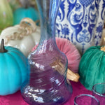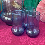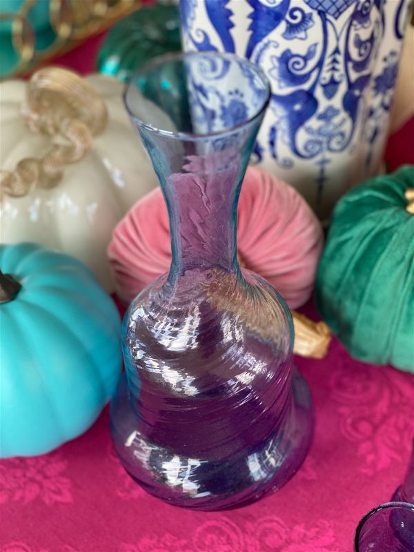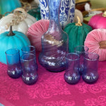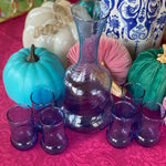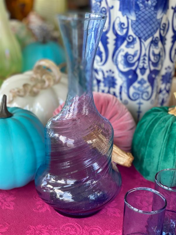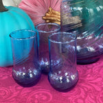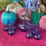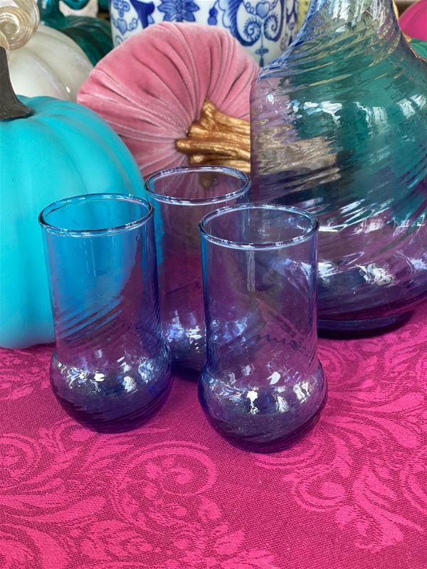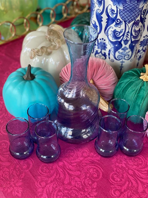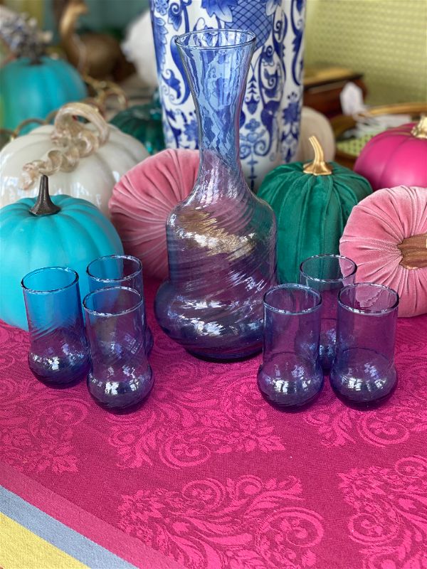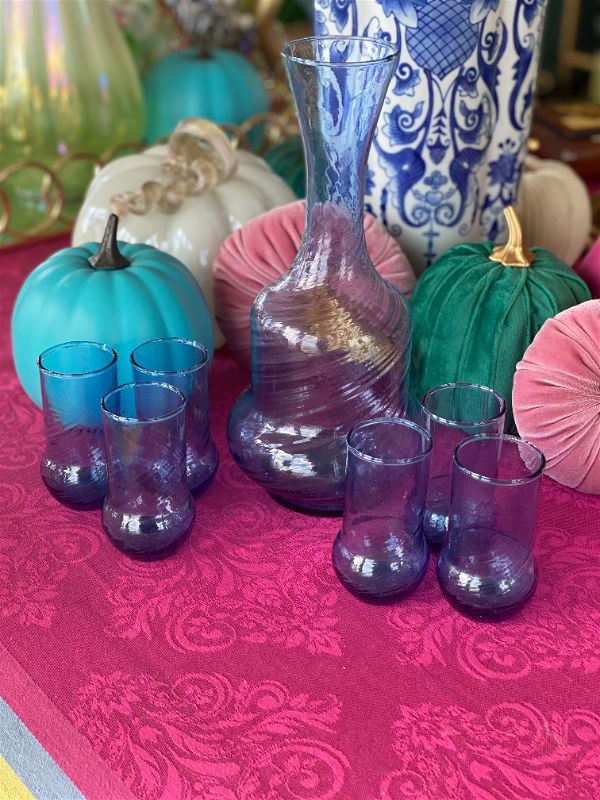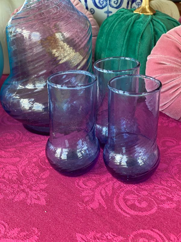 This is a fine vintage decanter set that will add color and Mid Century Modern style to your bar decor. Great for service wine, a mixed signature cocktail, juice, tea or water. A light weight hand blown glass set. The tumblers feel great in your hand. Beautiful light blue italian glass. See picture details as they are part of the description.