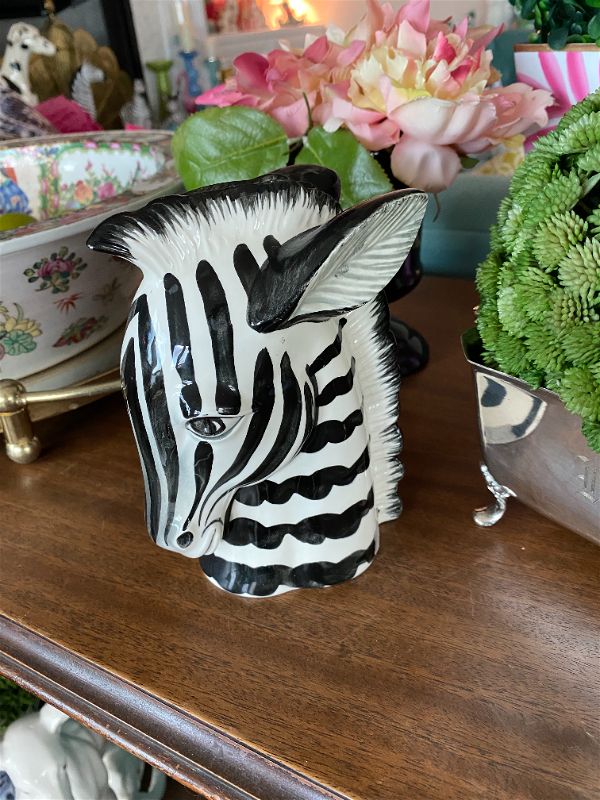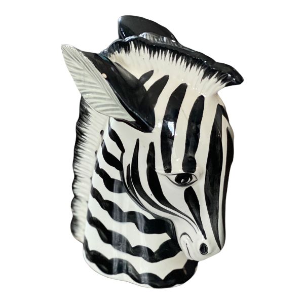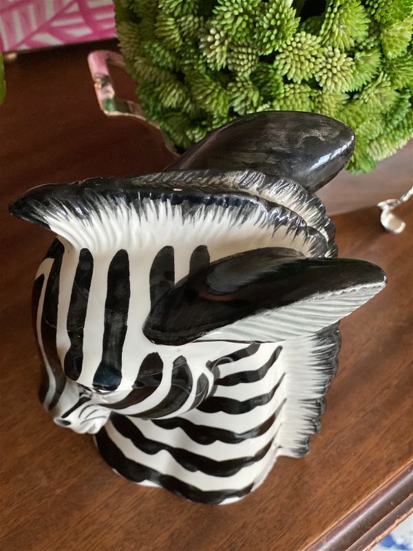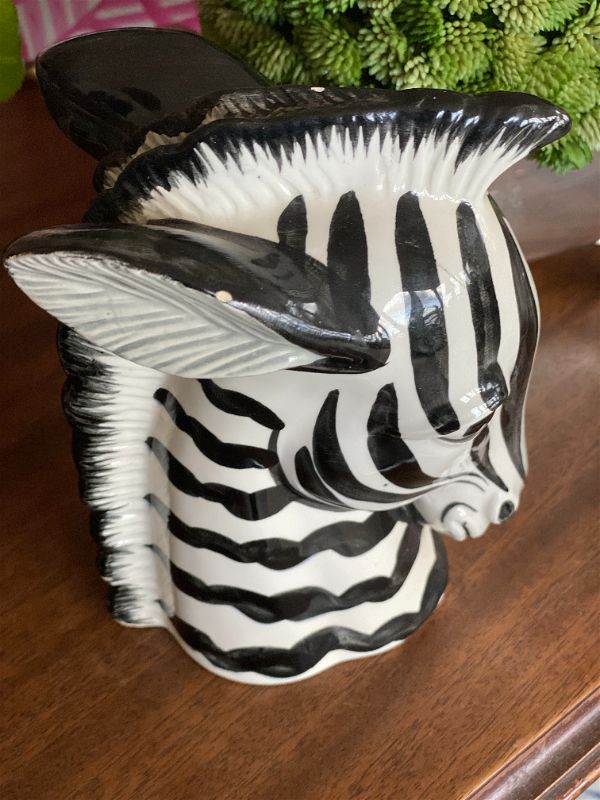 Fun Zebra figurine by Fitz and Floyd. Hand painted, ceramic material. Nice weight and a collectible item. Works well as a bookend on a shelf. Bold black and white accent perfect for most any decor. A couple of micro chips. See picture details as they are part of the description.