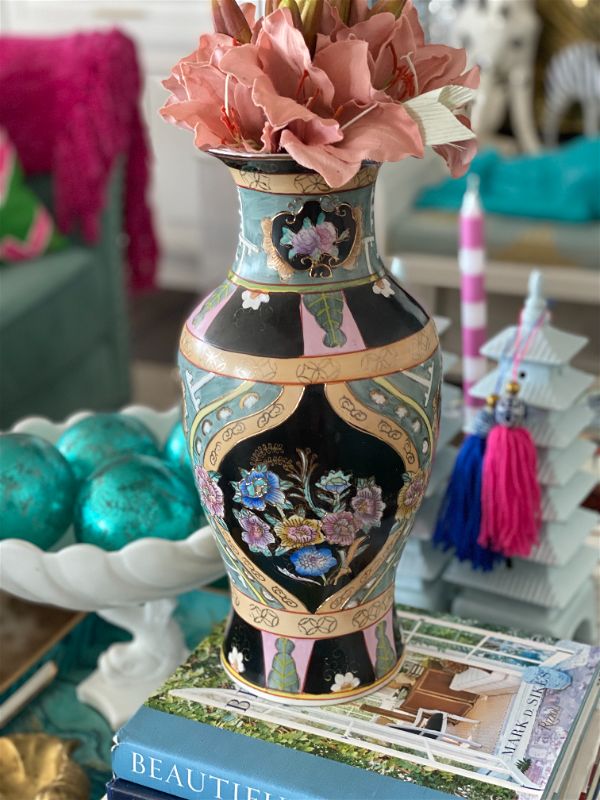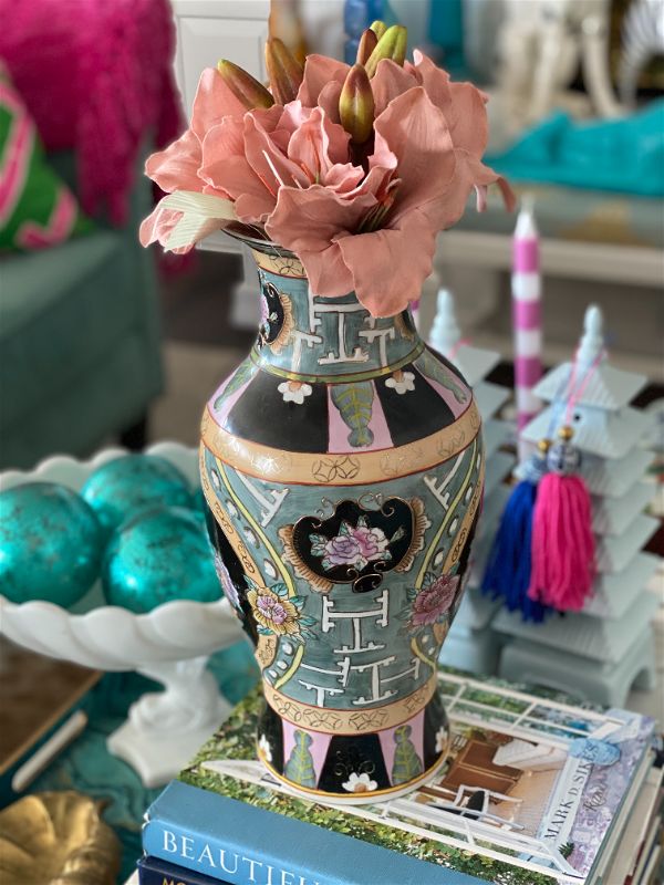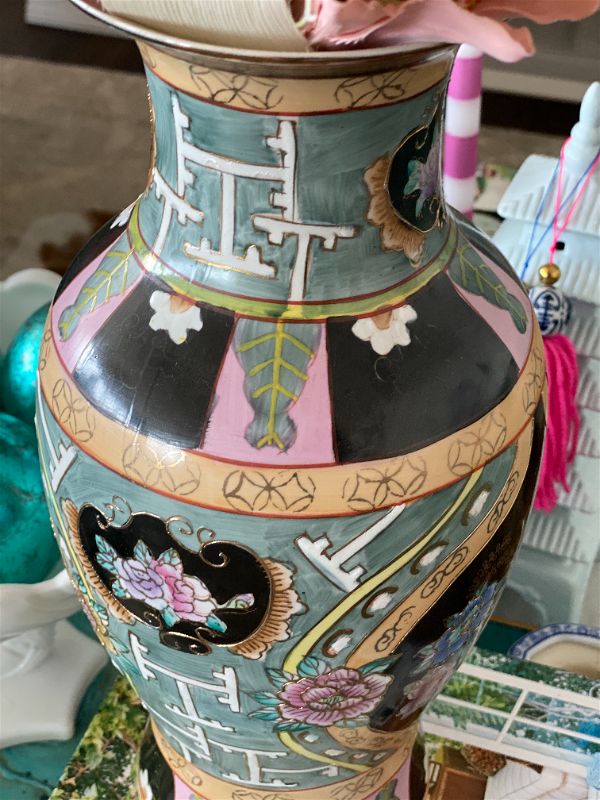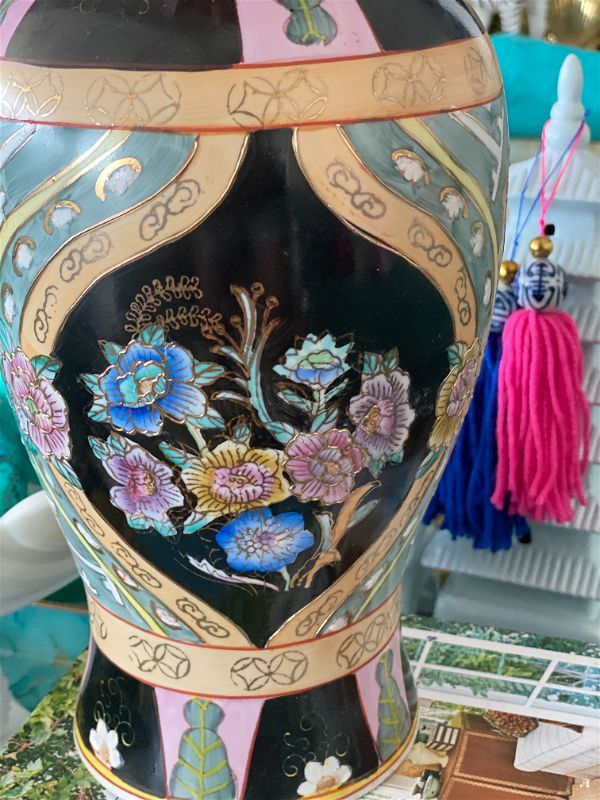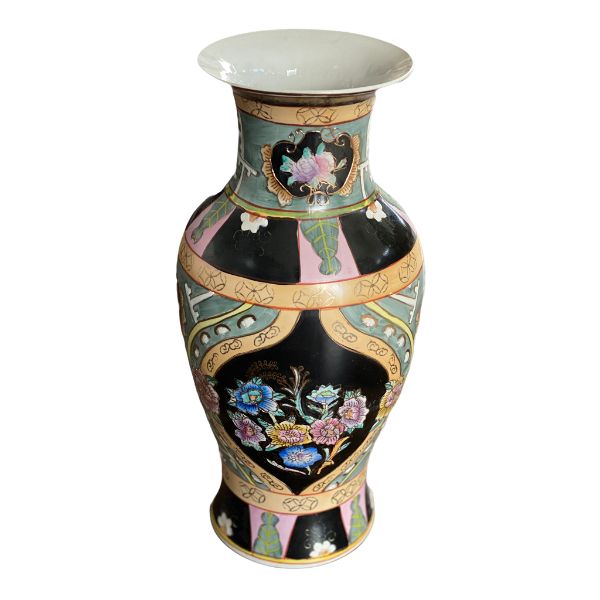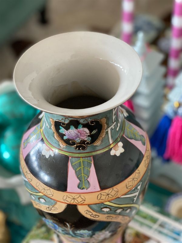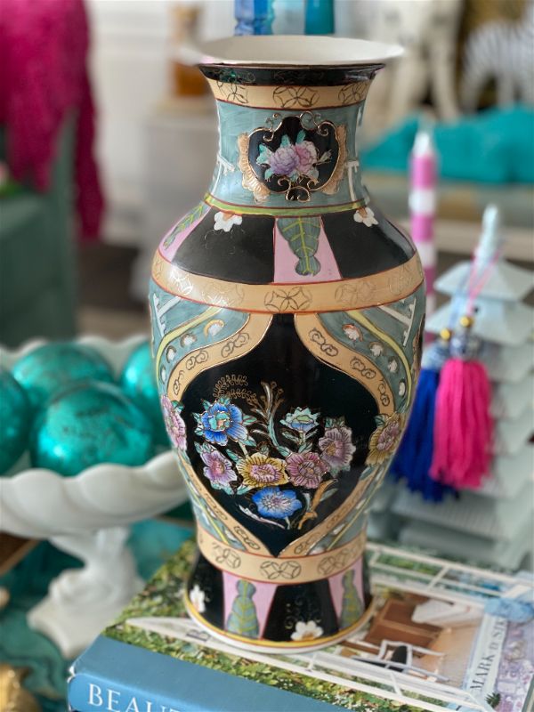 Unique, rare colorful asian vase. Black background with green, pink and peach details ad gold accents. Floral motif. Great vintage condition no chips or cracks.. A nice size for a kitchen table centerpiece, Coffee table accent. Fill with flowers, greenery, or display on it's own. See picture details as they are part of the description.