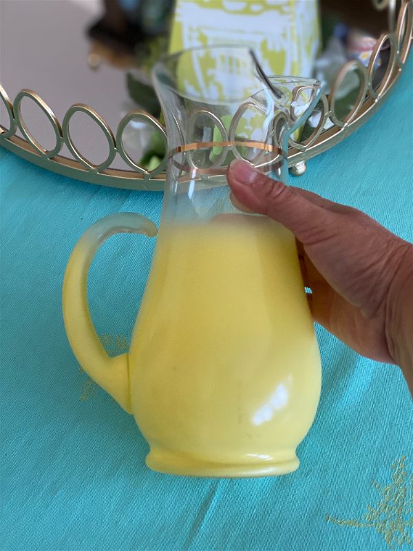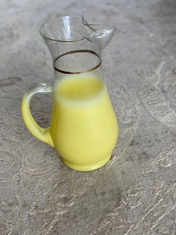 Blendo Faded yellow pitcher with gold accent. An art deco, mid century modern style. Amazing vintage condition. Mix and match with other Blendo frosted glass serving pieces. Use as a flower vase. Serve cold drinks like lemonade, tea or ice water. Add to your barcart for a pop of color. Rare and highly collectible find. See picture details as they are part of the description.