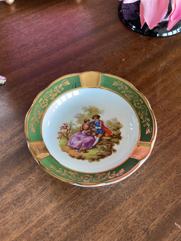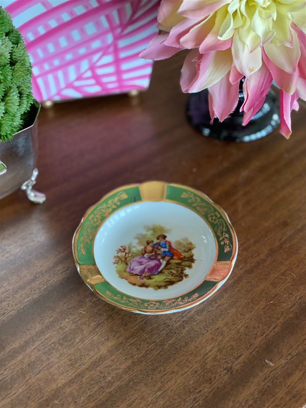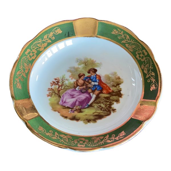 Vintage Green and Gold Ashtray, Limoge, France, Courting Scene