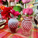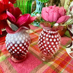 Fenton glass is highly collectible! It comes in so many different shapes, textures, colors and sizes. These are the cranberry glass color with the hobnail (bumpy) pattern. Each in amazing vintage condition and ready to hold flowers on your night stand, straws or stirrers on your bar or to display on their own.
