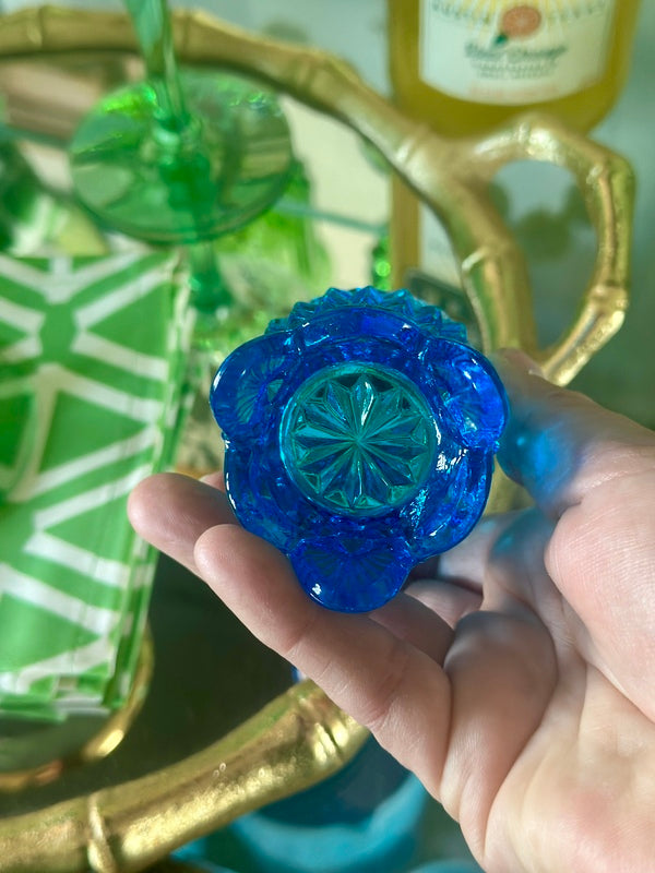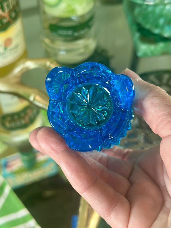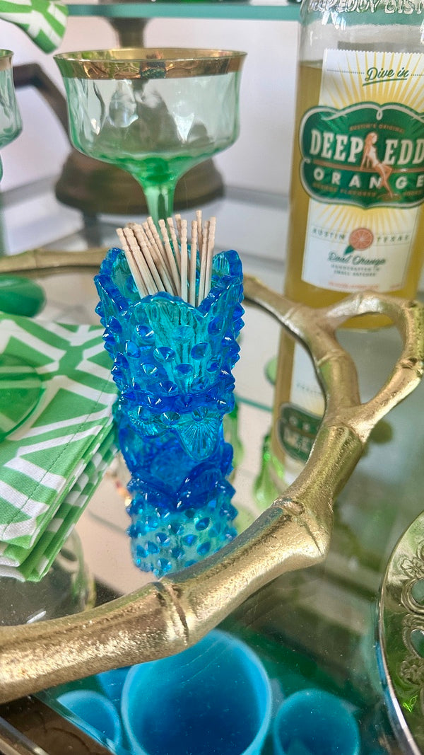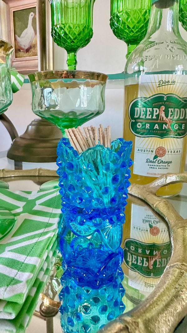 This stunning Fenton Hobnail Toothpick Holder in beautiful blue glass showcases classic craftsmanship and intricate hobnail texture. Perfect for displaying on your tabletop or as a charming addition to any collection, this vintage piece adds a touch of elegance and color to your home décor. Perfect for holding matches, toothpicks or a candle. A timeless collectible from Fenton's renowned glassworks.